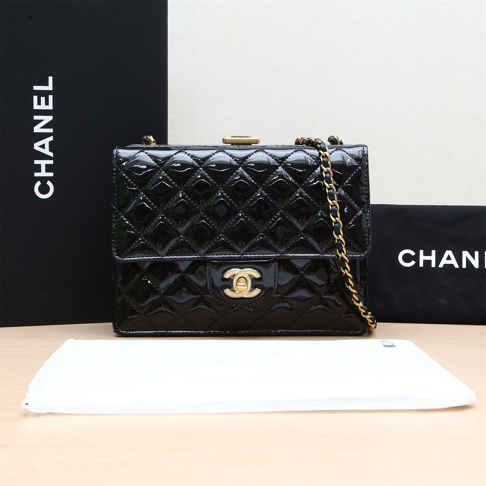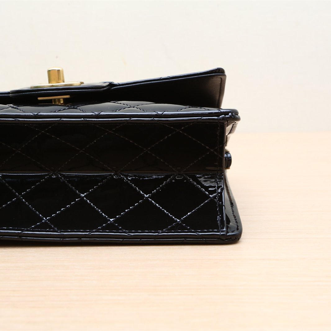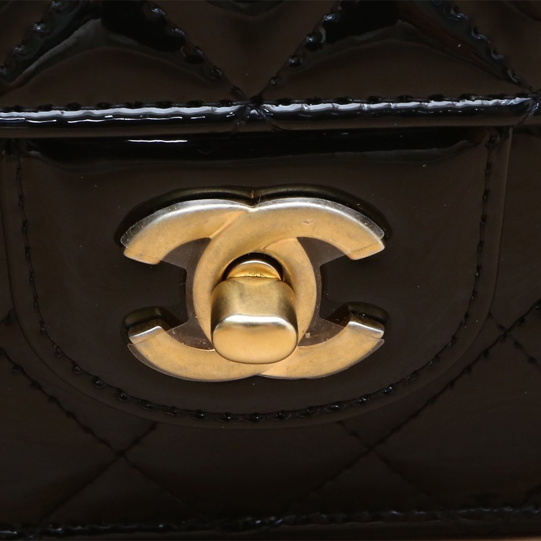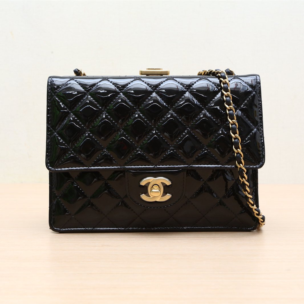 Crafted from glossy patent leather with iconic CC hardware, this structured flap bag features a chain strap and turn-lock closure.