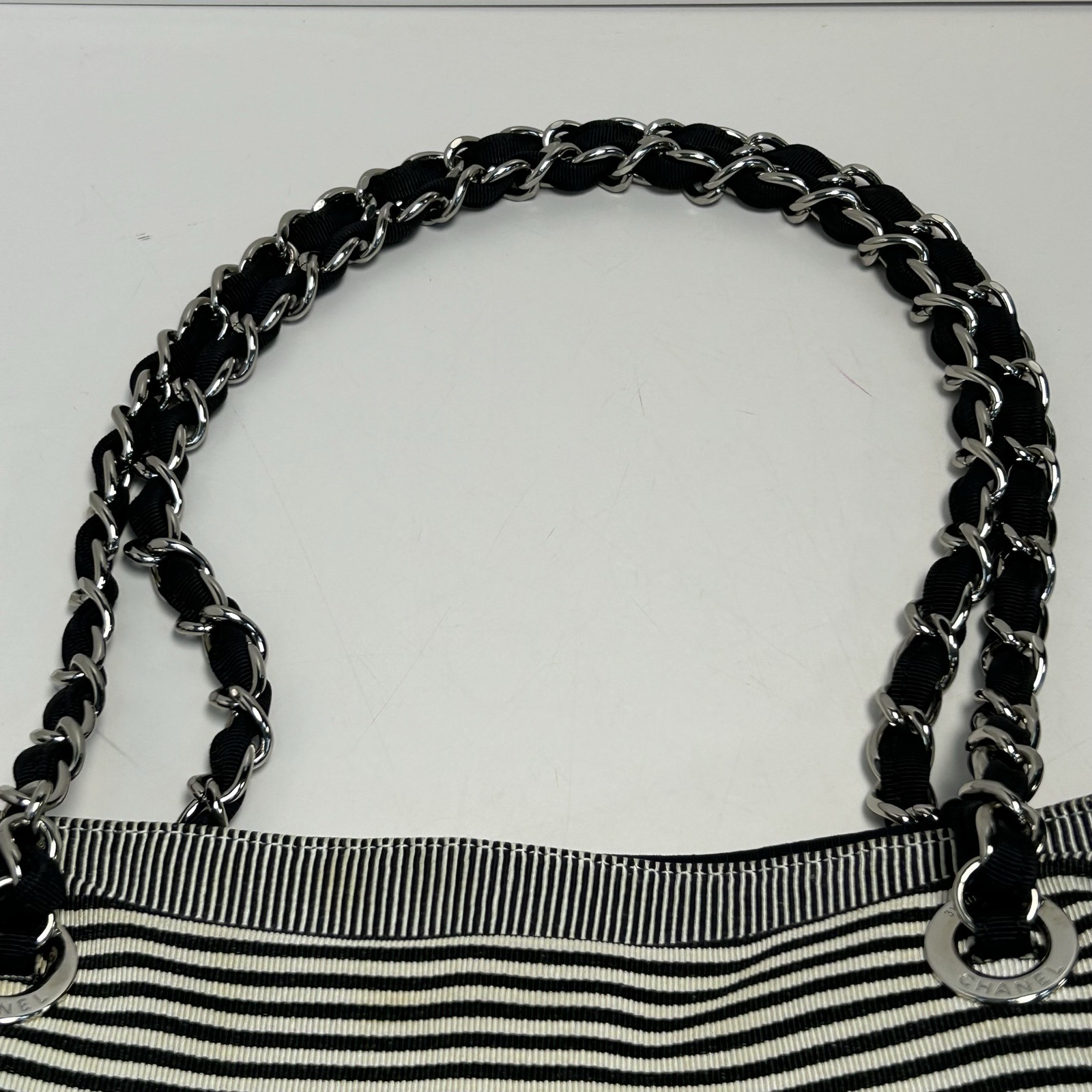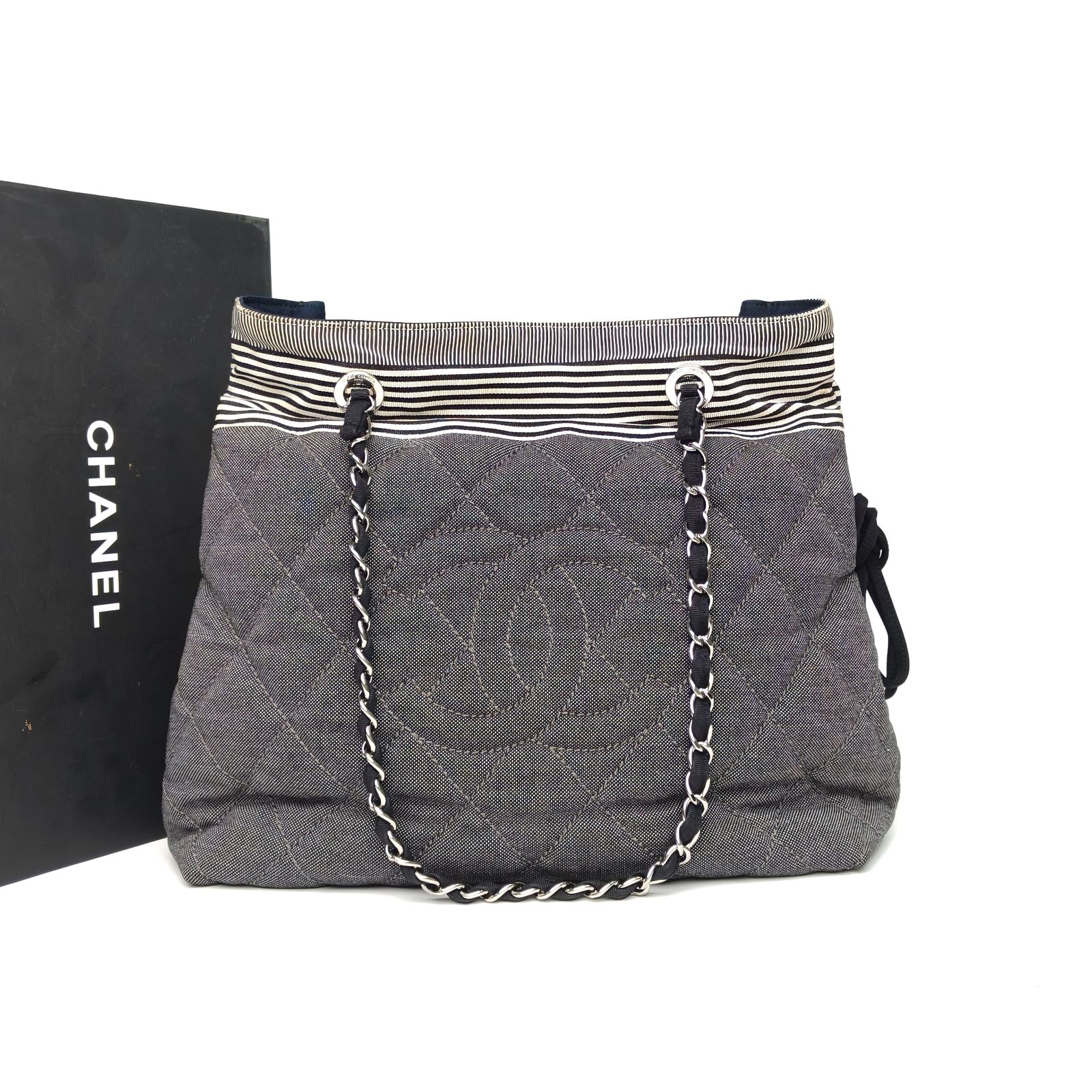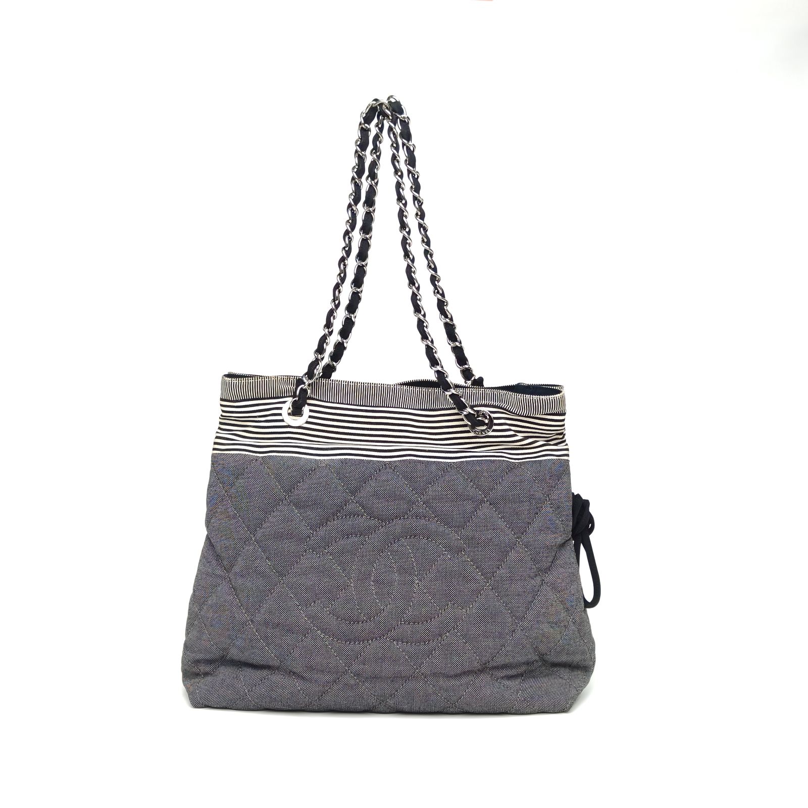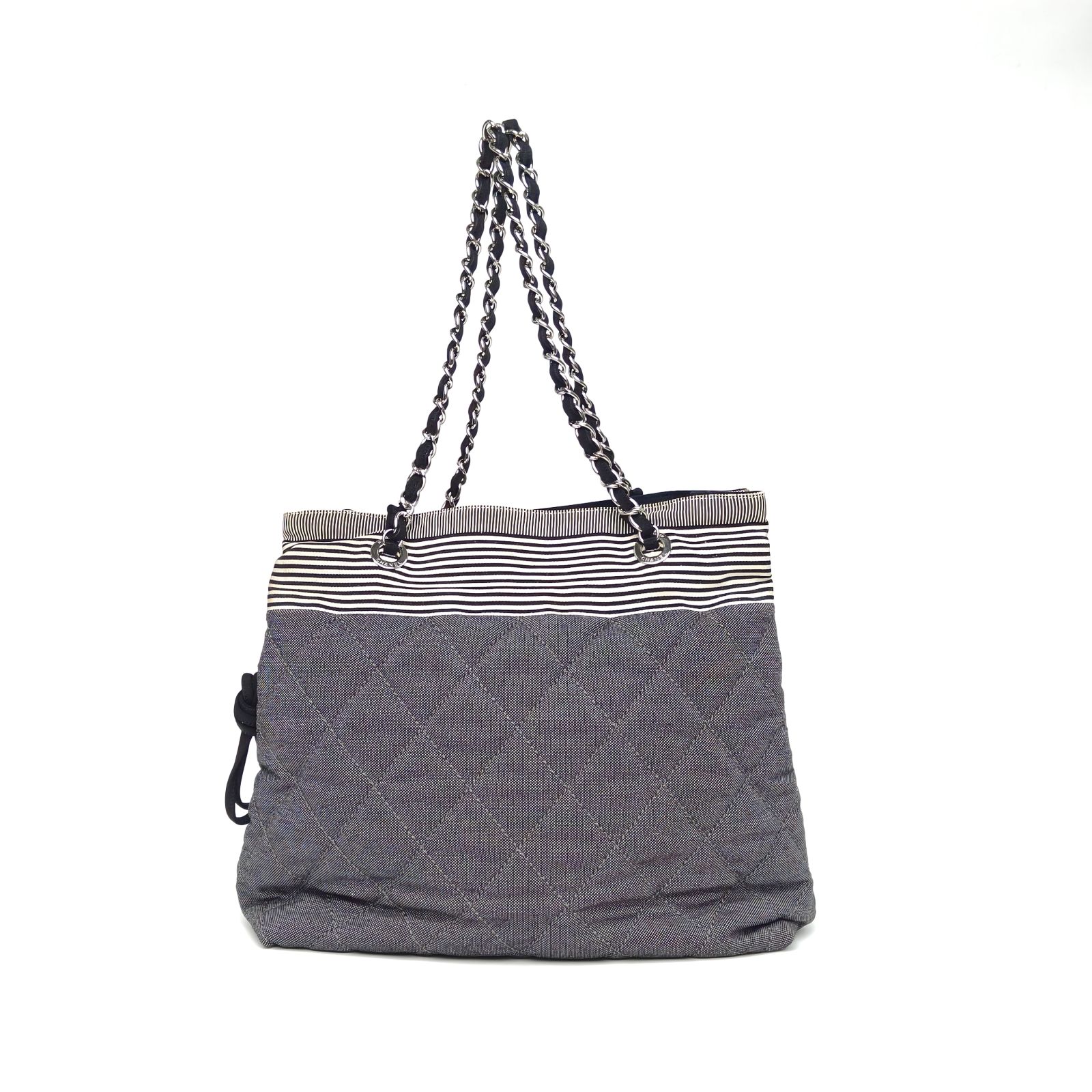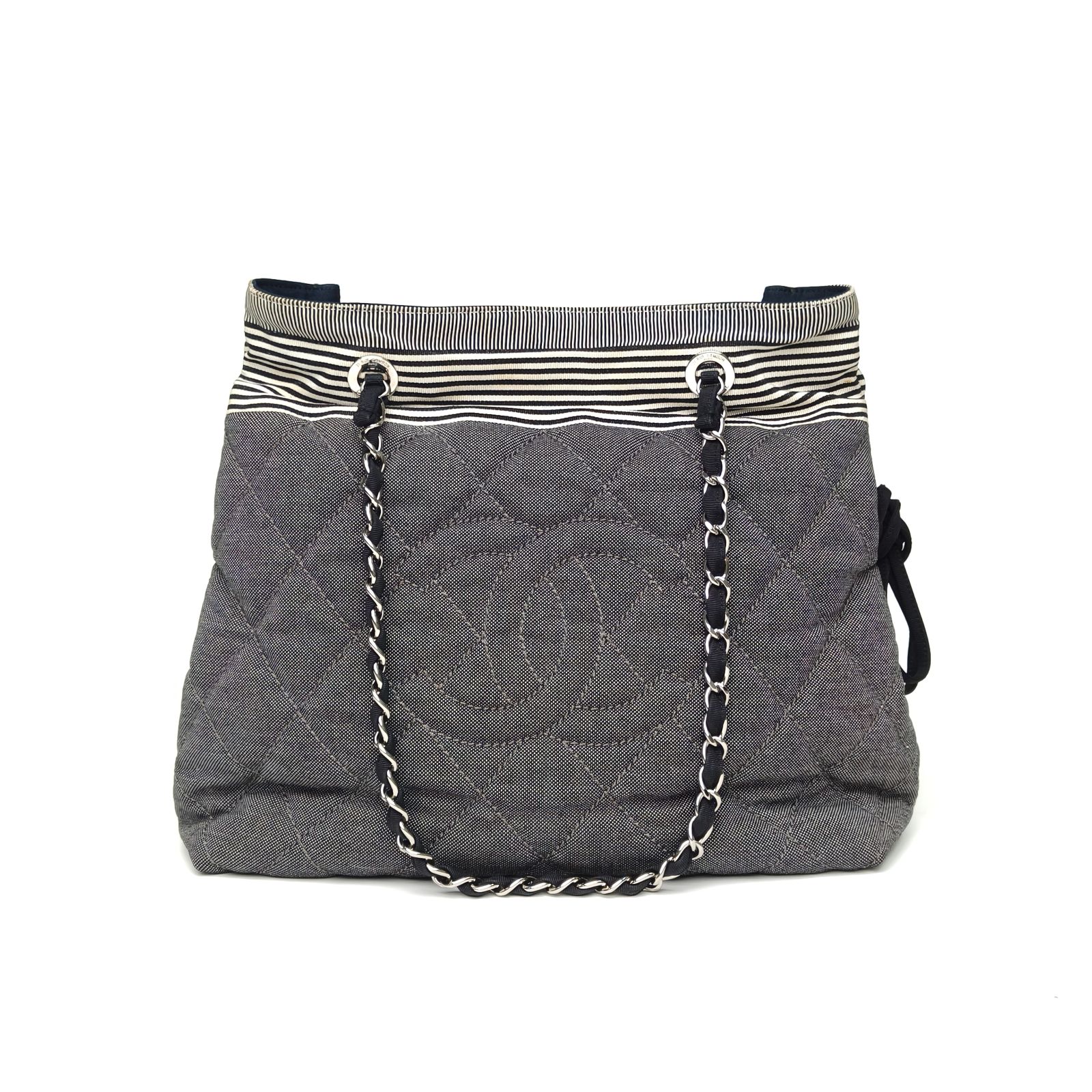 This Chanel Grand Shopping Tote 34cm is crafted from striped canvas with silver-tone hardware, featuring a spacious tote silhouette and chain straps.