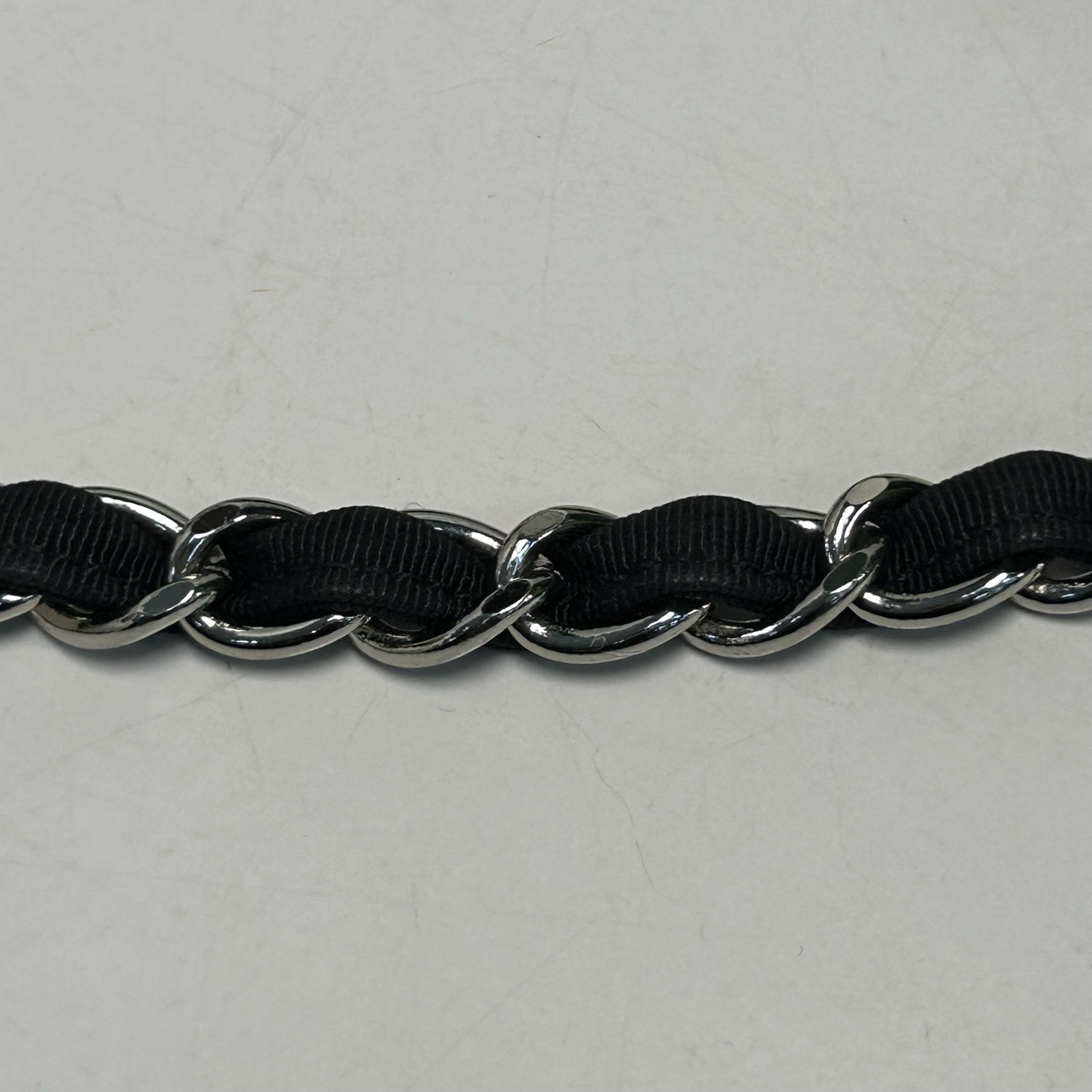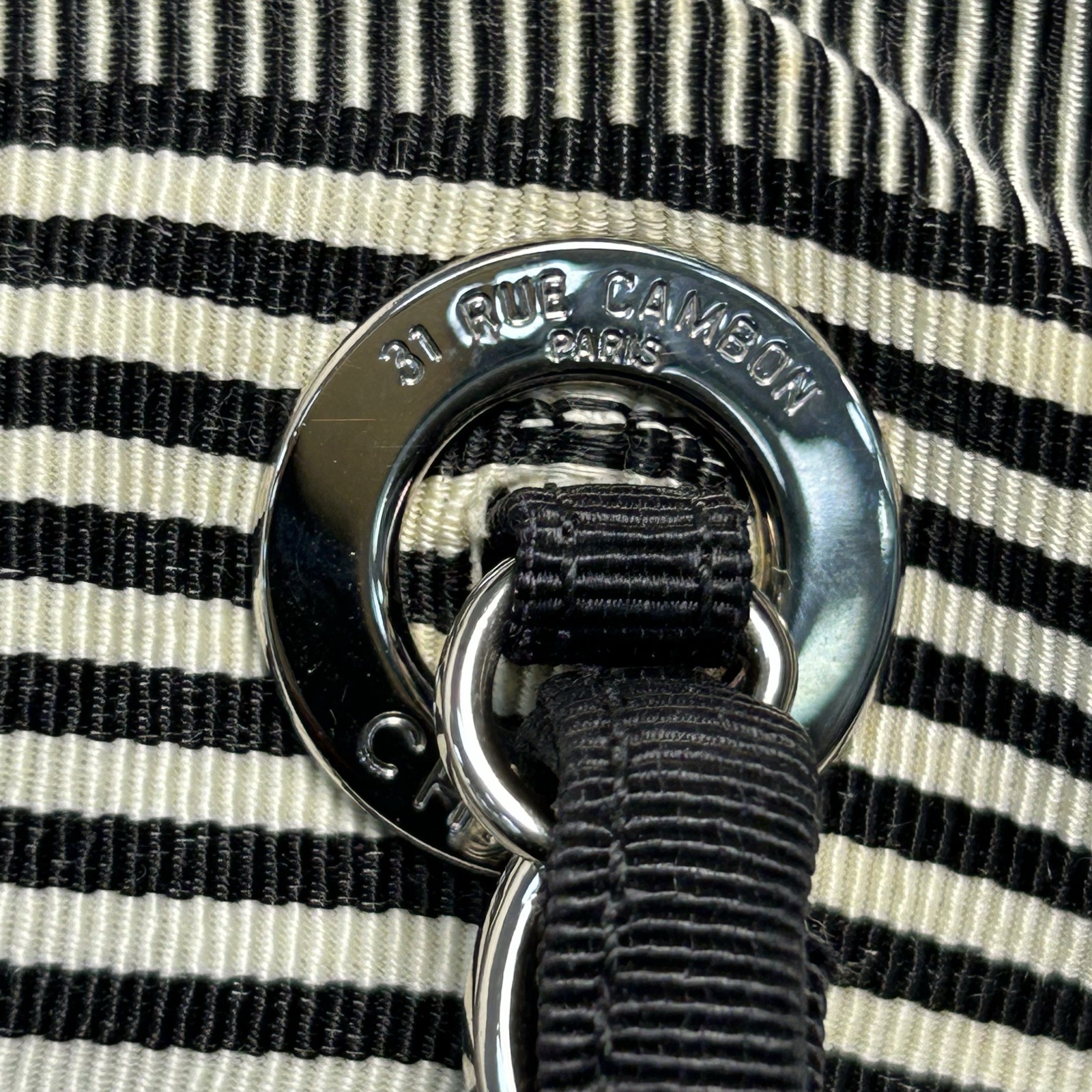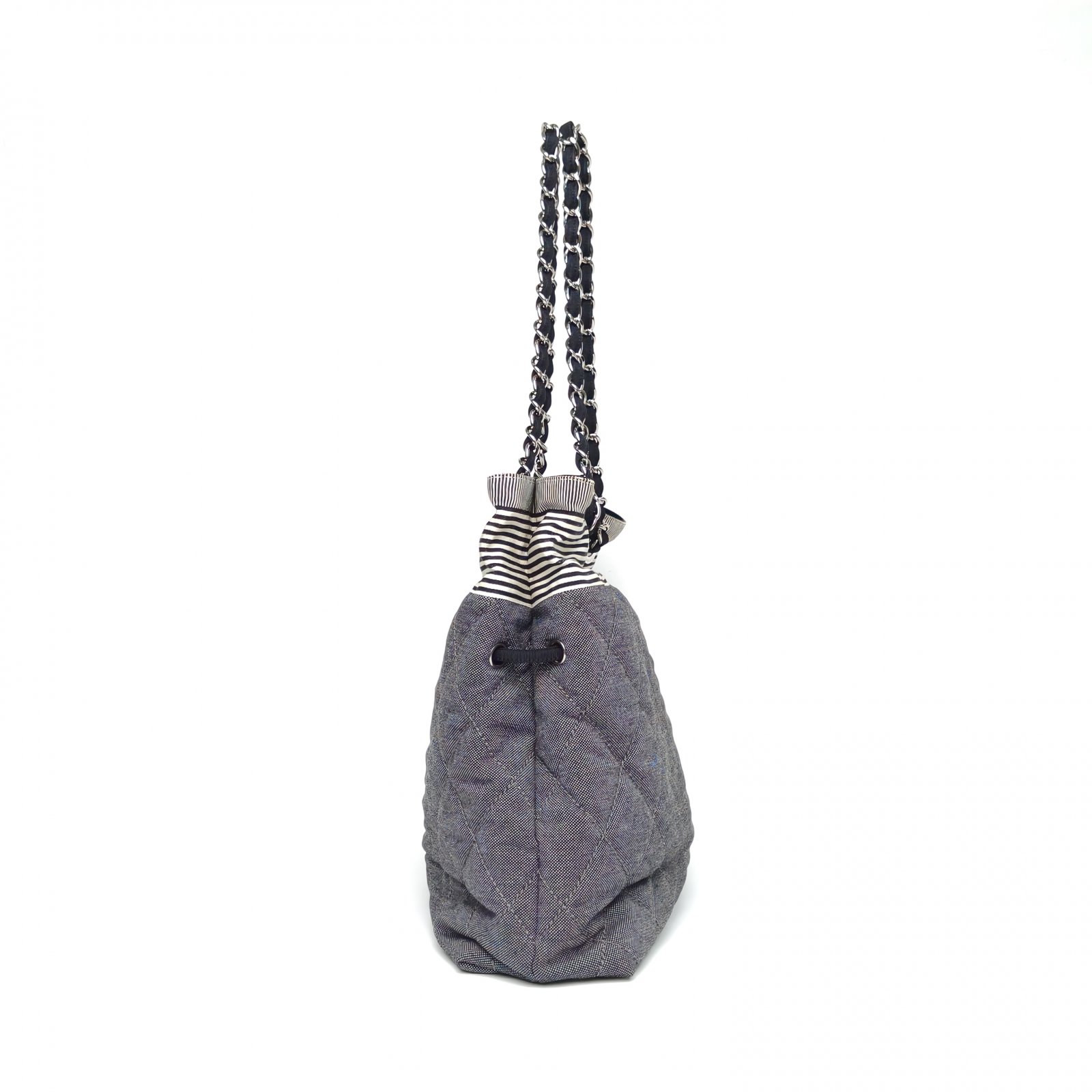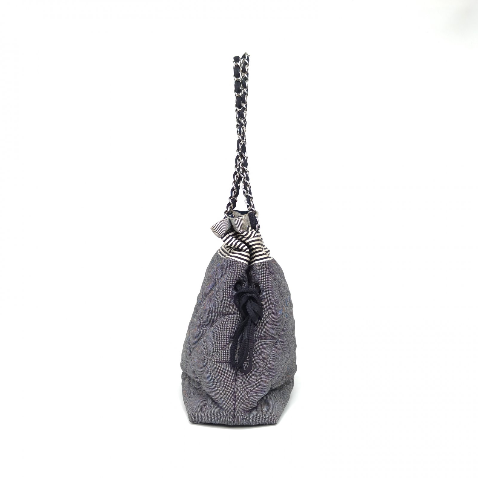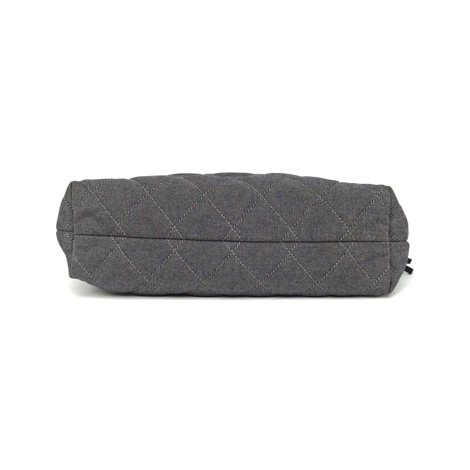 This Chanel Grand Shopping Tote 34cm is crafted from striped canvas with silver-tone hardware, featuring a spacious tote silhouette and chain straps.