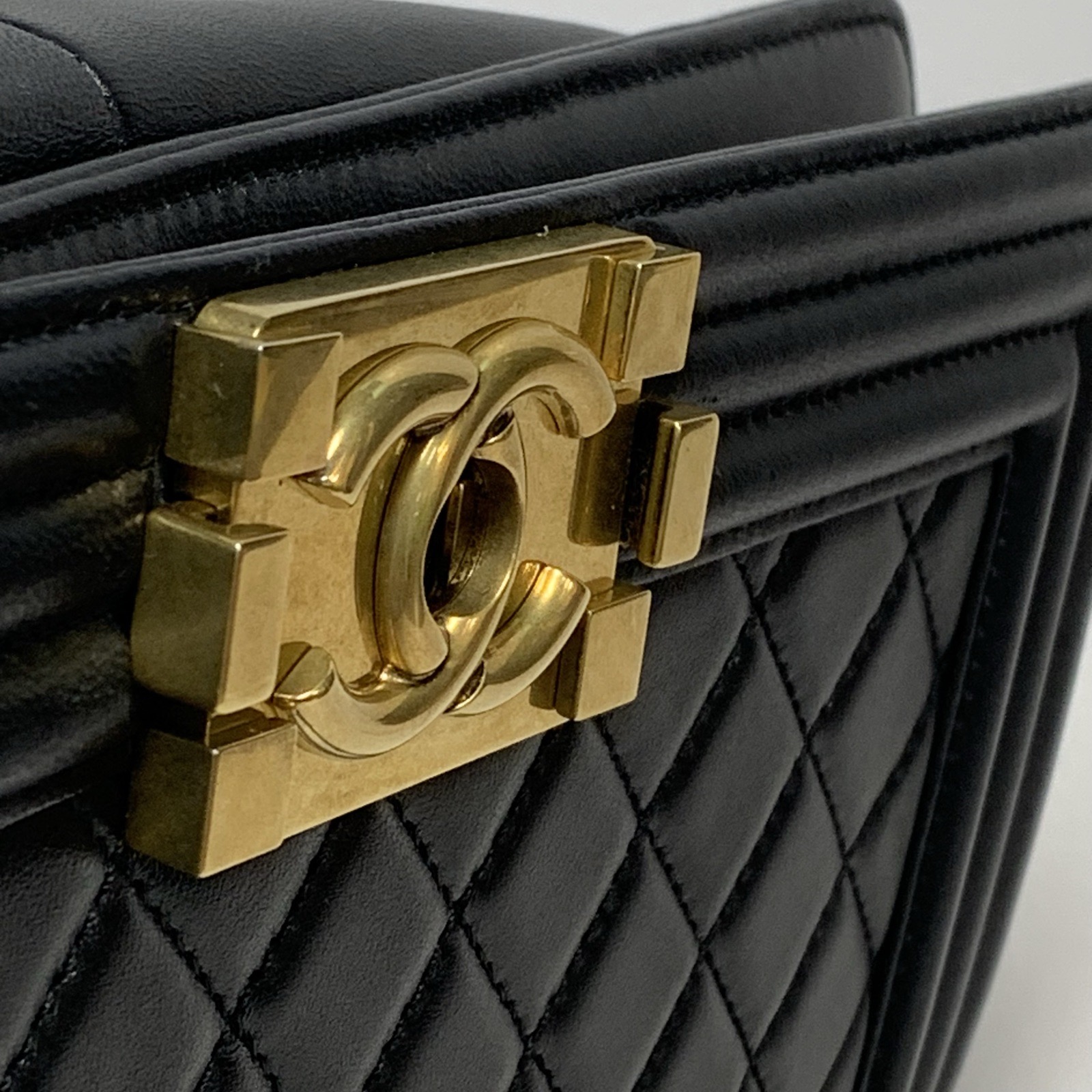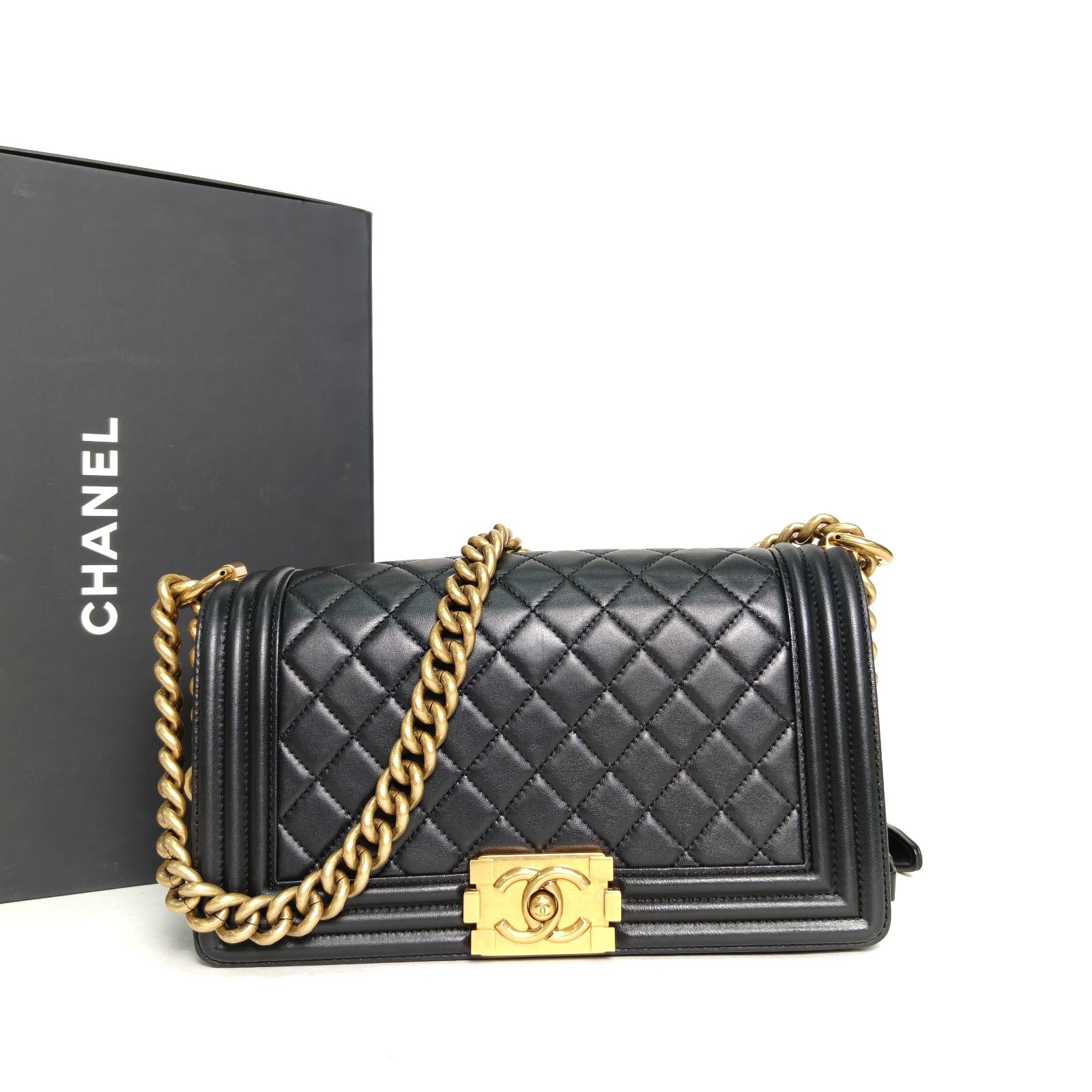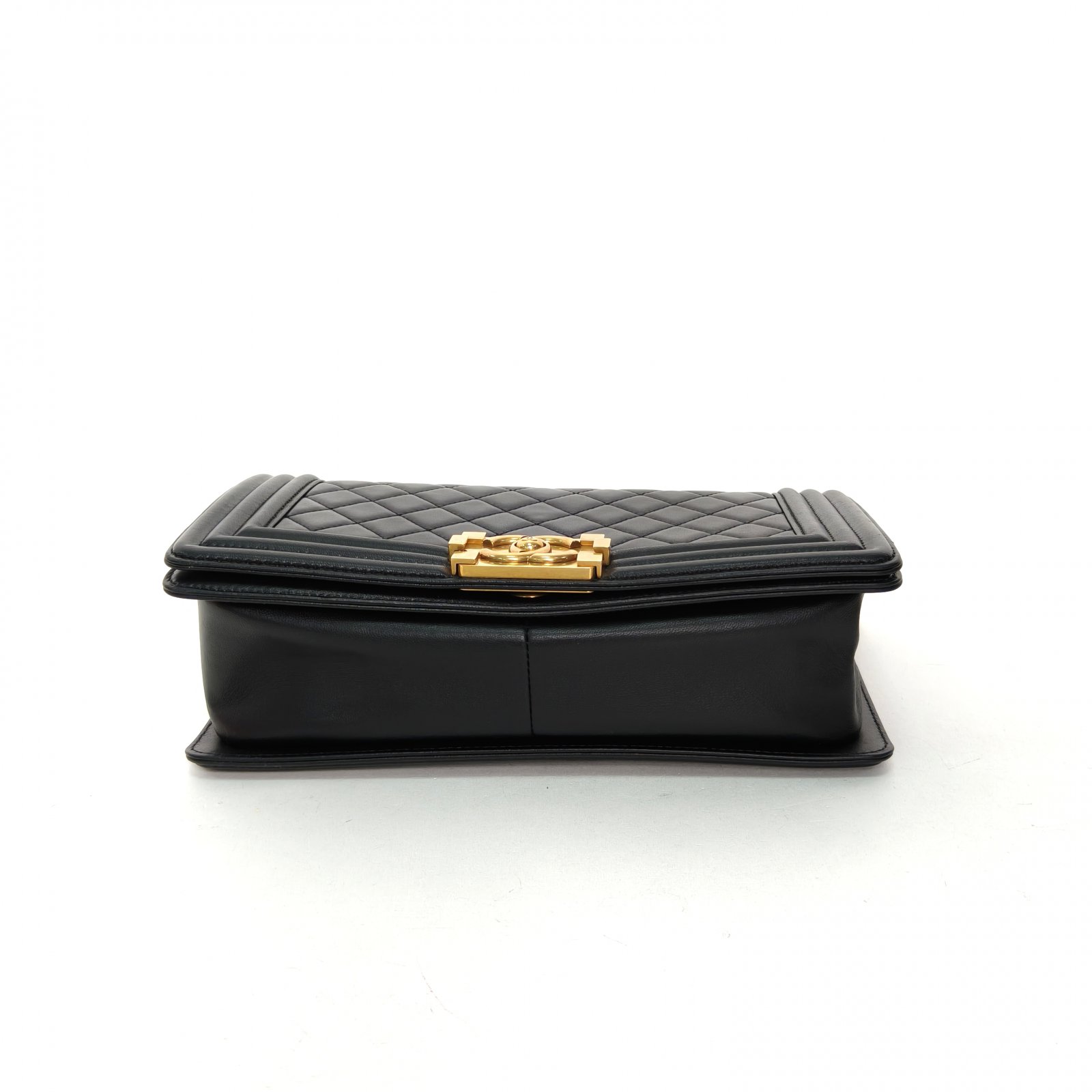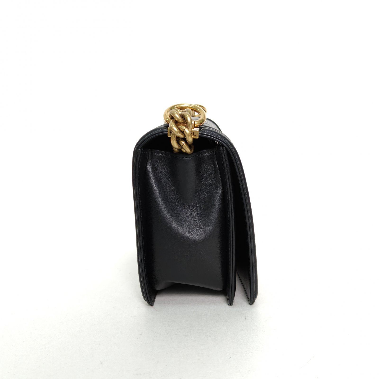 Made from black leather with quilted pattern and iconic Boy Chanel hardware, this medium Leboy features a chain strap and structured silhouette, embodying Chanel’s timeless, androgynous luxury.