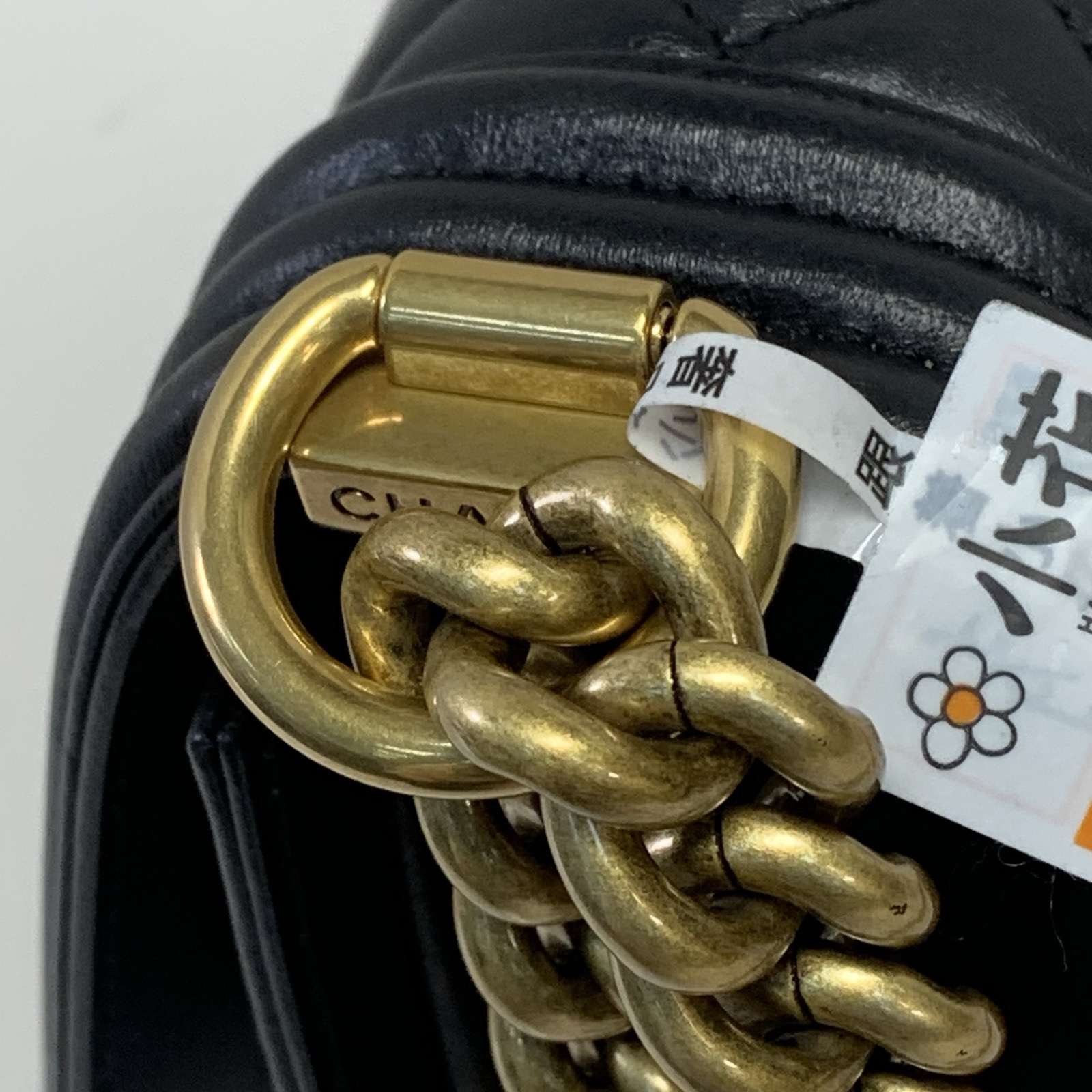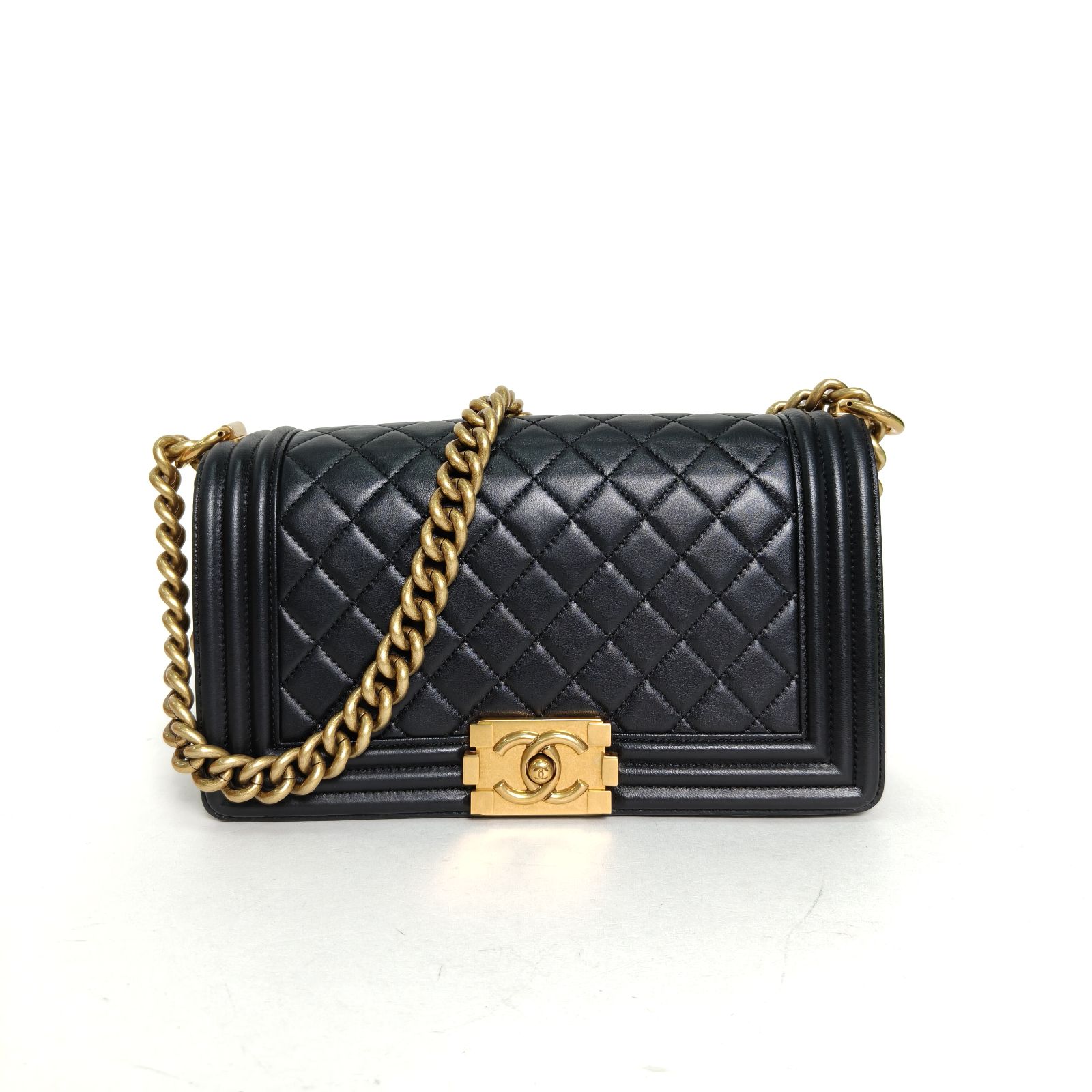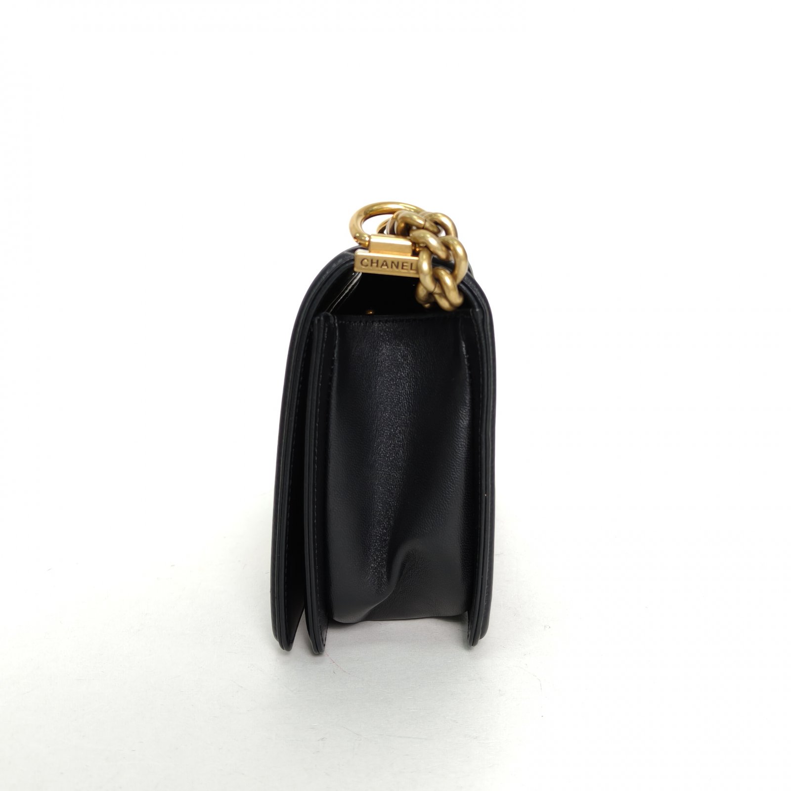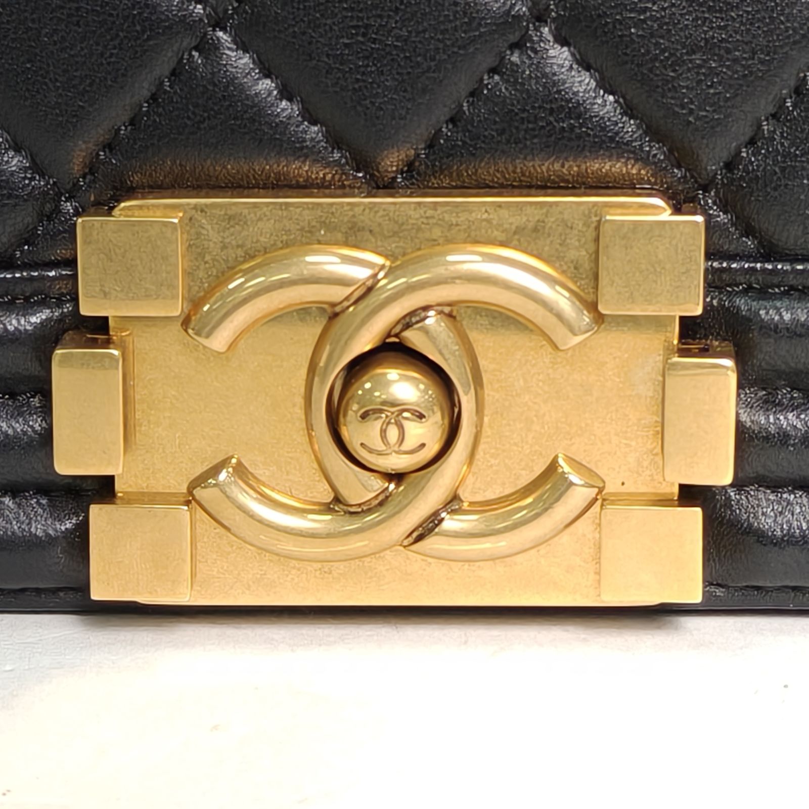 Made from black leather with quilted pattern and iconic Boy Chanel hardware, this medium Leboy features a chain strap and structured silhouette, embodying Chanel’s timeless, androgynous luxury.