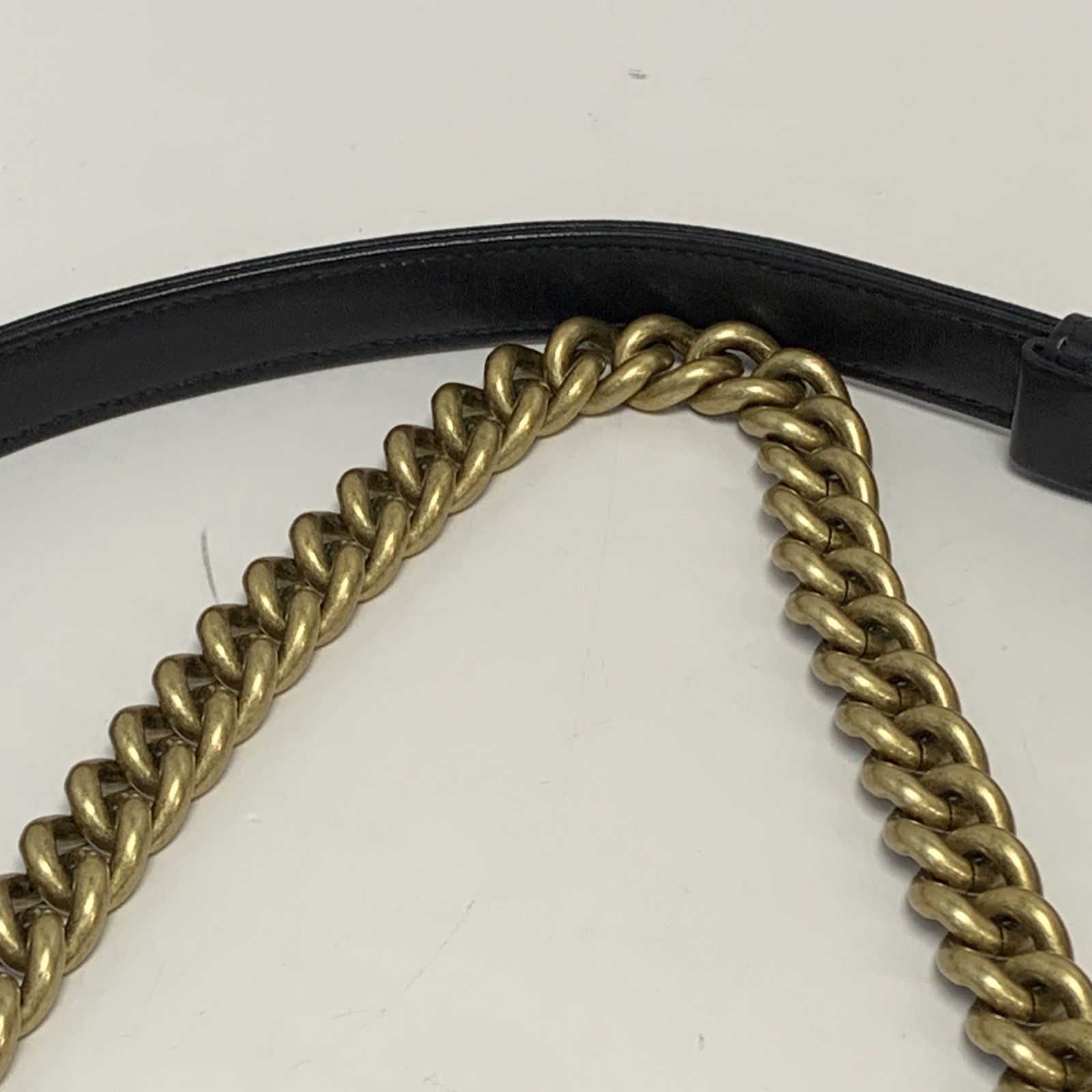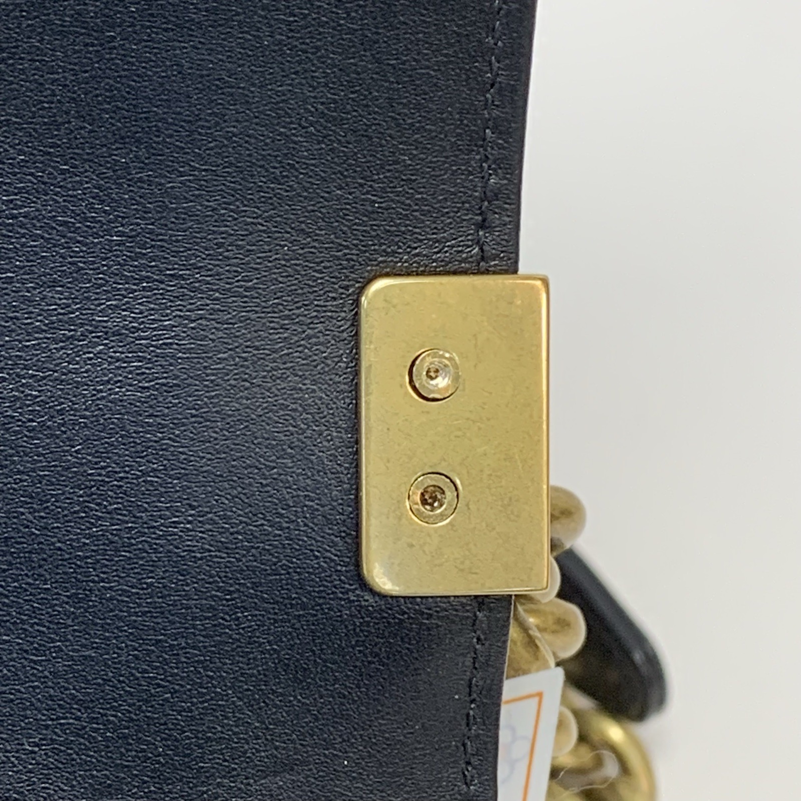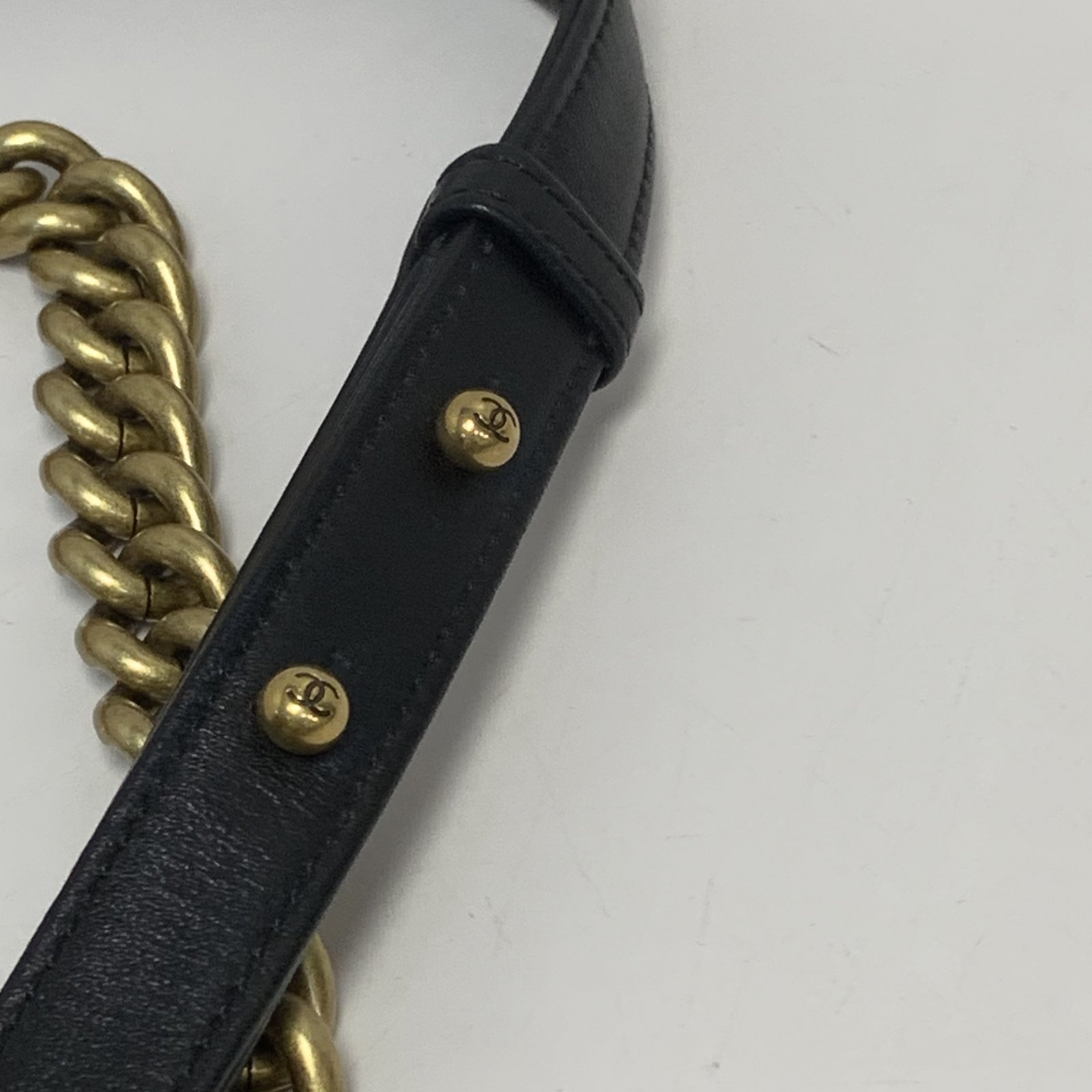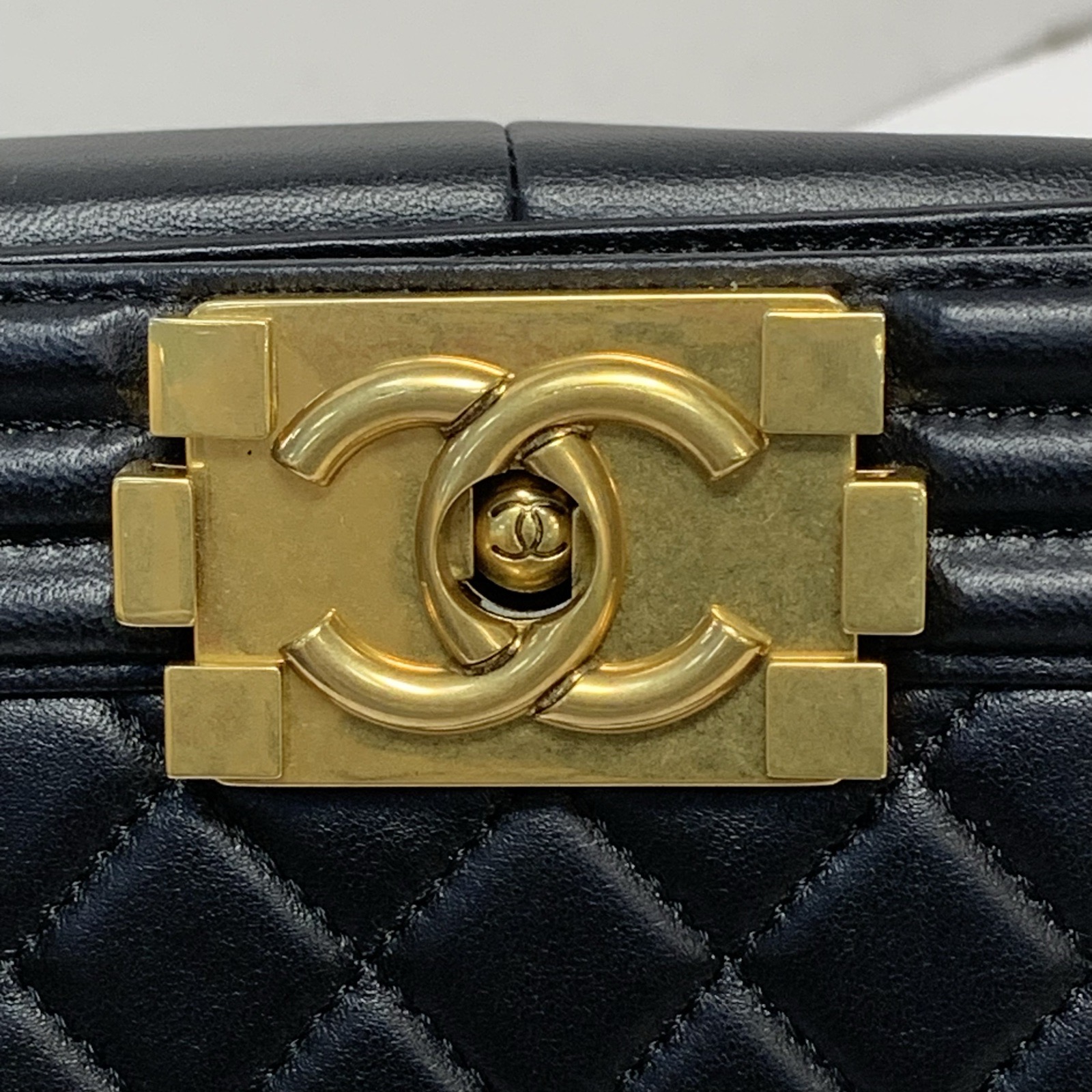 Made from black leather with quilted pattern and iconic Boy Chanel hardware, this medium Leboy features a chain strap and structured silhouette, embodying Chanel’s timeless, androgynous luxury.