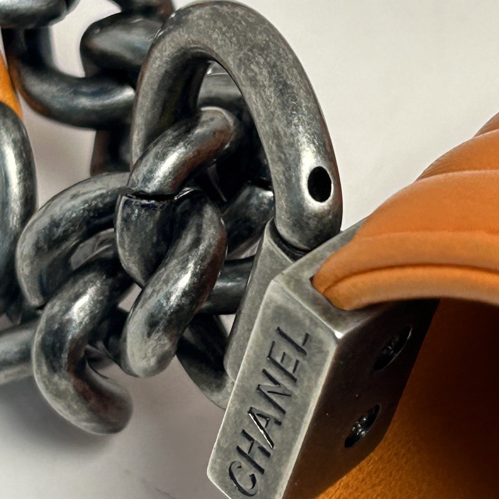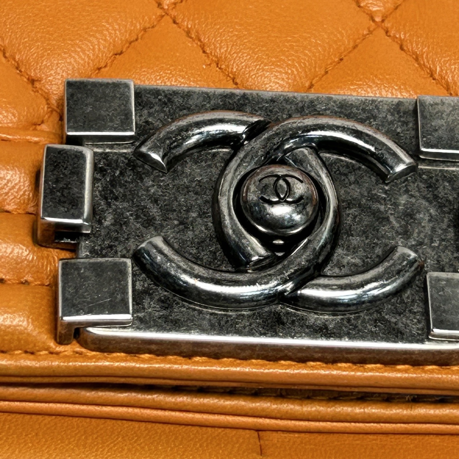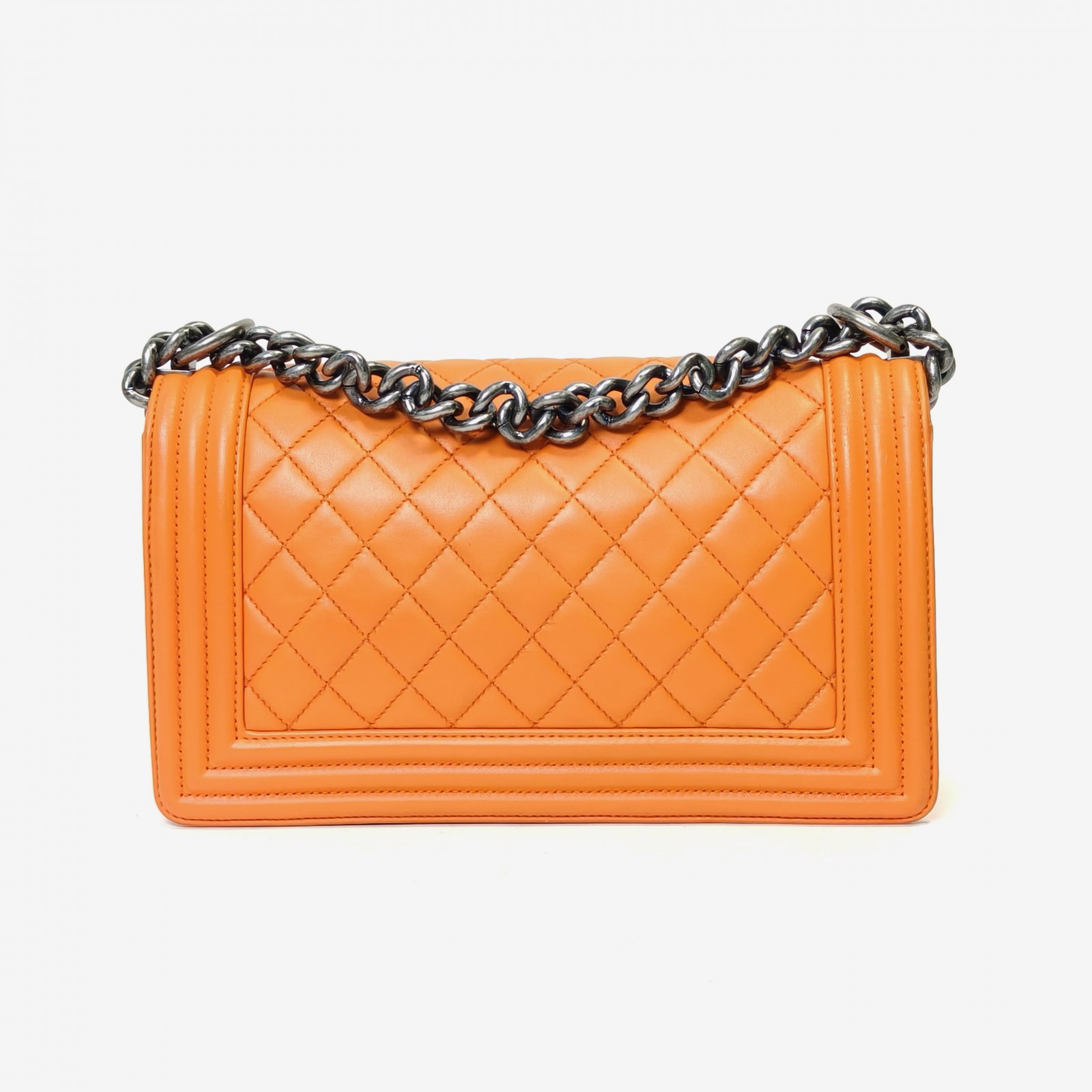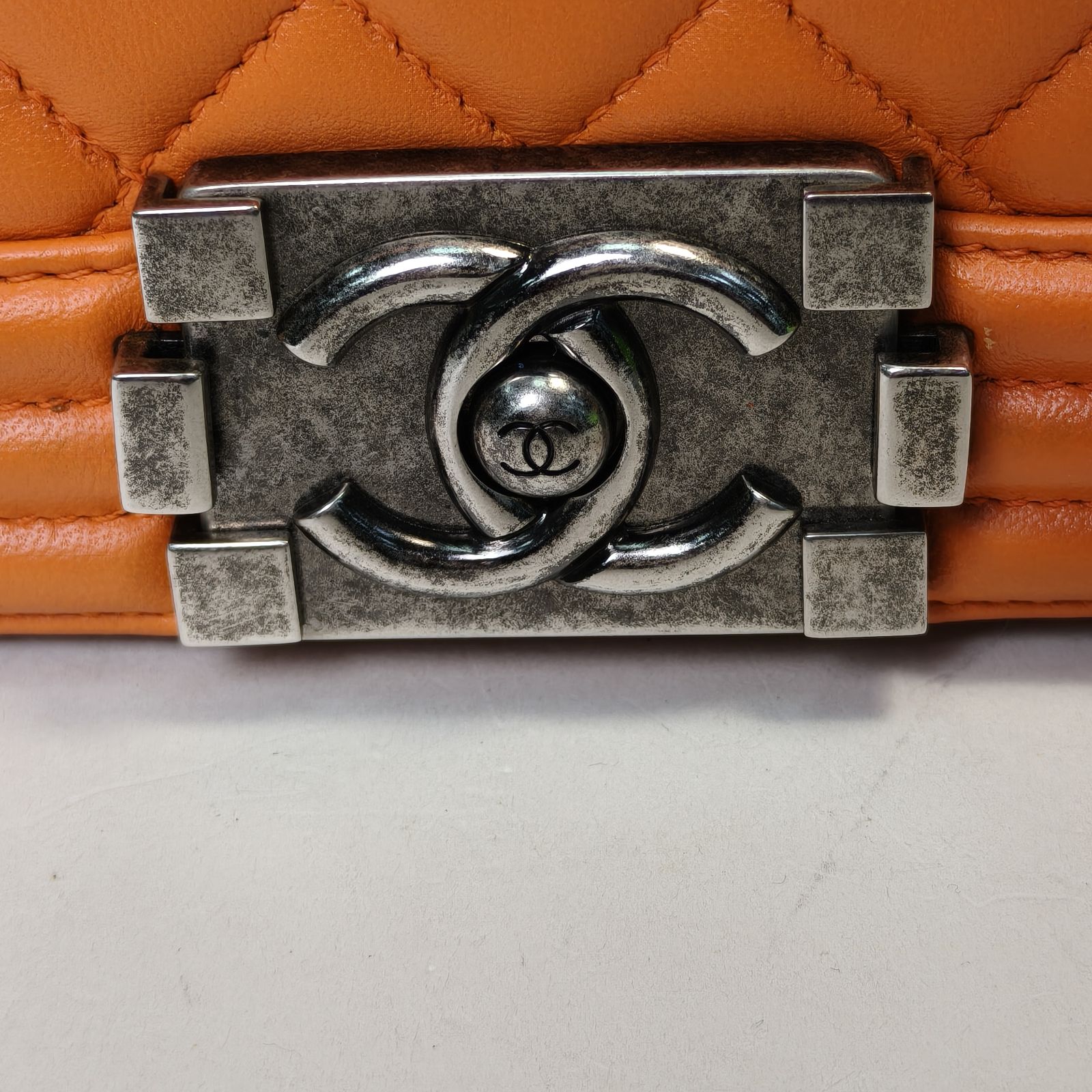 Embodying a chic and edgy luxury shoulder bag, the Chanel Leboy Medium is crafted from orange quilted leather with polished silver hardware. The structured silhouette and signature CC clasp make it a timeless investment piece.