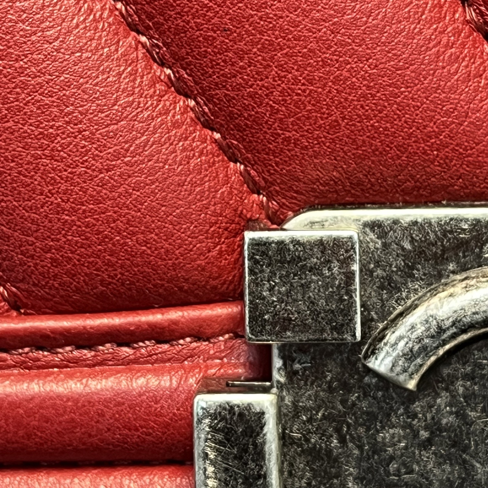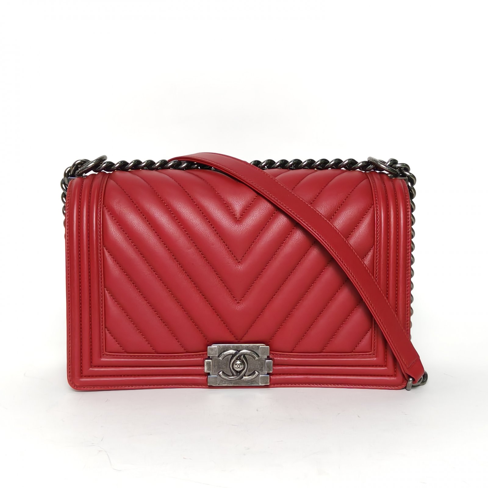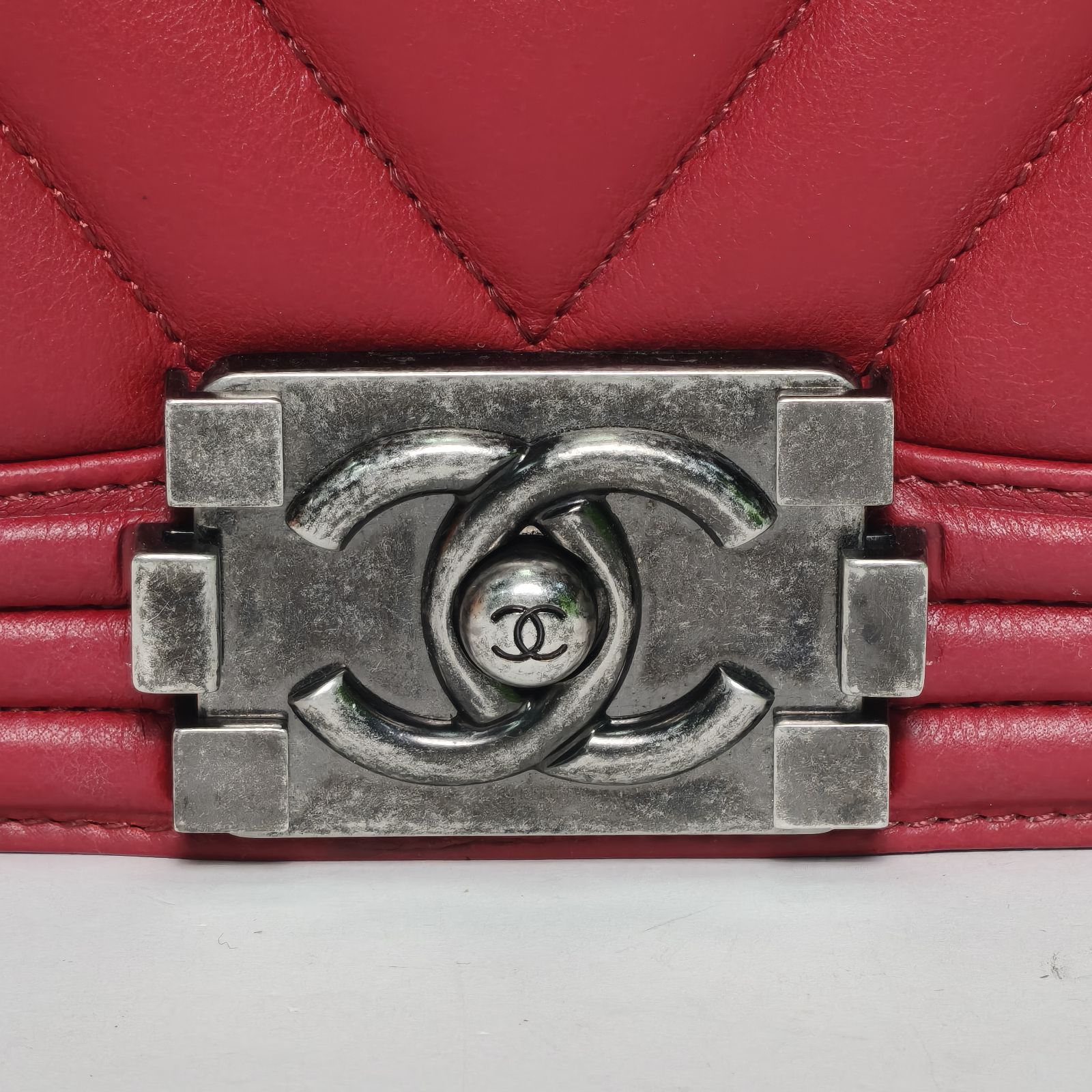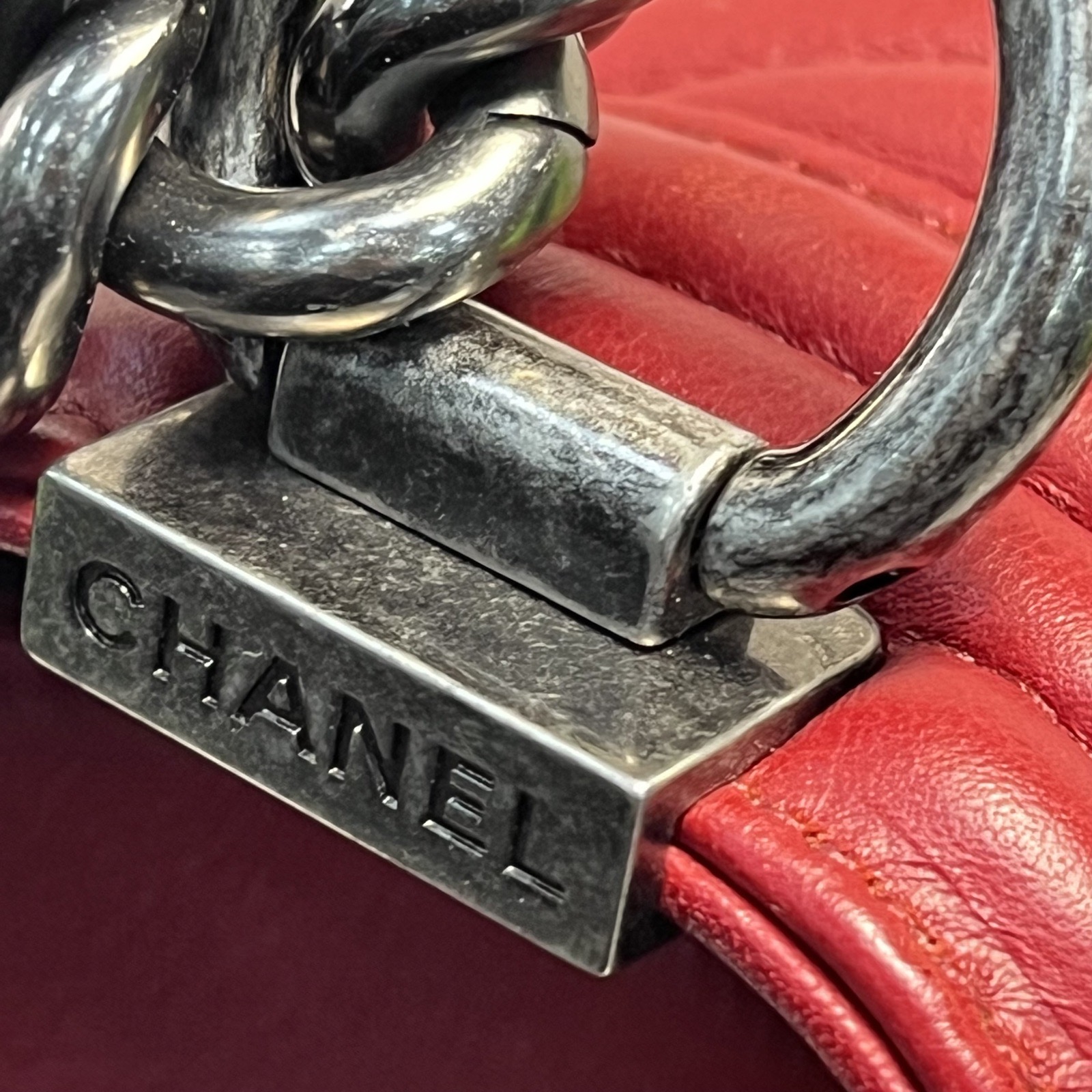 This Chanel Leboy medium 28cm bag is crafted from red chevron leather with silver-tone hardware, featuring the iconic interlocking CC clasp and chain strap.