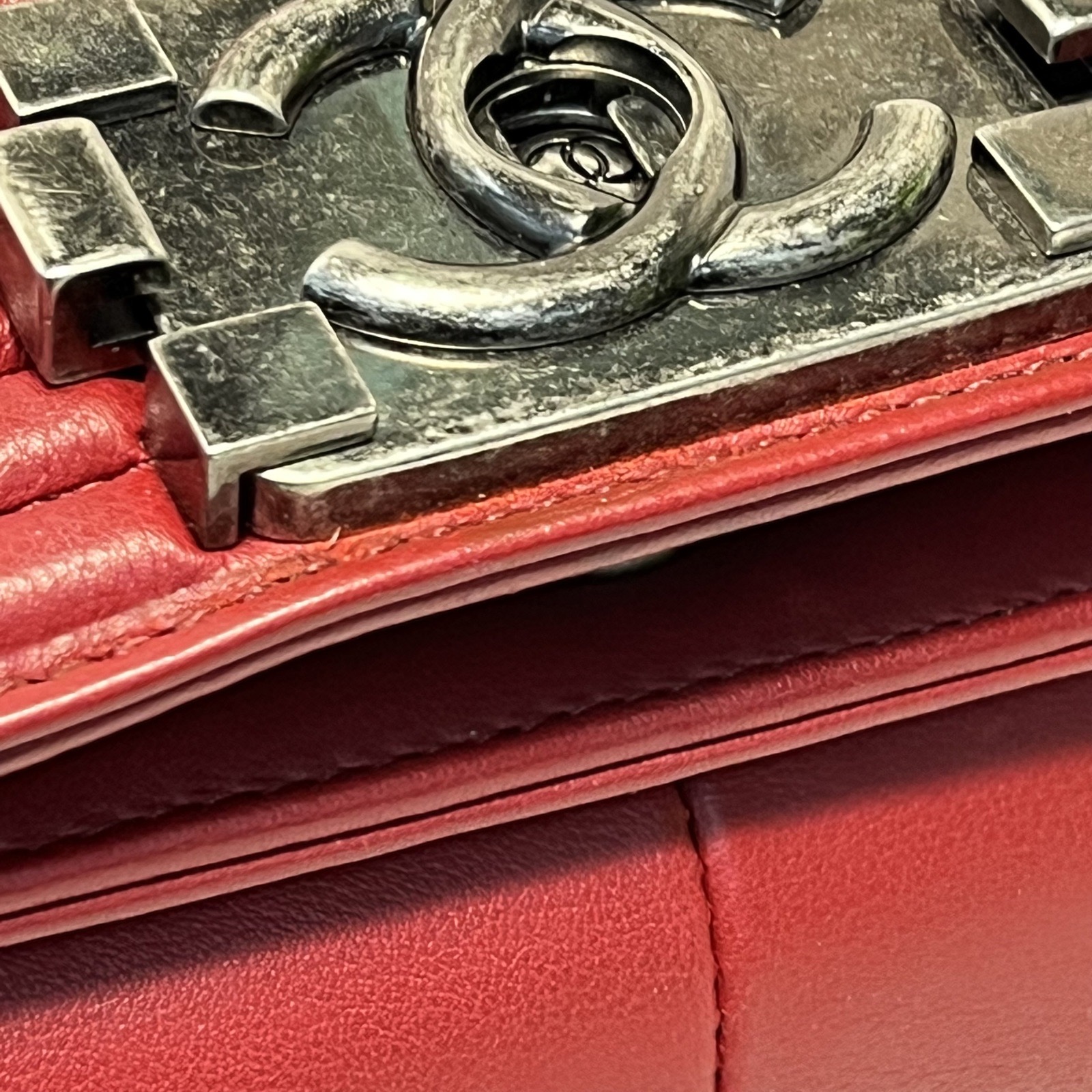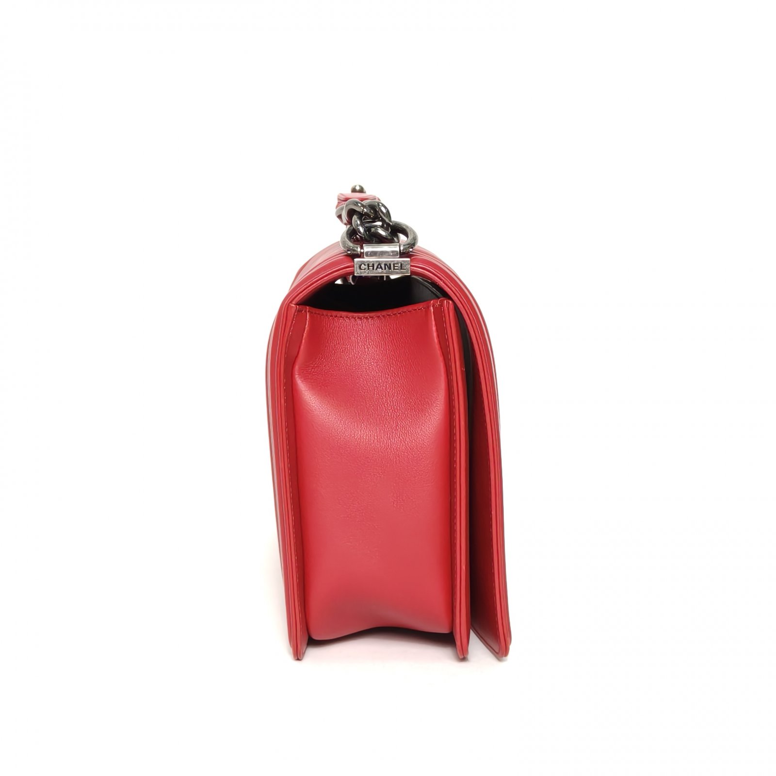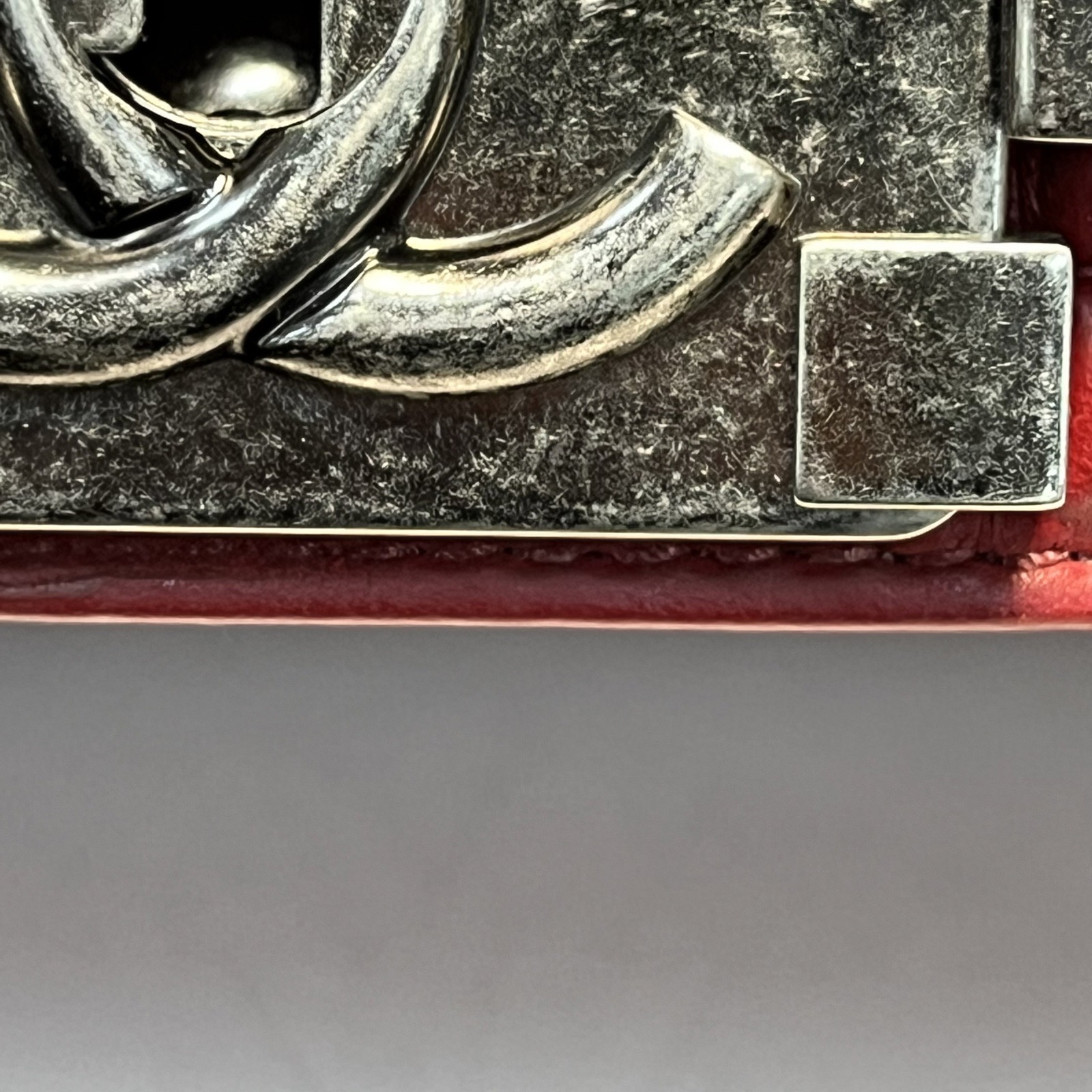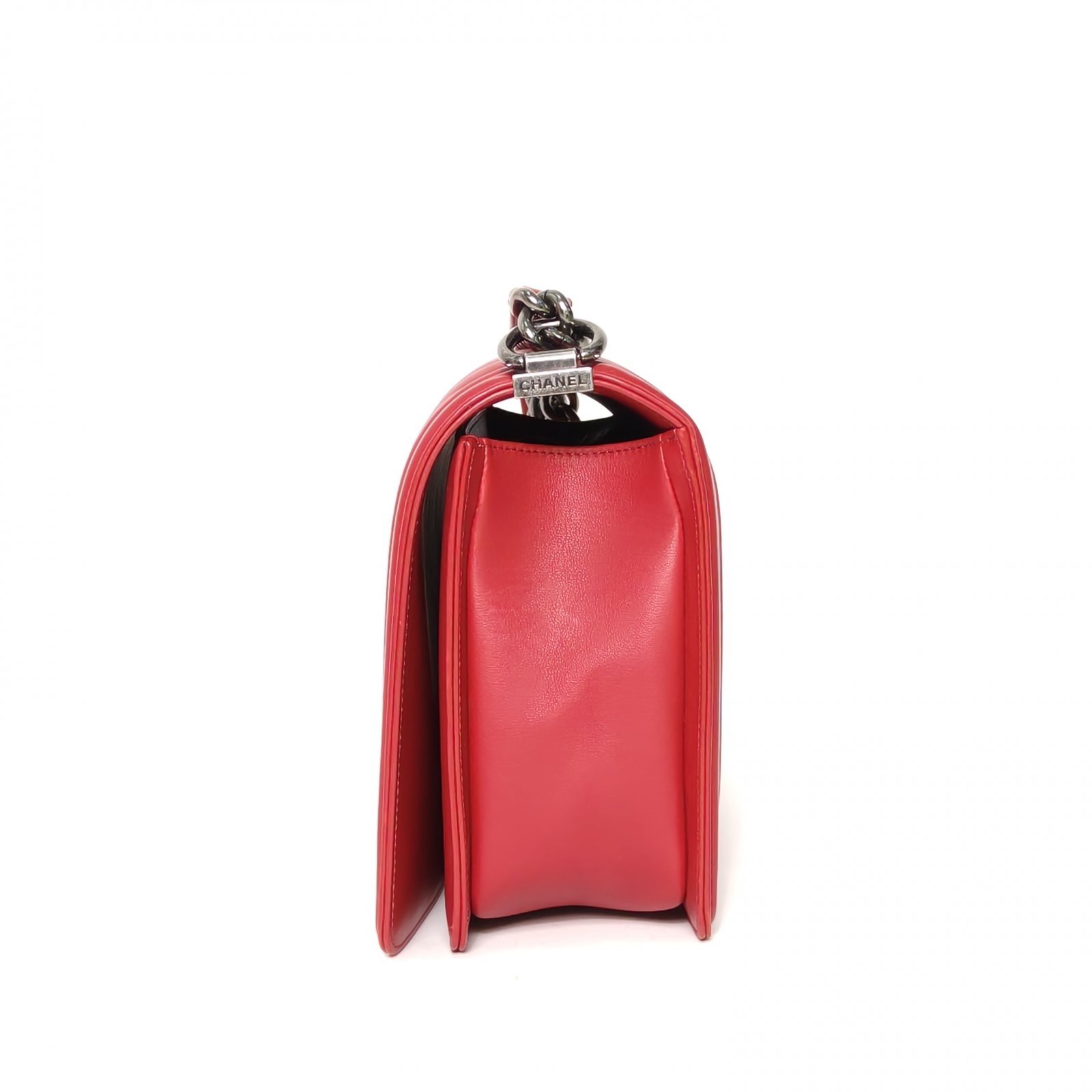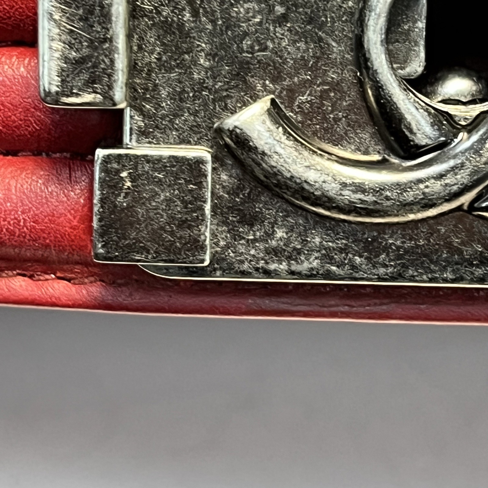 This Chanel Leboy medium 28cm bag is crafted from red chevron leather with silver-tone hardware, featuring the iconic interlocking CC clasp and chain strap.