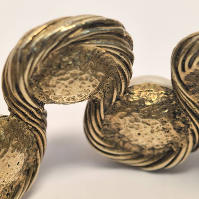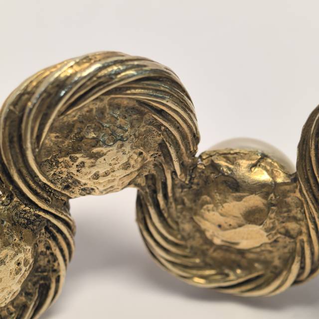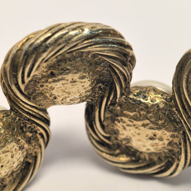 The Chanel 93P Medieval Pearl CC Bracelet is a magnificent artifact from the iconic Spring 1993 collection. This piece captures the raw, opulent beauty of the ‘Medieval’ aesthetic favored by Karl Lagerfeld, featuring a chunky gold-plated chain and a central statement link. The focal point is a large, luminous costume pearl encased in a textured, hammered-effect metal frame and crowned with a petite interlocking CC logo. Measuring 15cm, this bracelet offers a bold, archival presence that bridges the gap between ancient regalia and modern high fashion. It remains a top-tier collectible for Chanel enthusiasts, representing the pinnacle of the Maison’s 1990s artisanal jewelry era.
