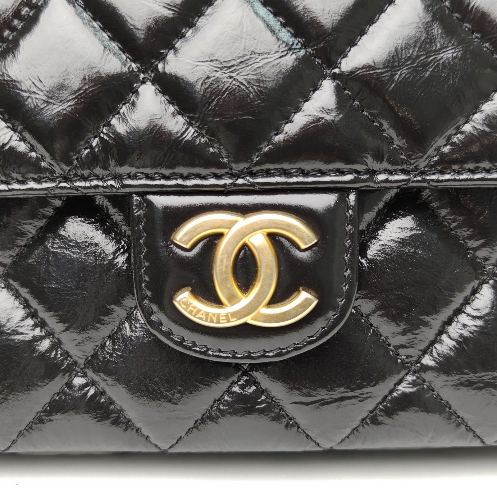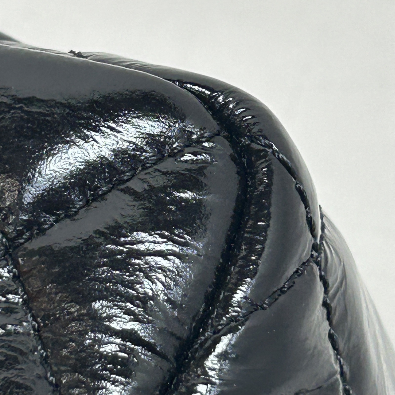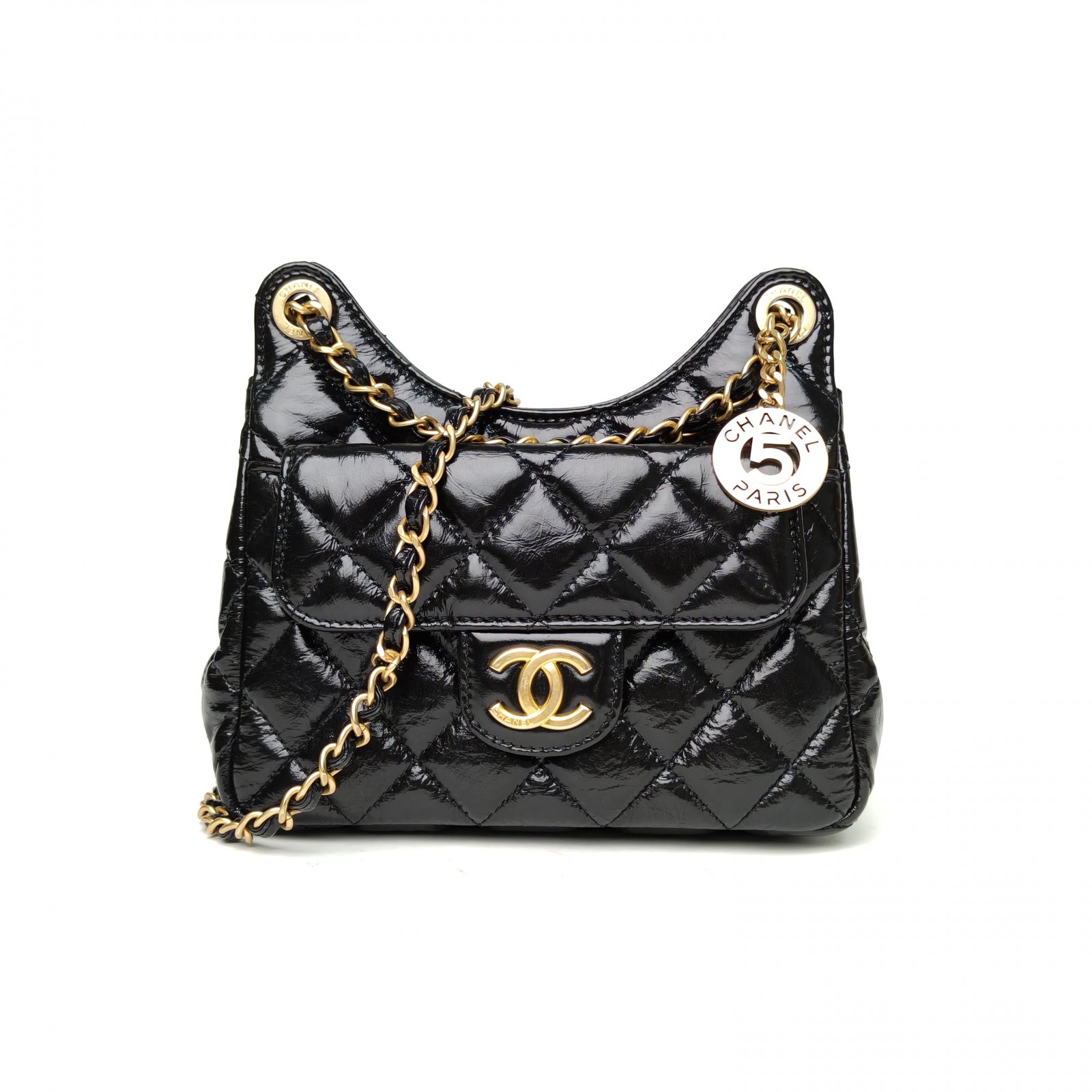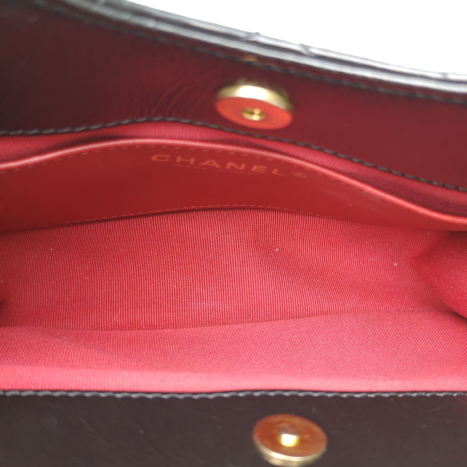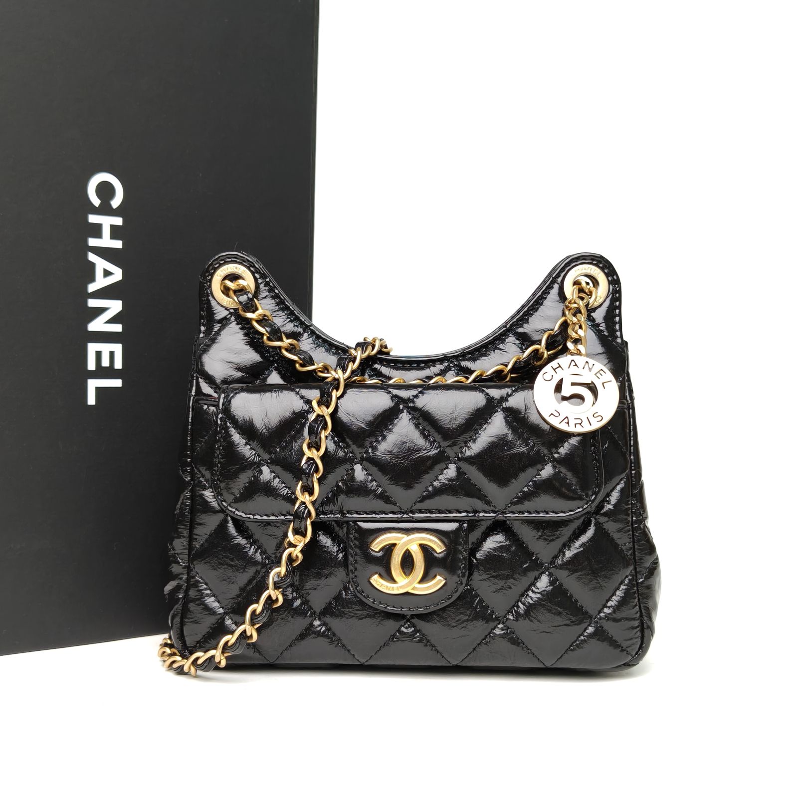 This Chanel tote bag is crafted from black quilted leather with a double chain strap, interlocking CC clasp, and chip opening, blending timeless elegance with modern functionality.