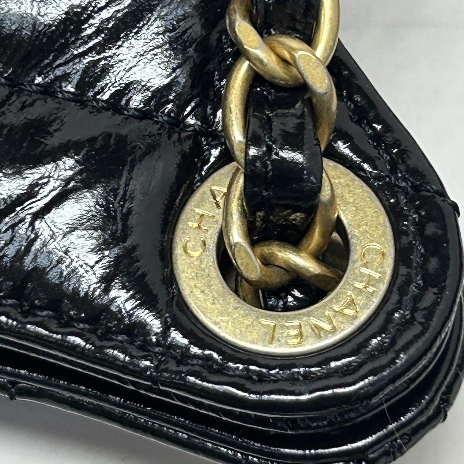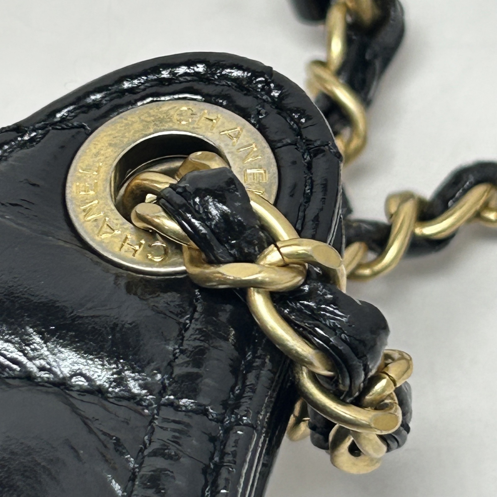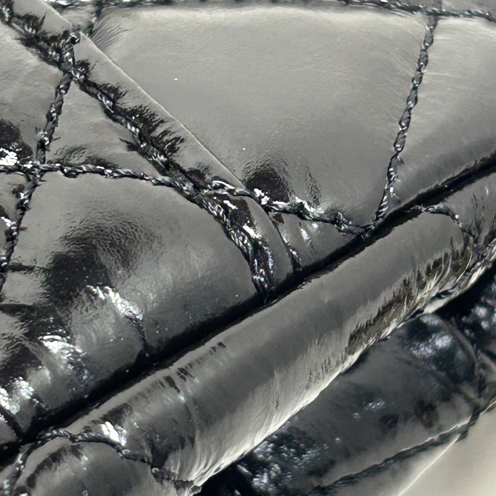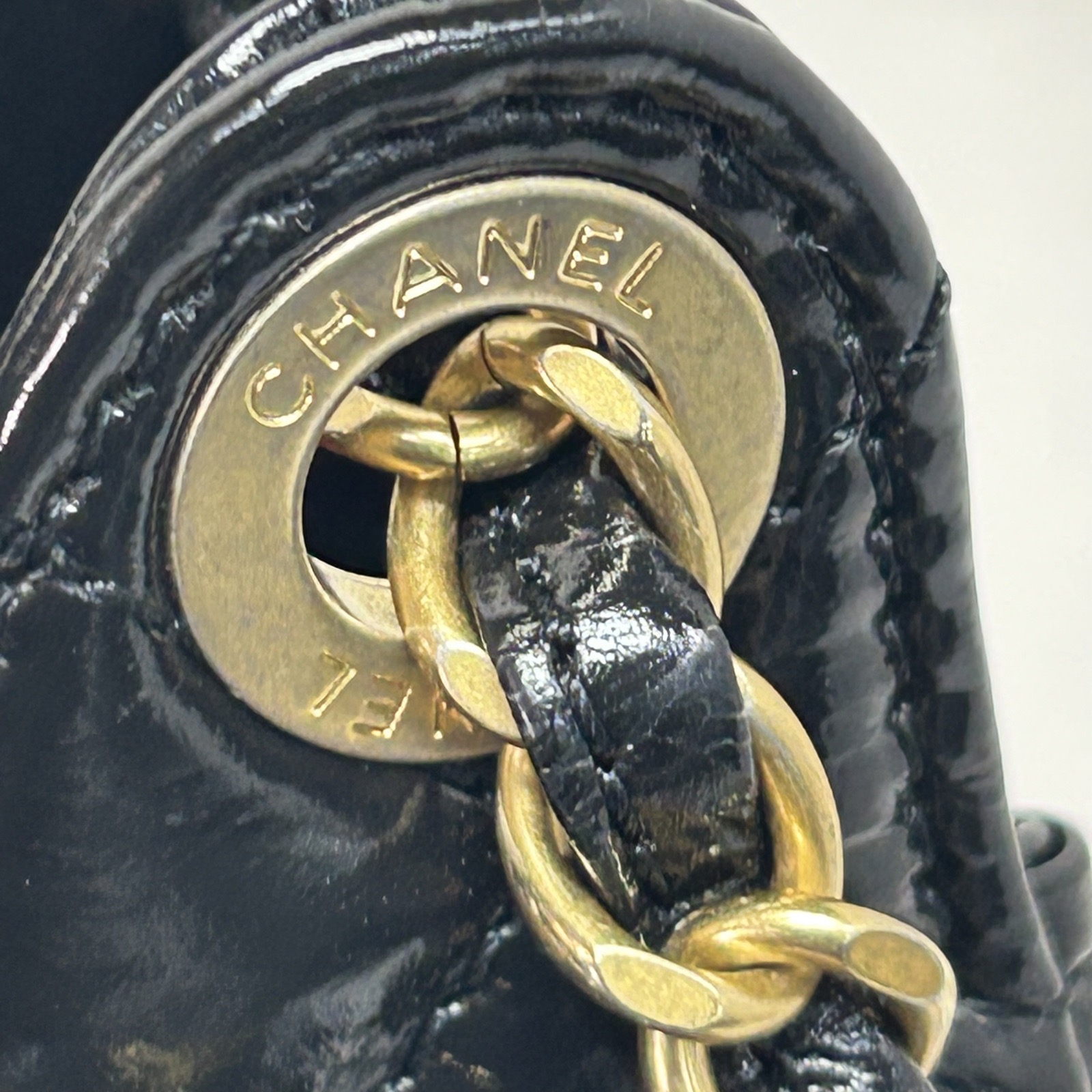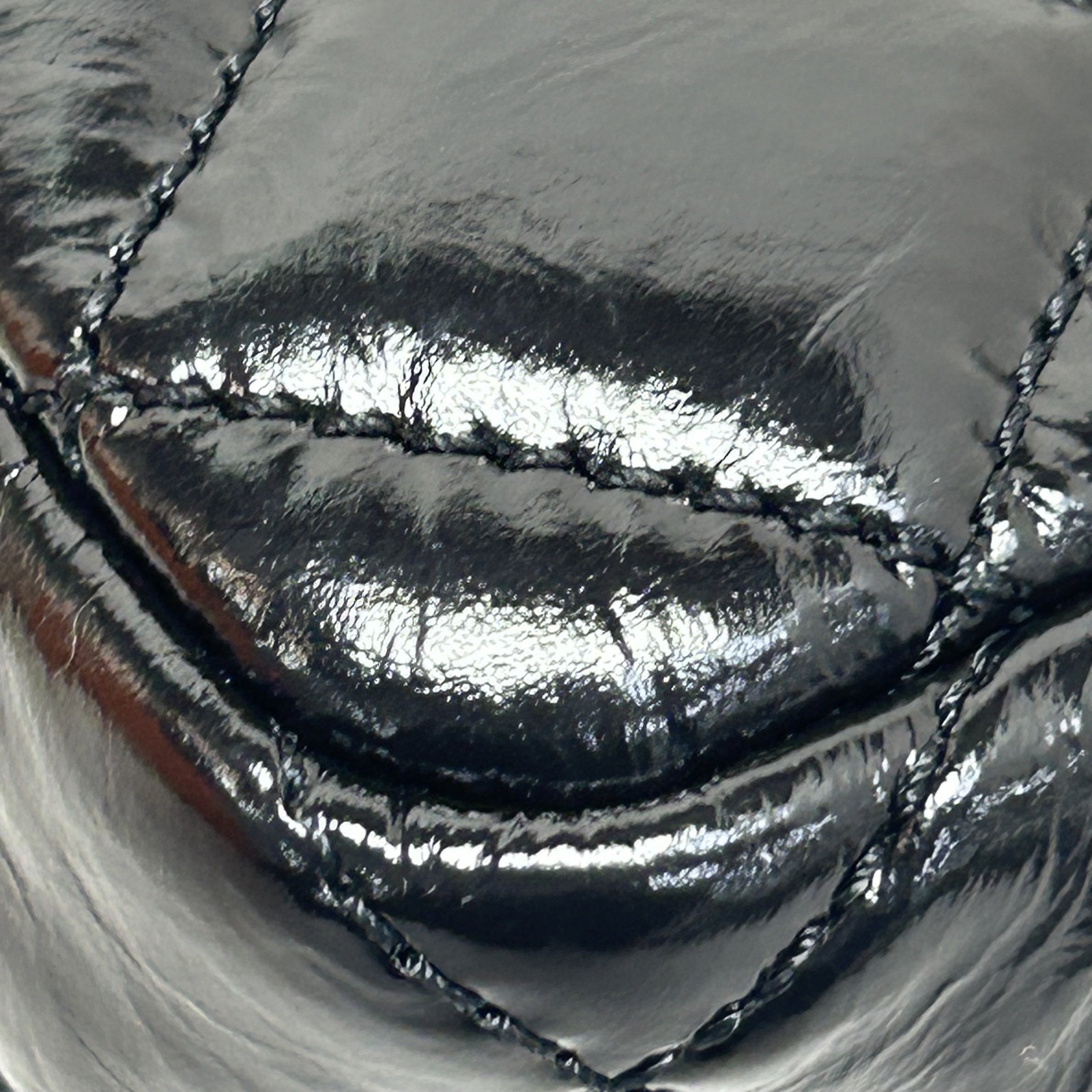 This Chanel tote bag is crafted from black quilted leather with a double chain strap, interlocking CC clasp, and chip opening, blending timeless elegance with modern functionality.