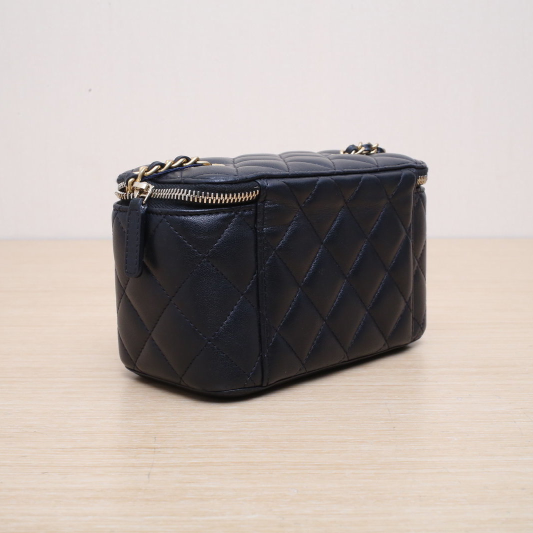Crafted from premium leather with classic diamond quilting and gold-tone CC hardware, this vanity case 17cm features a detachable chain strap, a stylish daily luxury piece.