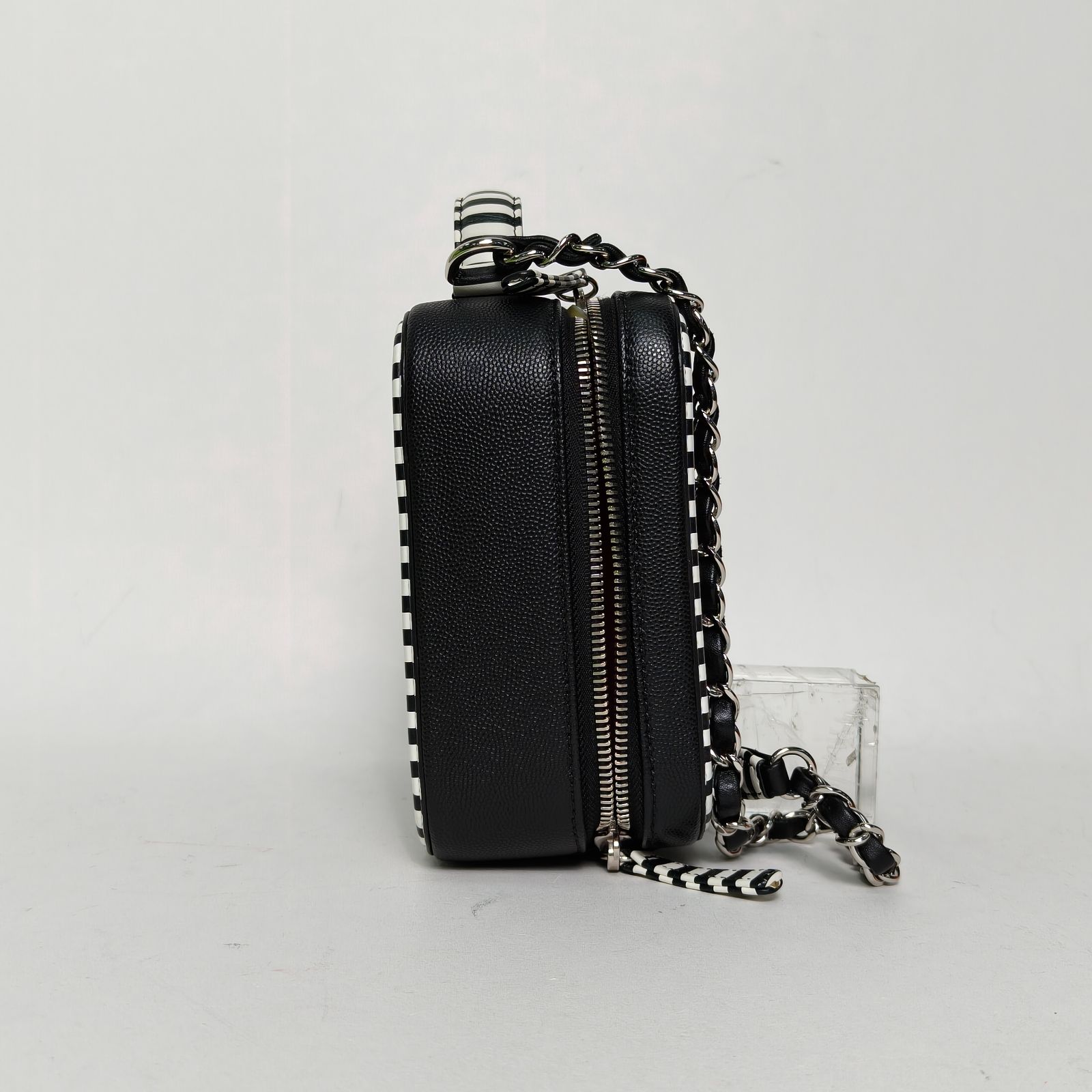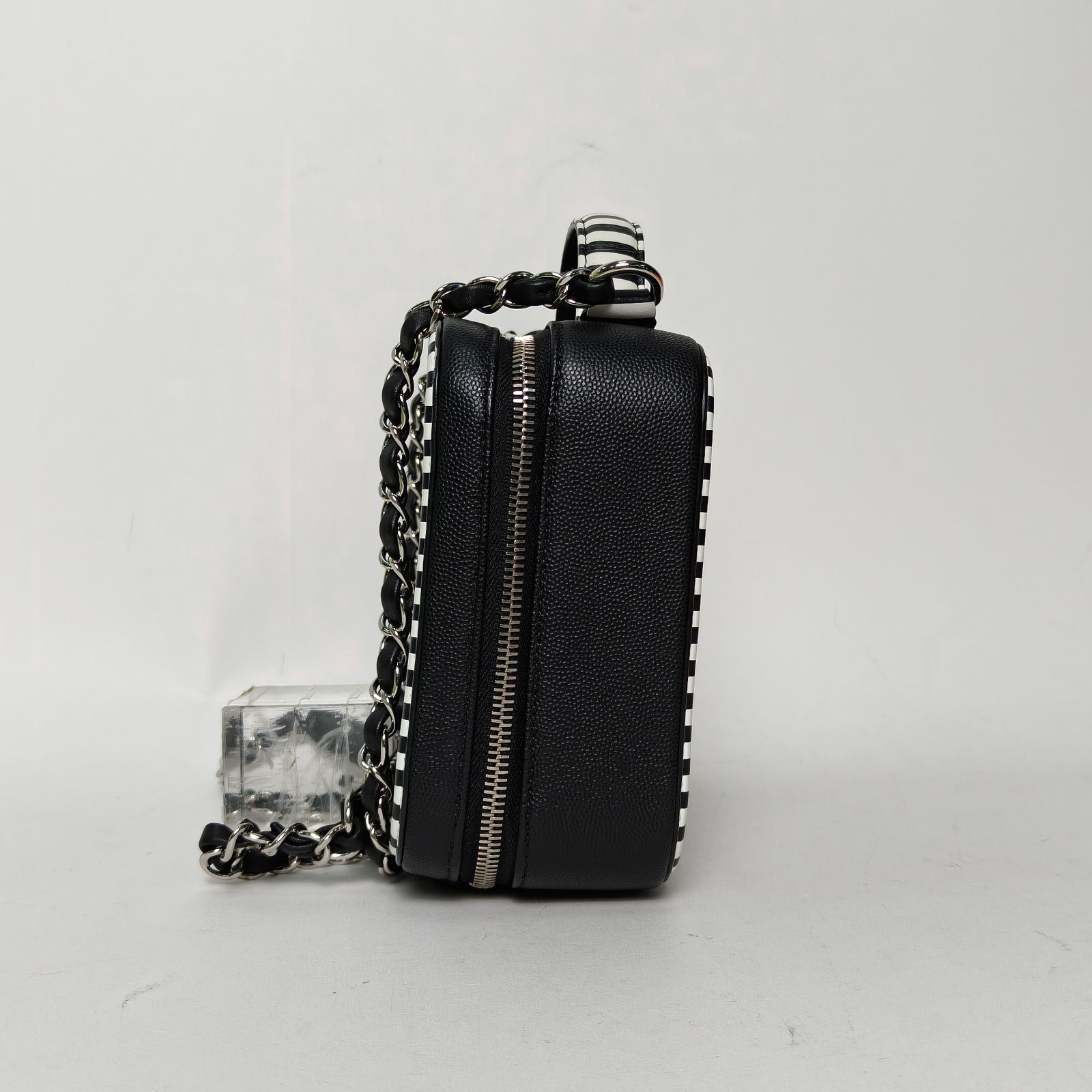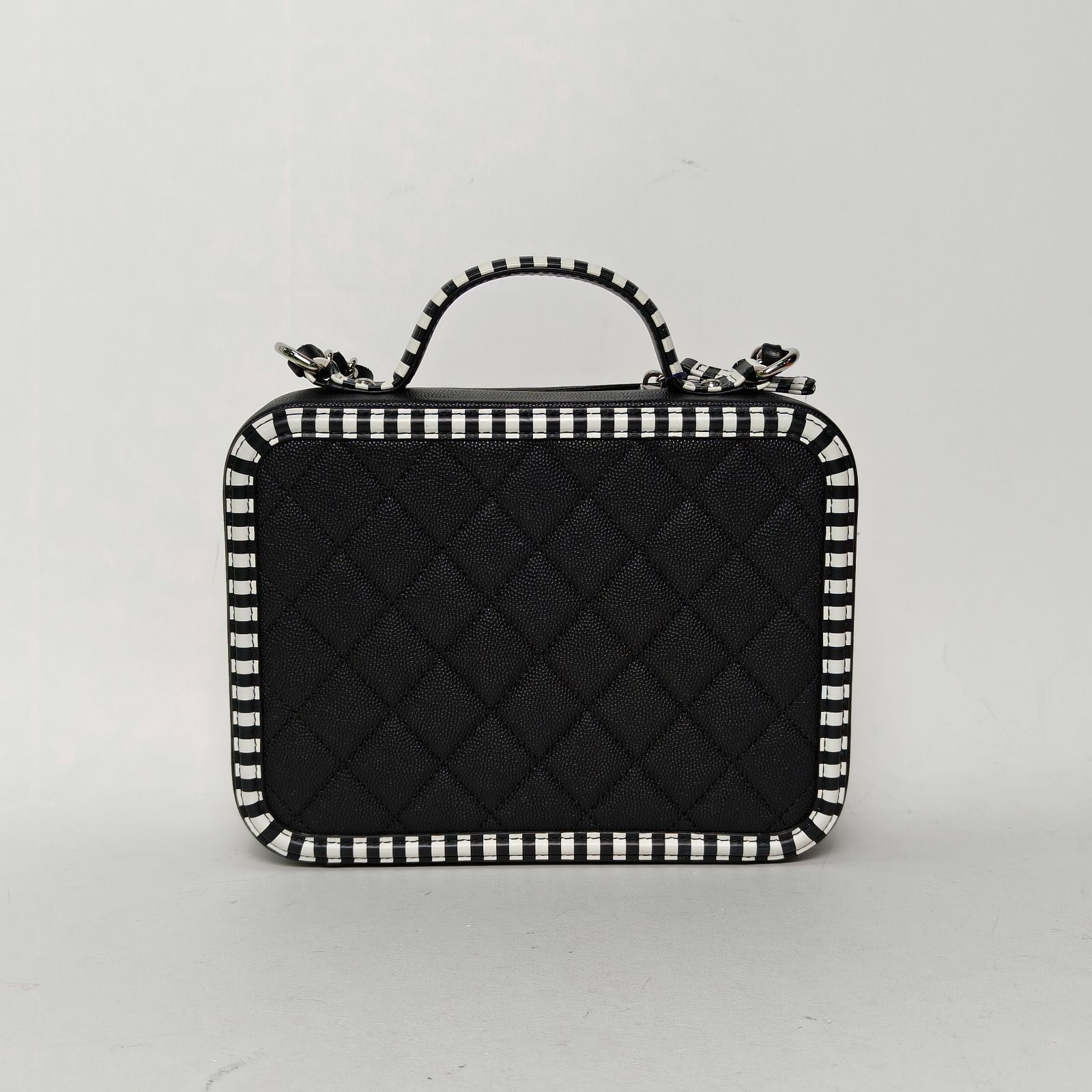 Crafted from black caviar leather with classic quilting and silver-tone CC hardware, this Vanity Case medium 21cm bag features a top handle and detachable strap, a stylish daily luxury piece.