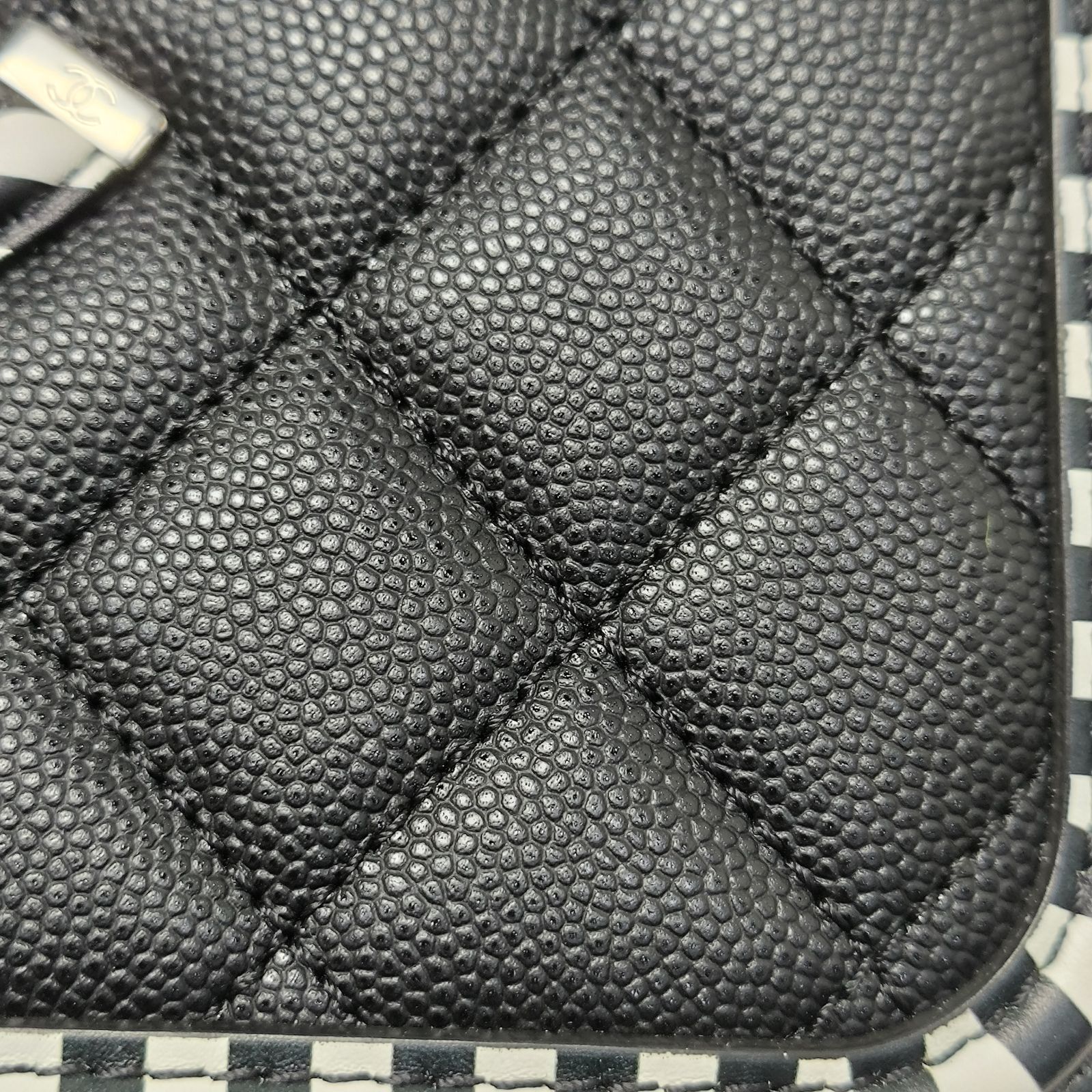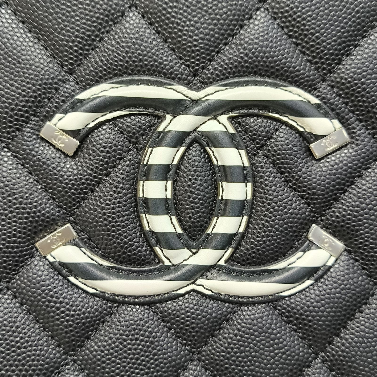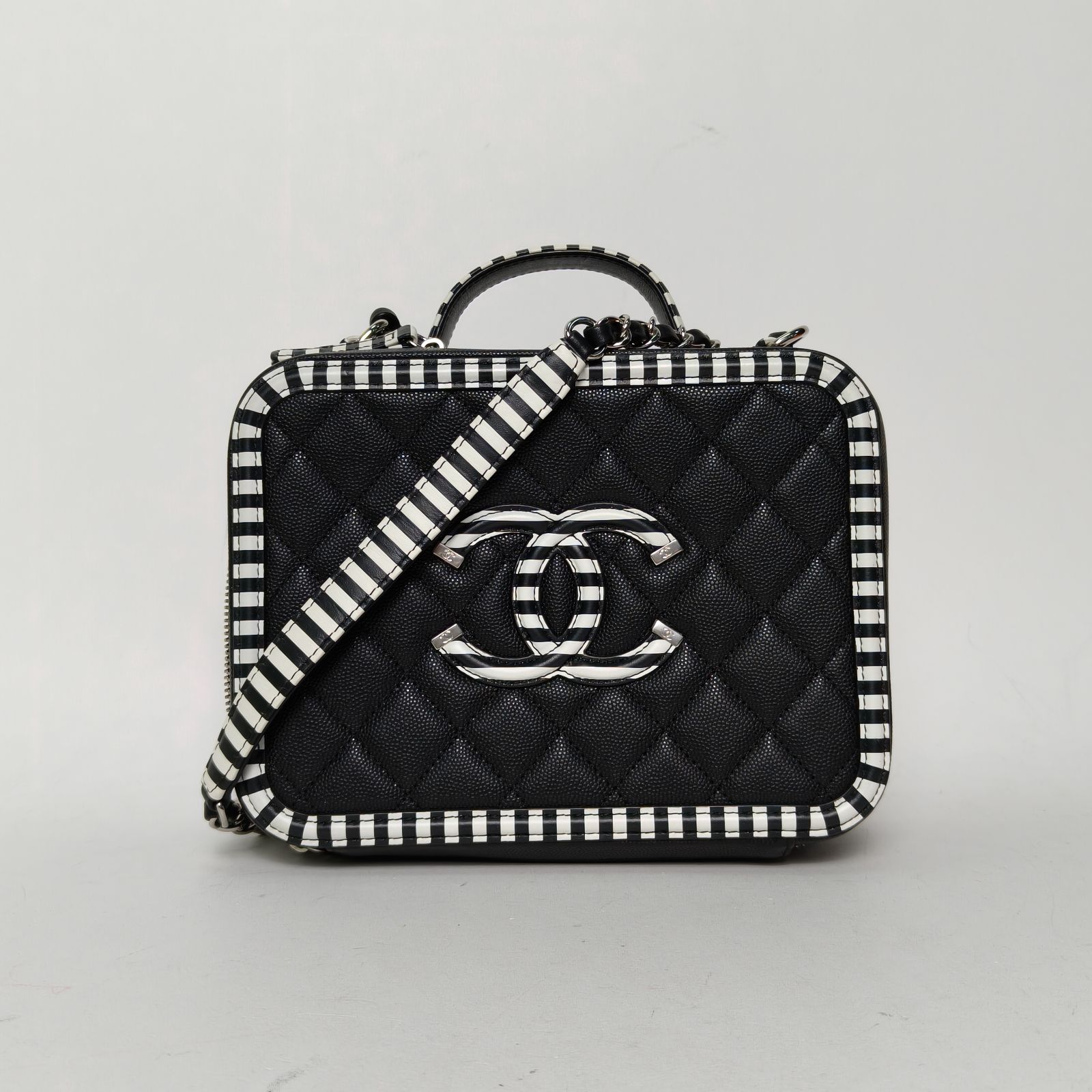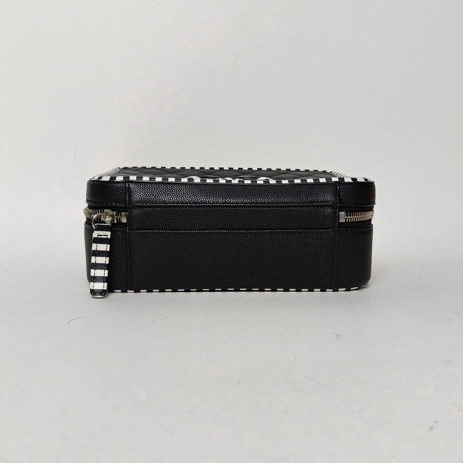 Crafted from black caviar leather with classic quilting and silver-tone CC hardware, this Vanity Case medium 21cm bag features a top handle and detachable strap, a stylish daily luxury piece.