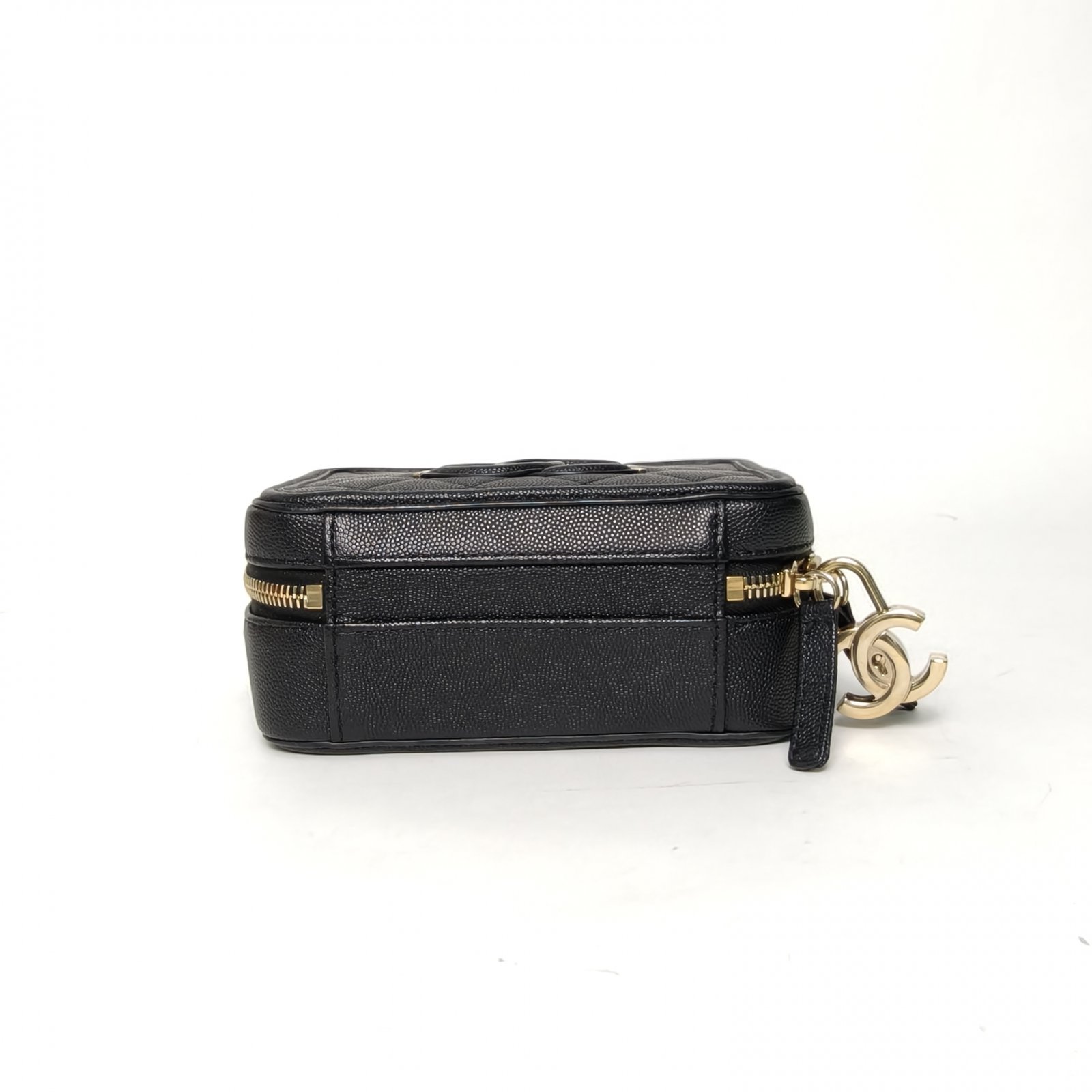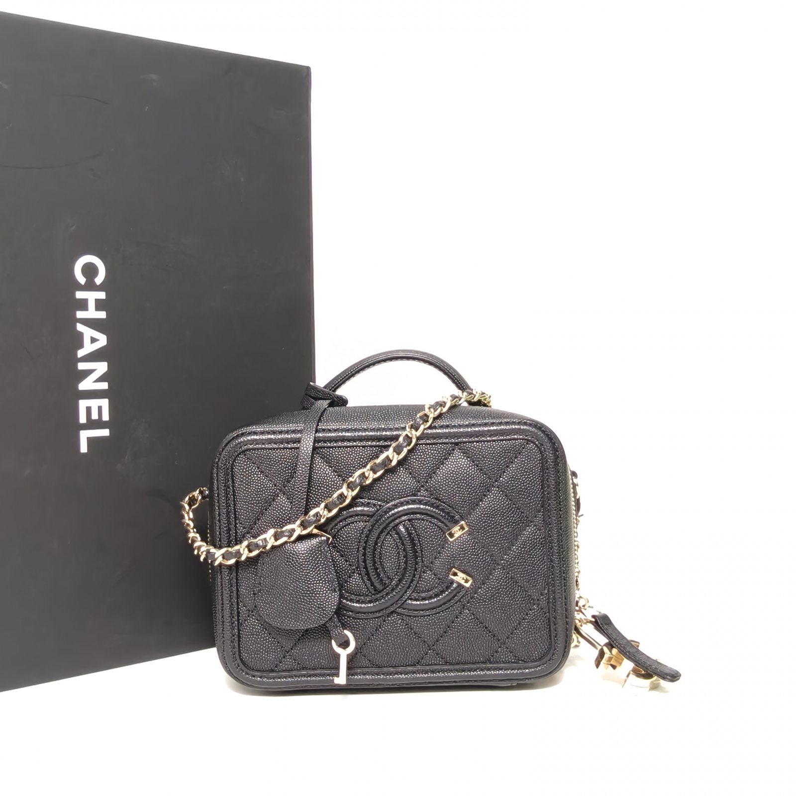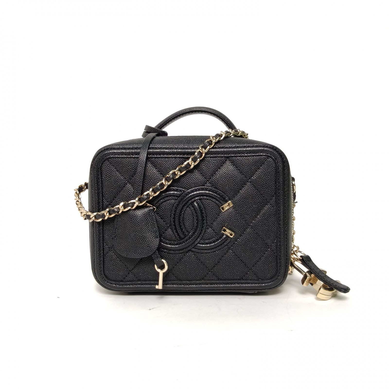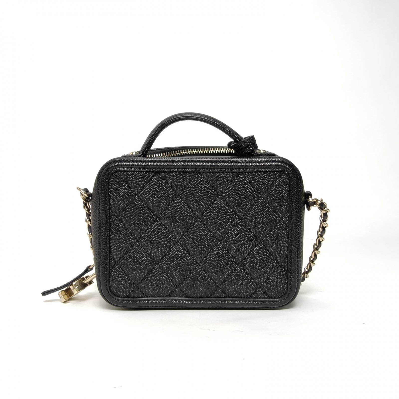 Crafted from black grained leather with quilted pattern and CC logo, this vanity case features a top handle and chain strap, offering compact, structured storage.