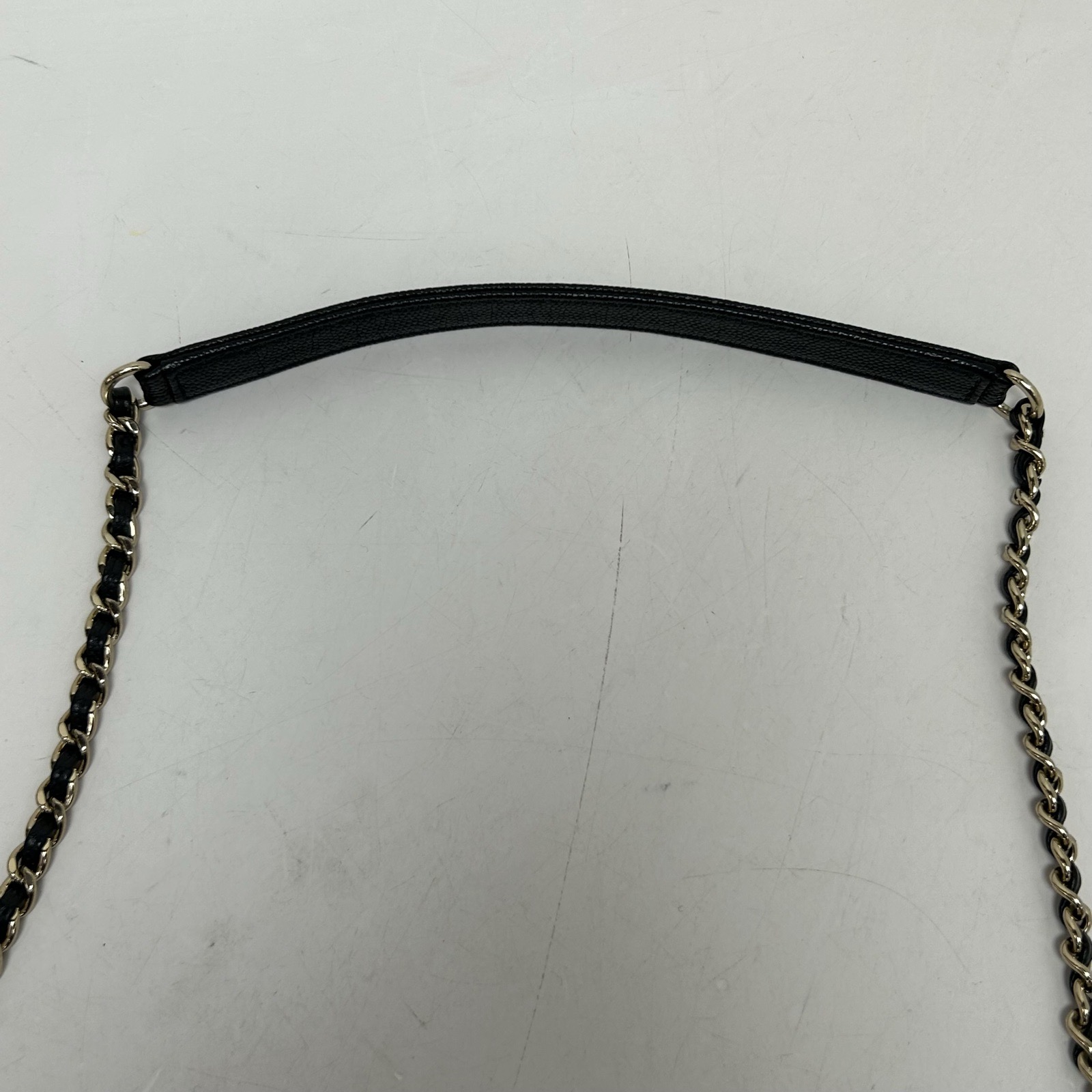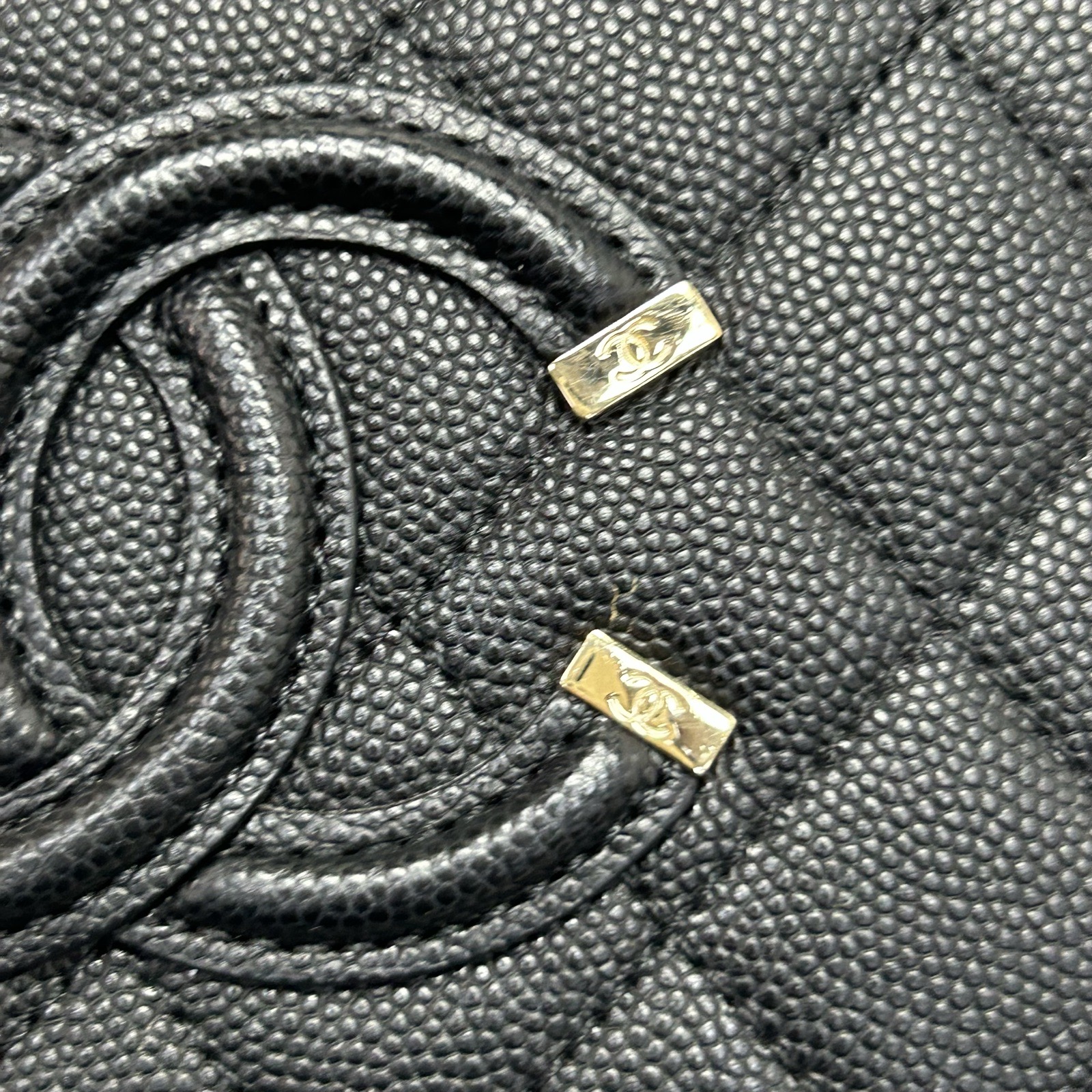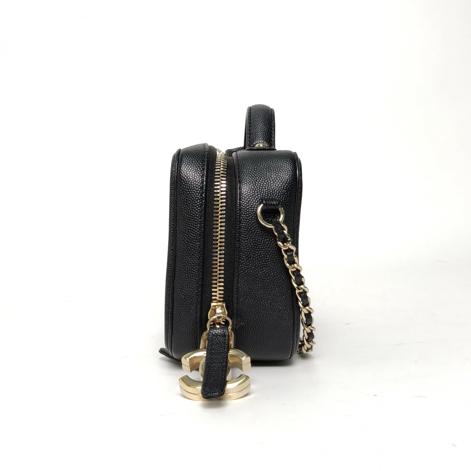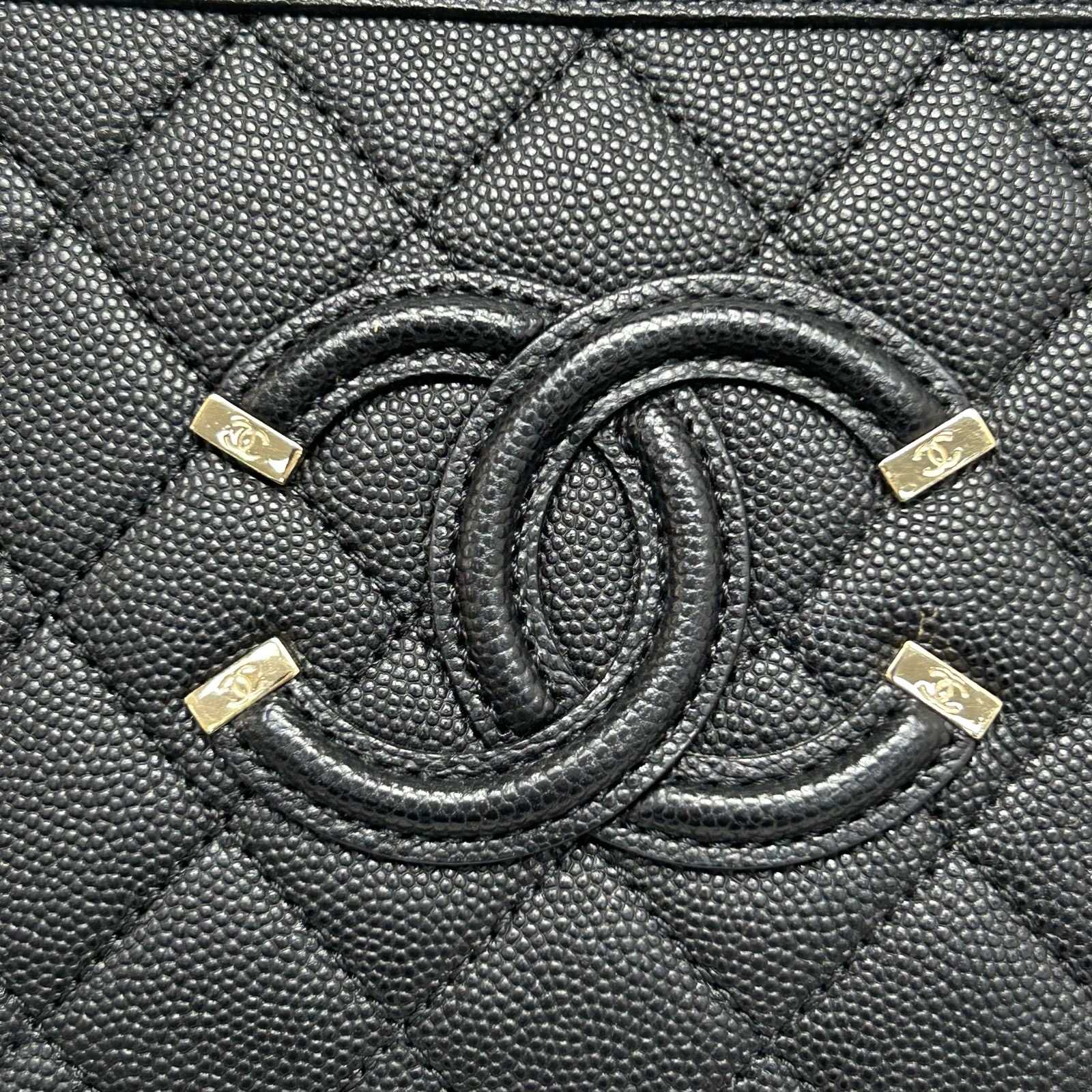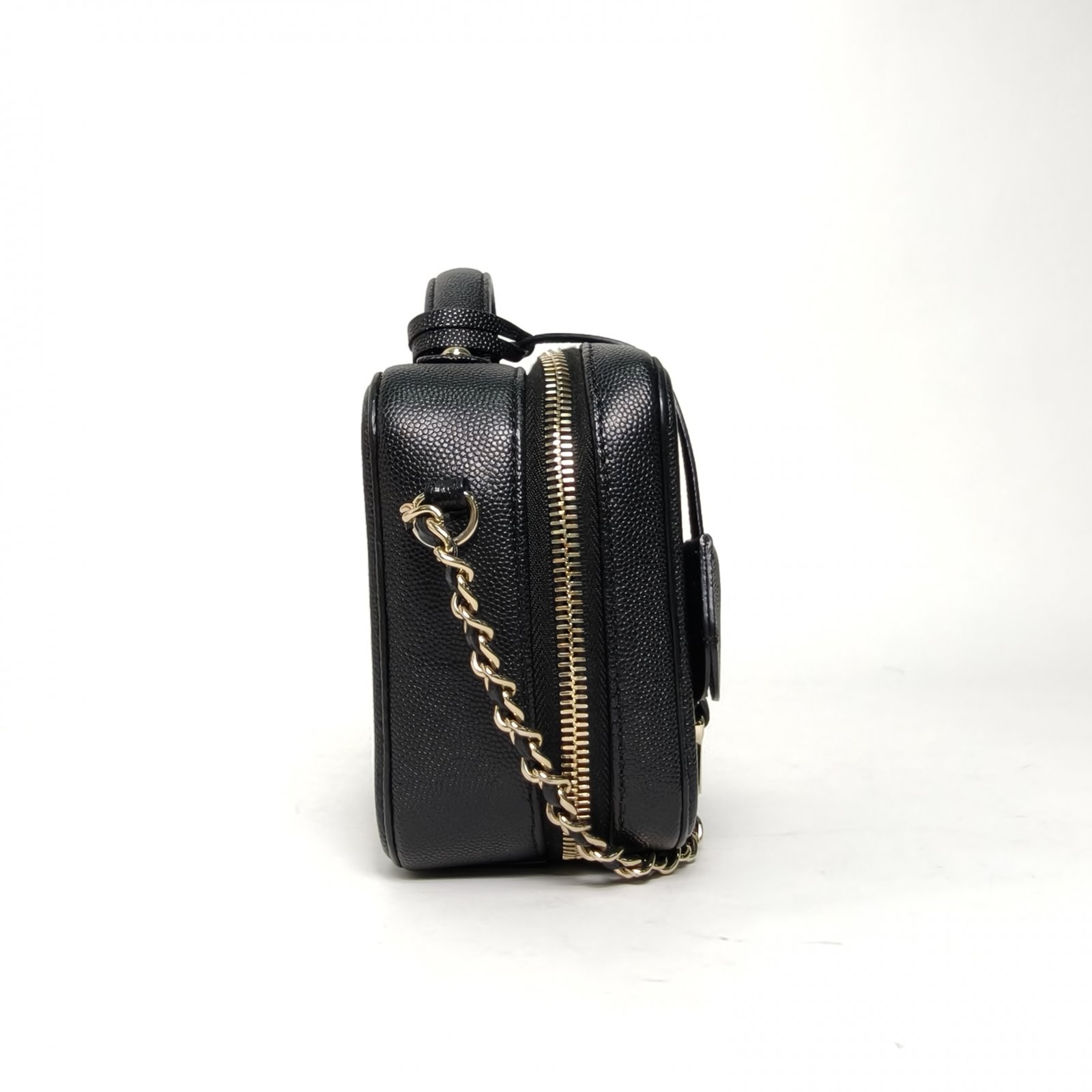 Crafted from black grained leather with quilted pattern and CC logo, this vanity case features a top handle and chain strap, offering compact, structured storage.