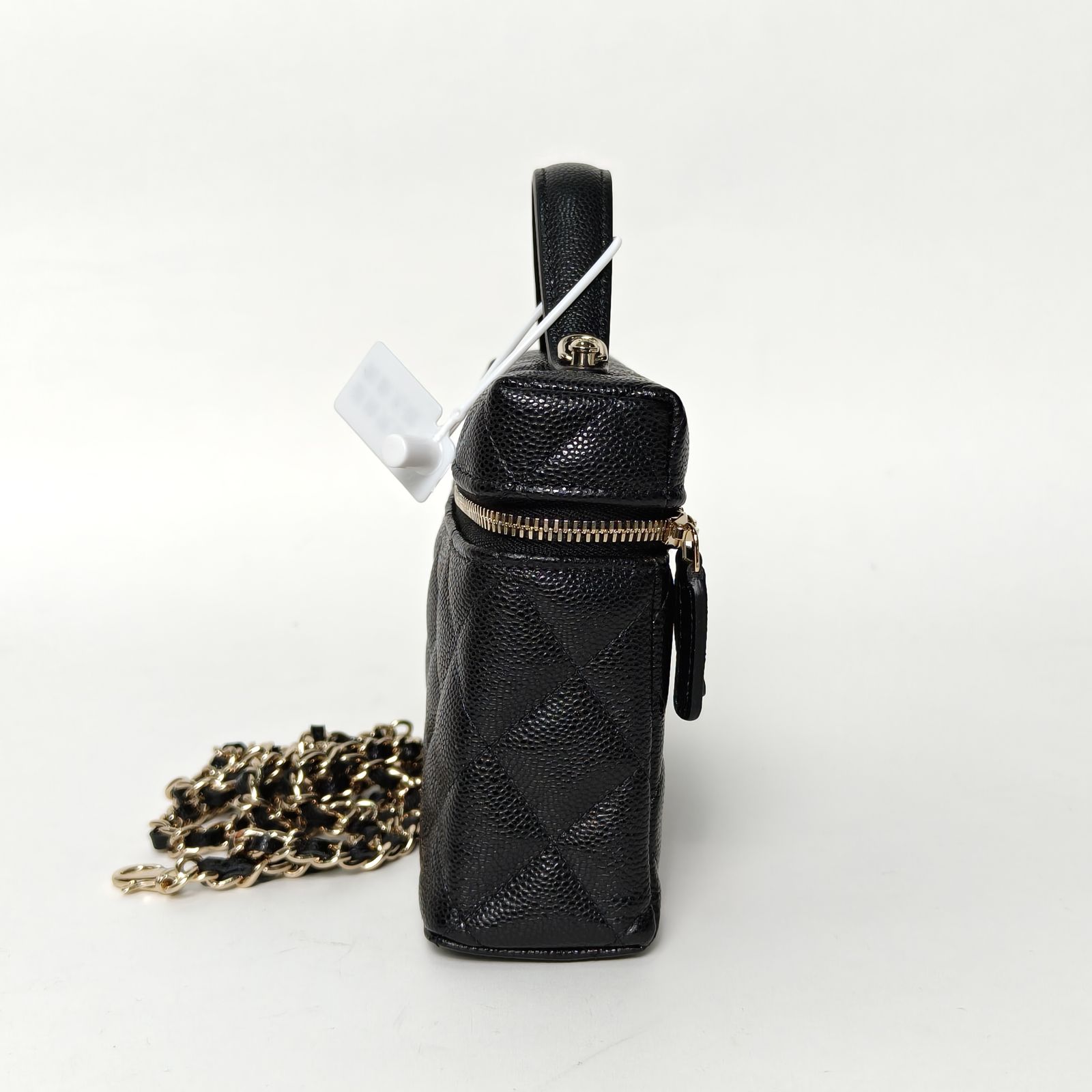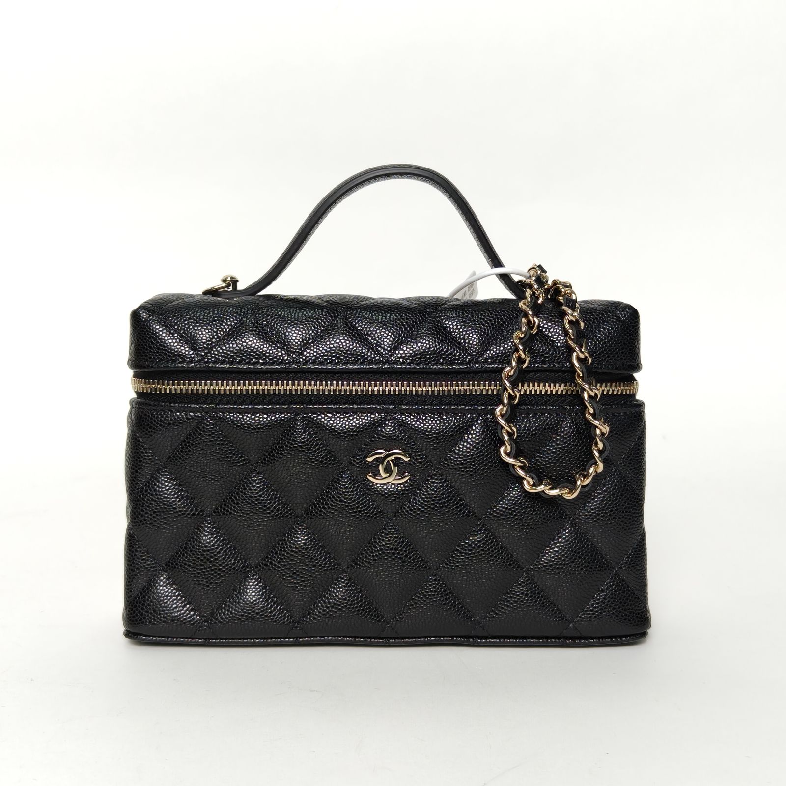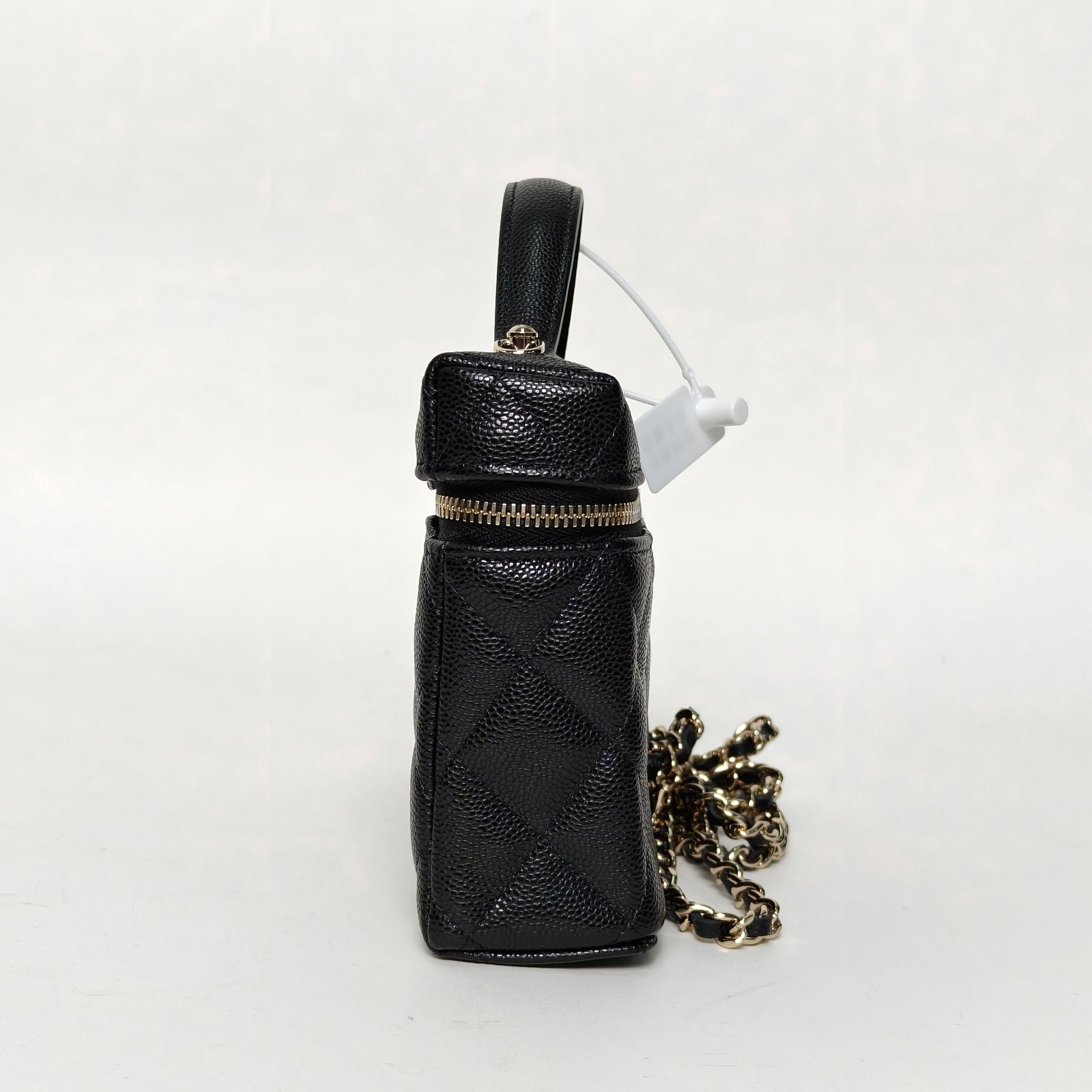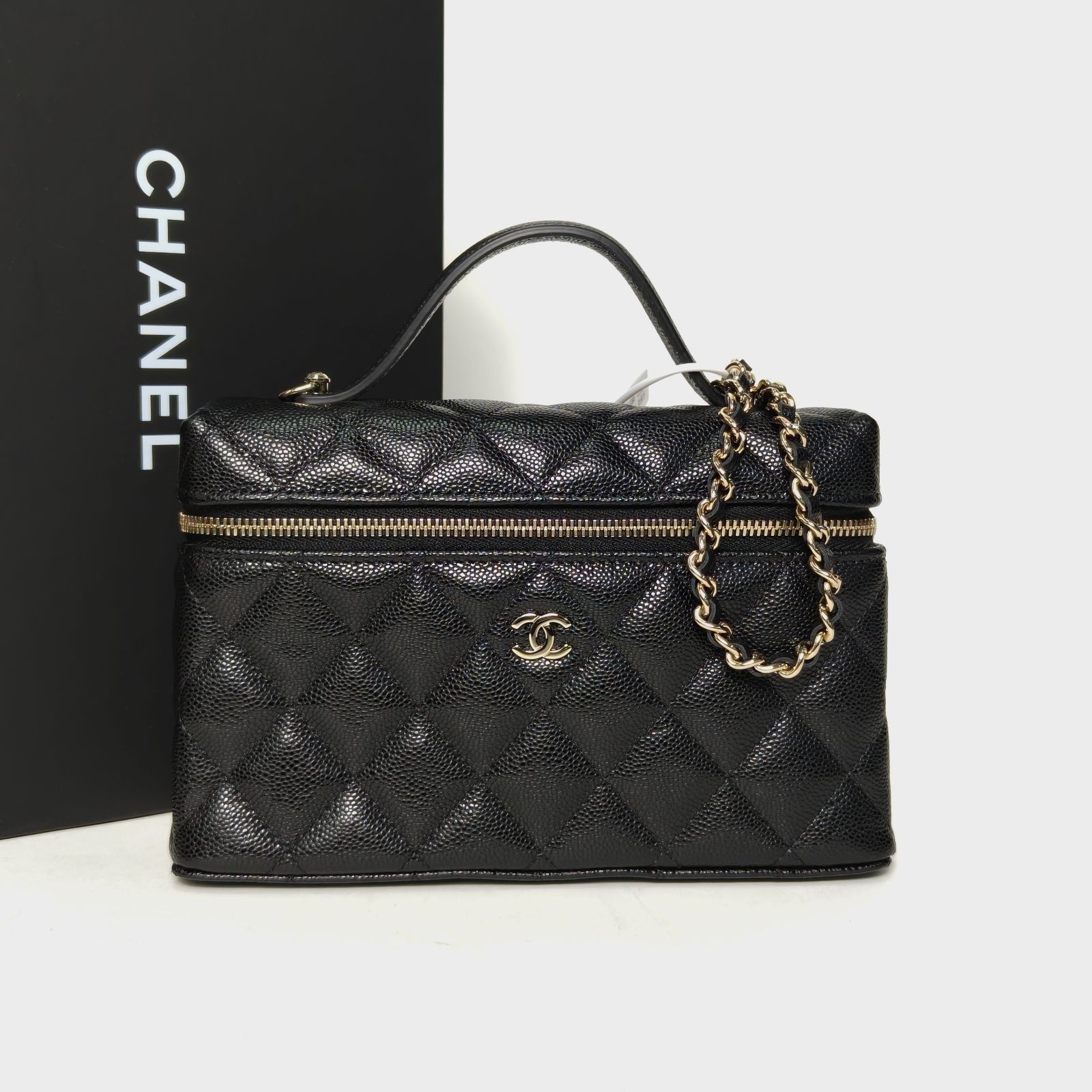 This Chanel vanity case small 19.5cm is made of black quilted leather with light gold-tone hardware, featuring a top handle and detachable chain strap.
