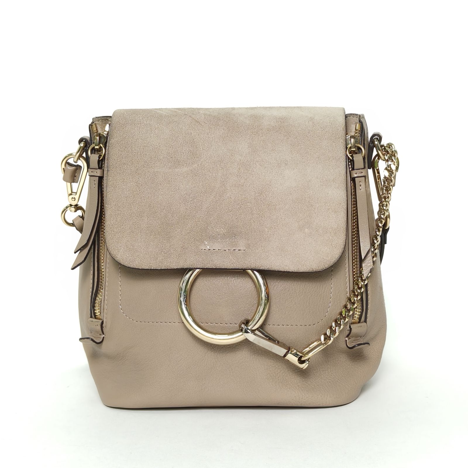 Embodying a bohemian and structured luxury backpack, the Chloe Faye Small is crafted from elephant grey leather and suede with polished gold hardware and the iconic circular ring detail. The three shoulder straps make it a versatile accessory.
