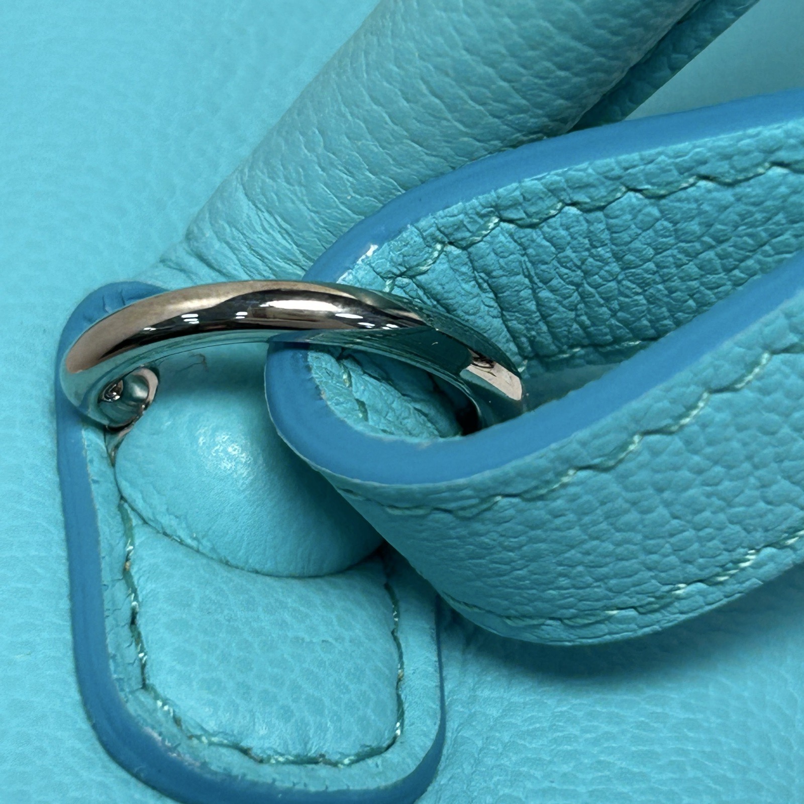 Crafted from vibrant turquoise grained leather with signature D-ring clasp, this Brillant Mini features a top handle and detachable shoulder strap, embodying Belgian luxury heritage.