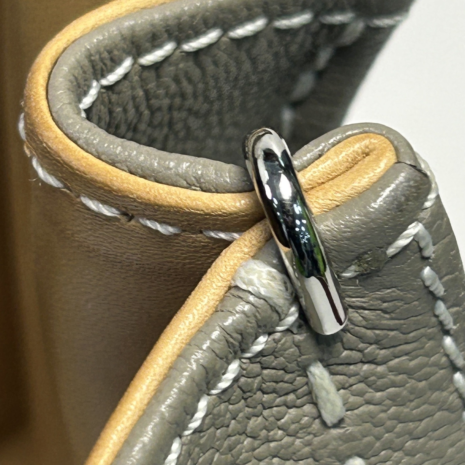 Crafted from elephant gray leather with iconic D-buckle hardware, this Brillant Mini handbag features a detachable strap and warranty card, embodying Belgian luxury craftsmanship.