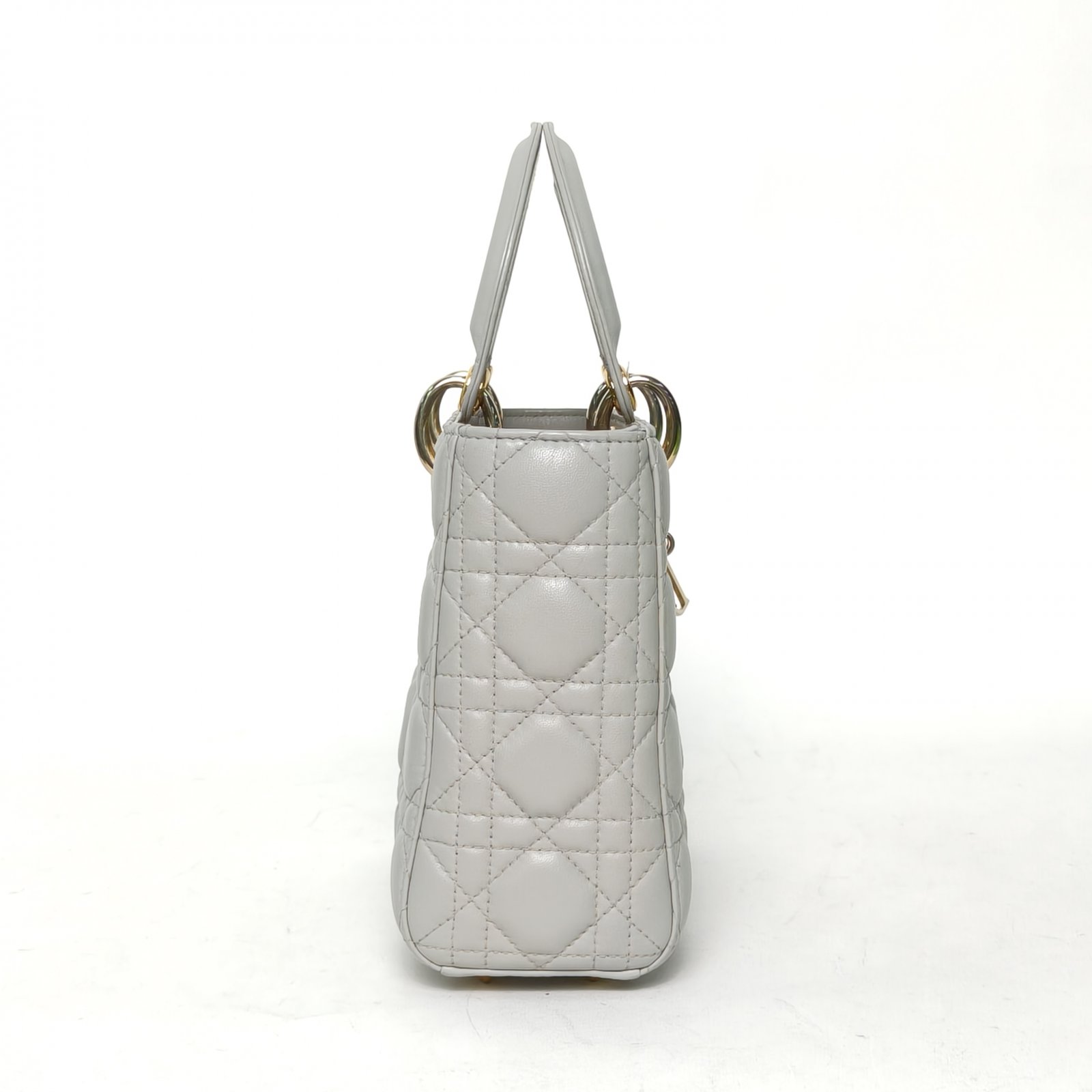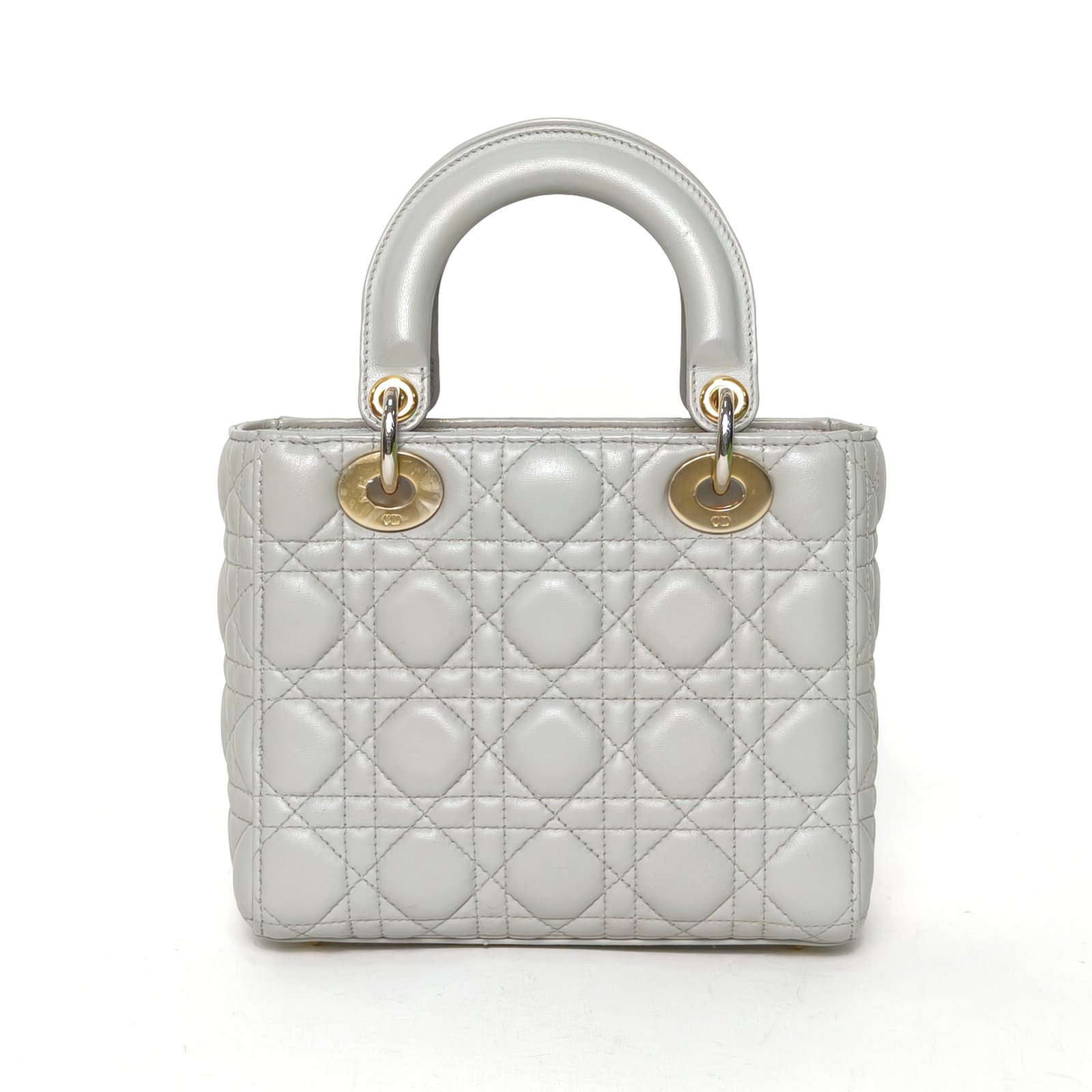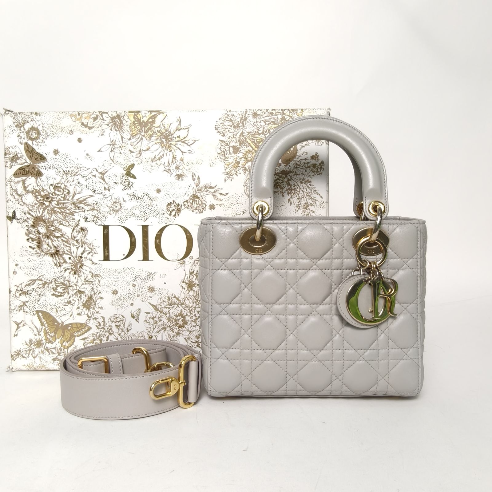 Crafted from gray leather with iconic Cannage stitching, this Lady Dior 4-grid bag features top handles and a detachable strap, a timeless luxury icon.