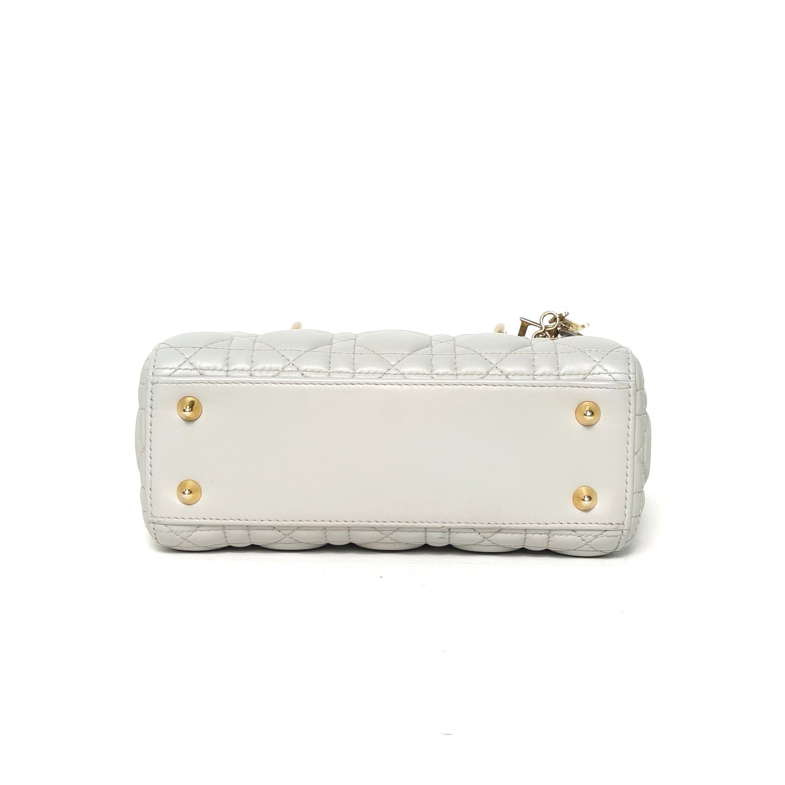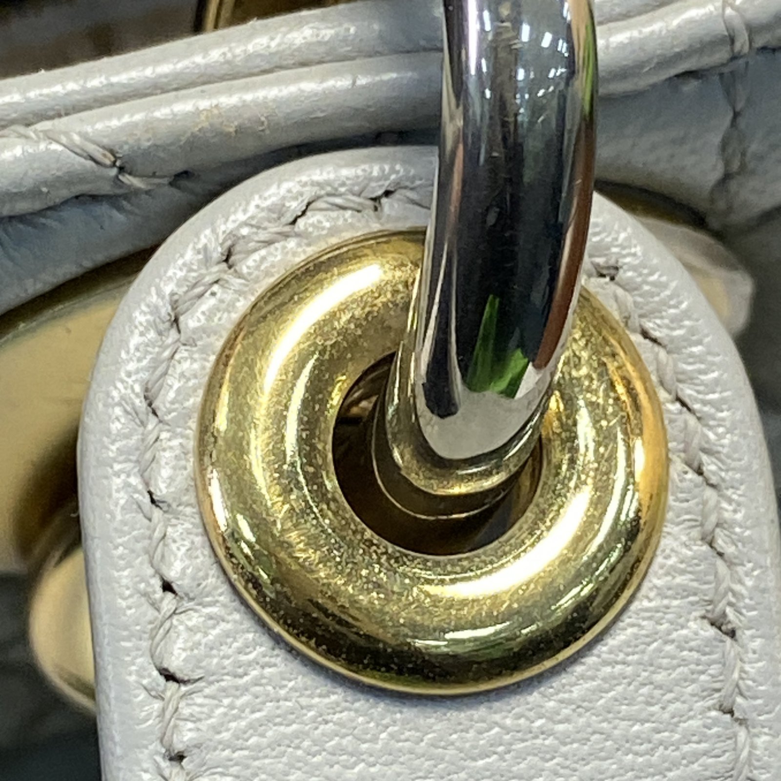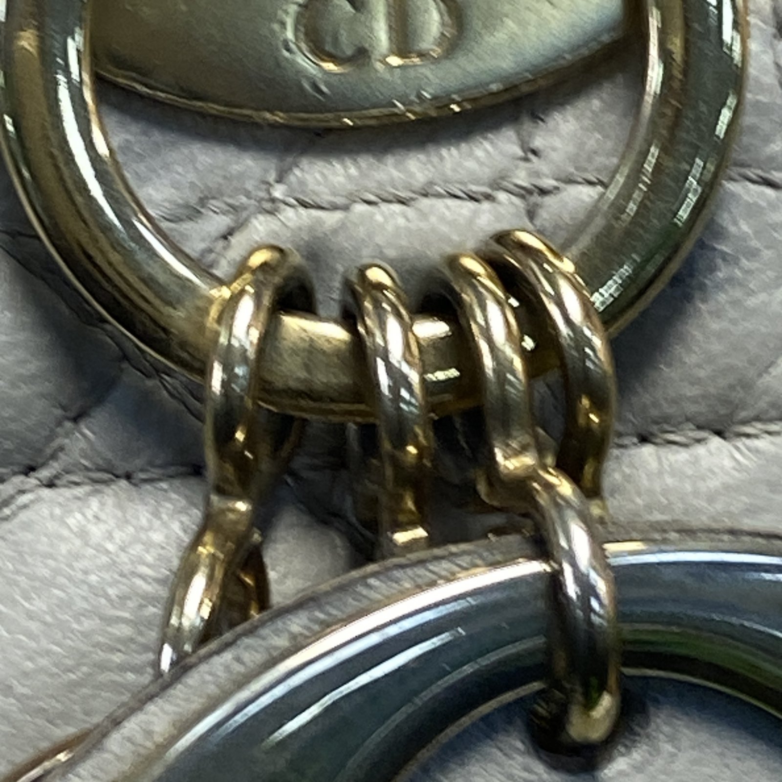 Crafted from gray leather with iconic Cannage stitching, this Lady Dior 4-grid bag features top handles and a detachable strap, a timeless luxury icon.