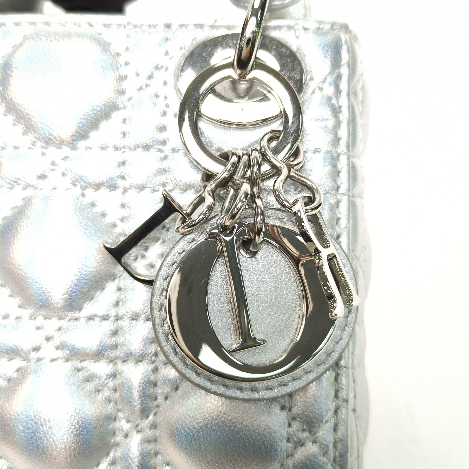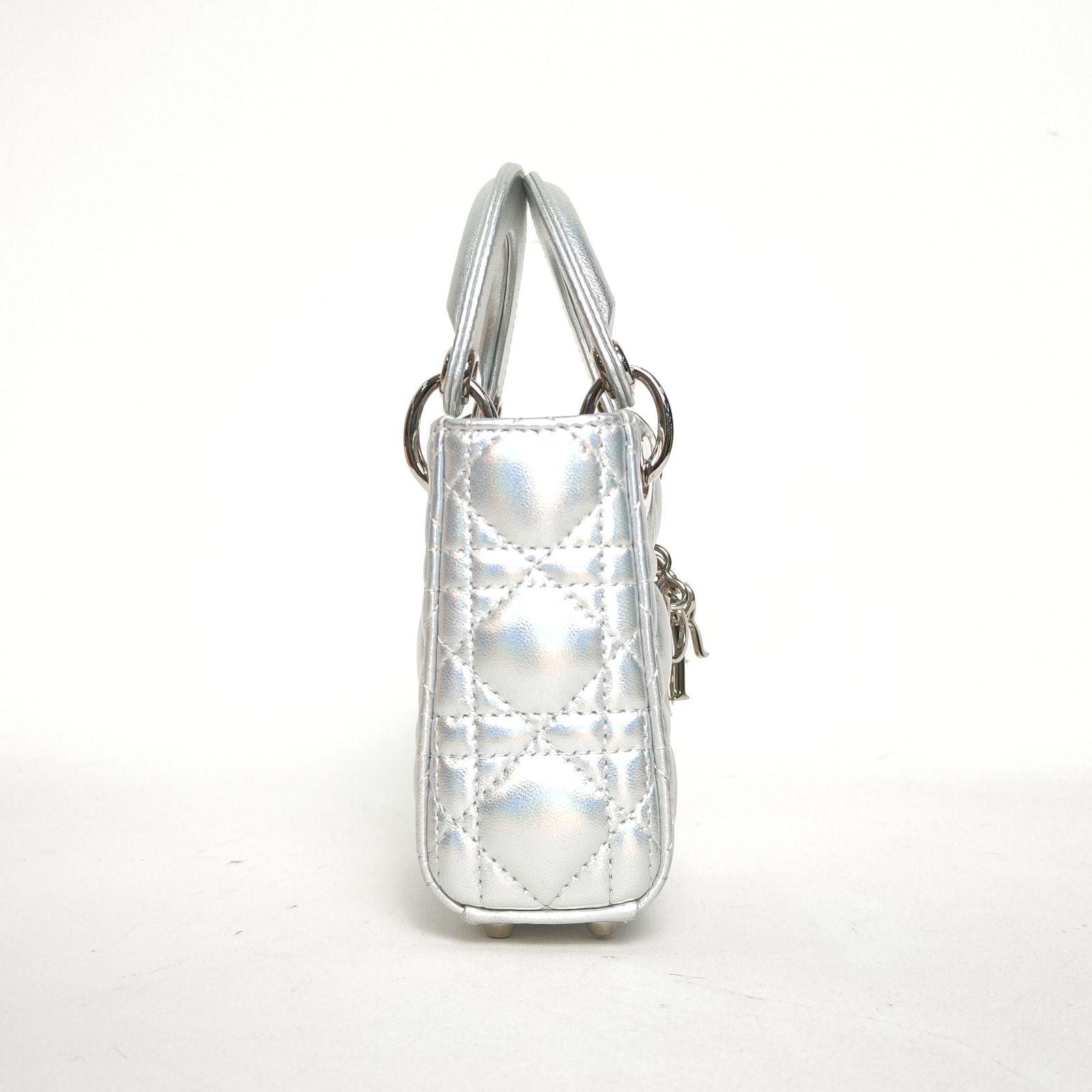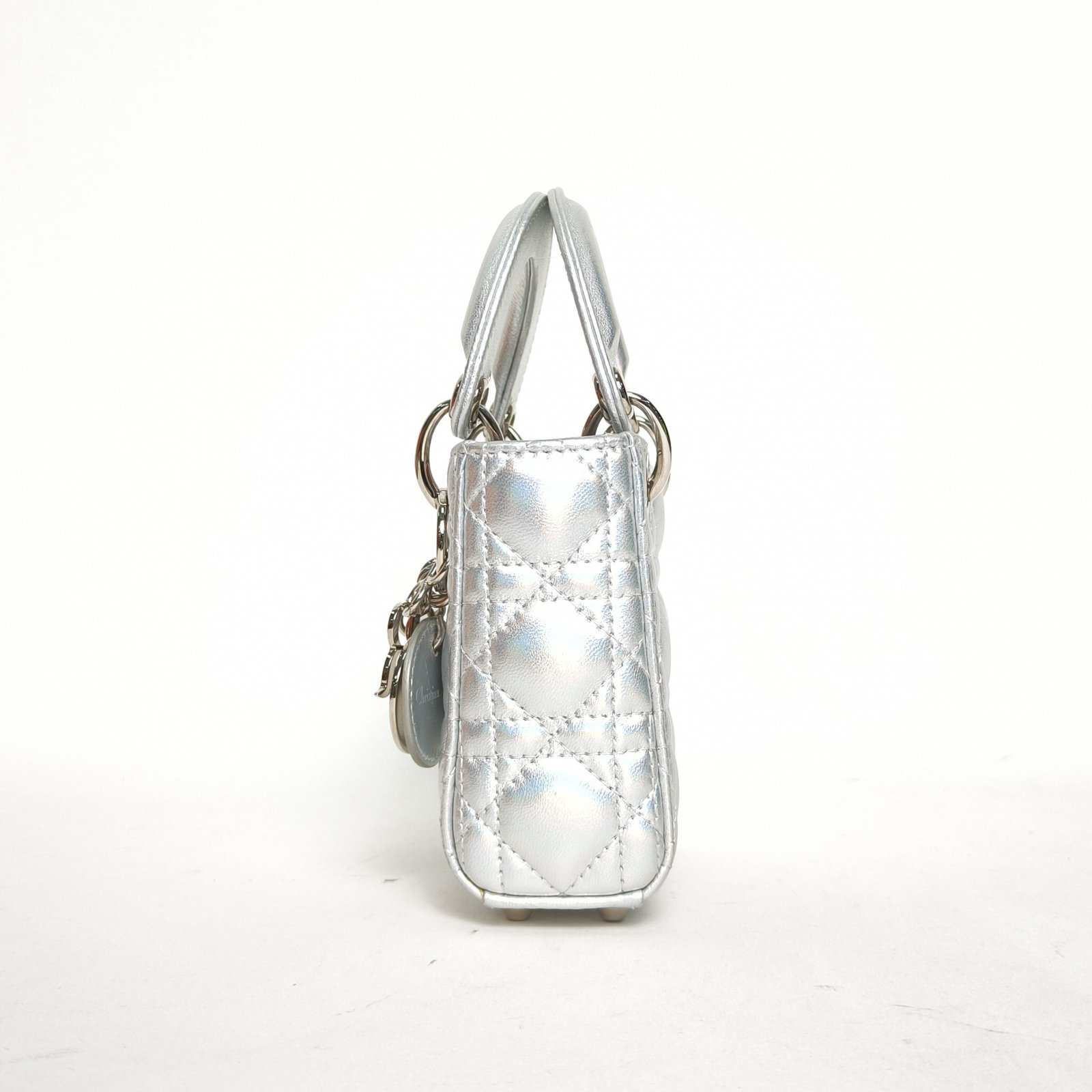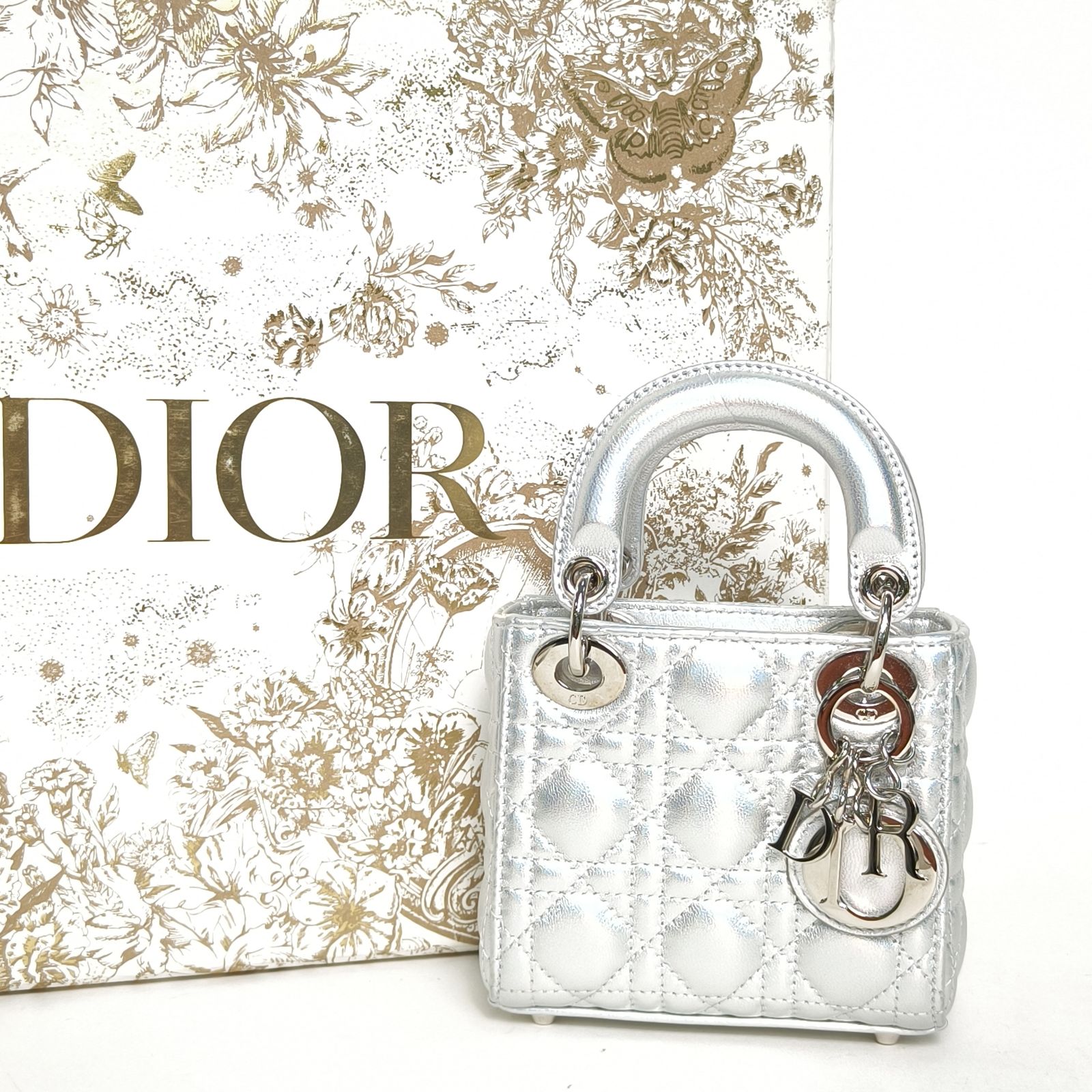 Crafted from silver leather with iconic Cannage stitching, this Lady Dior micro bag features a top handle and chain strap, a cute collectible luxury piece.