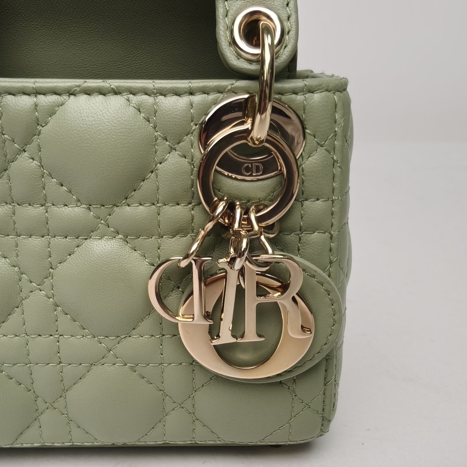 Crafted from mint green leather with iconic Cannage stitching, this Lady Dior mini 12cm bag features top handles and a detachable strap, a cute daily luxury piece.