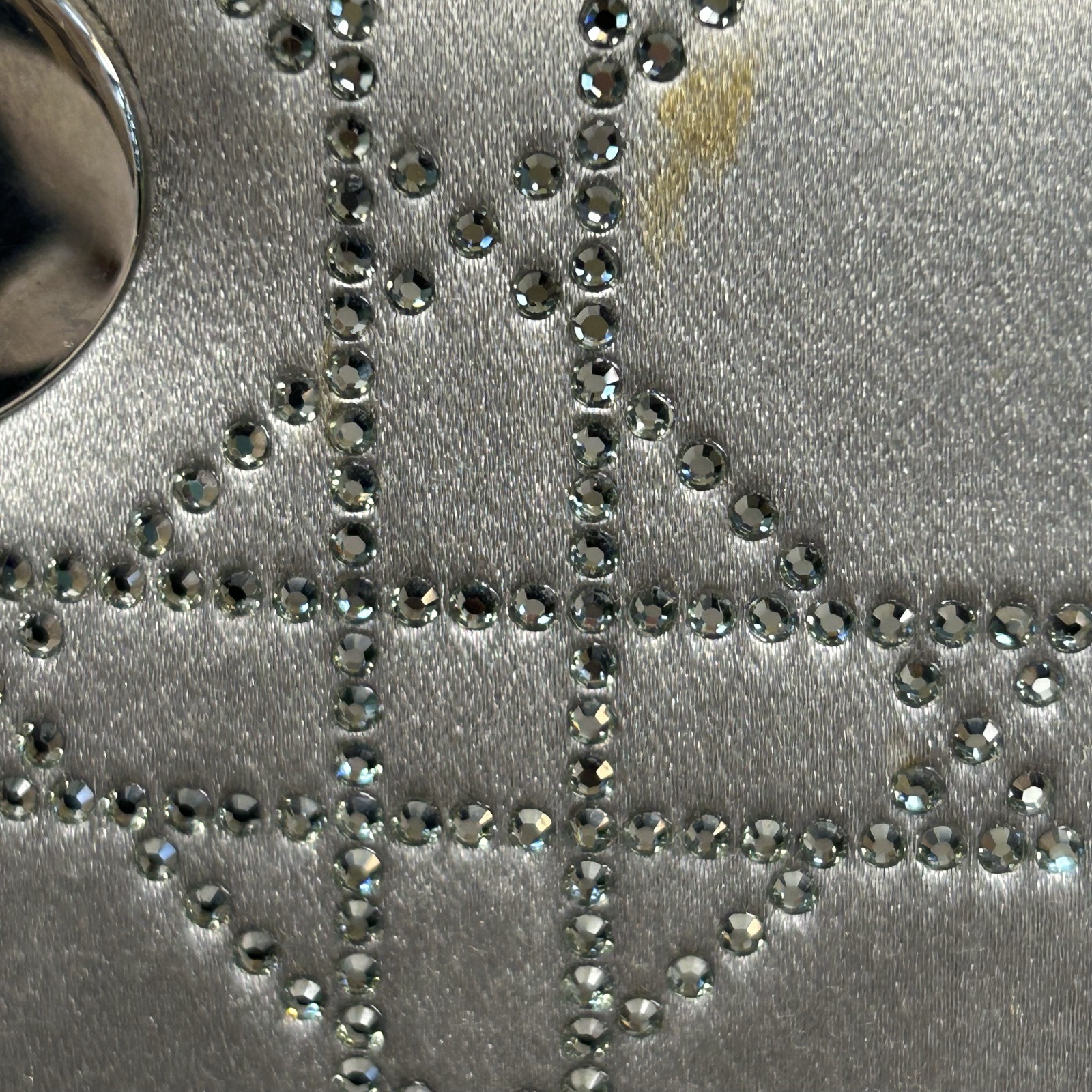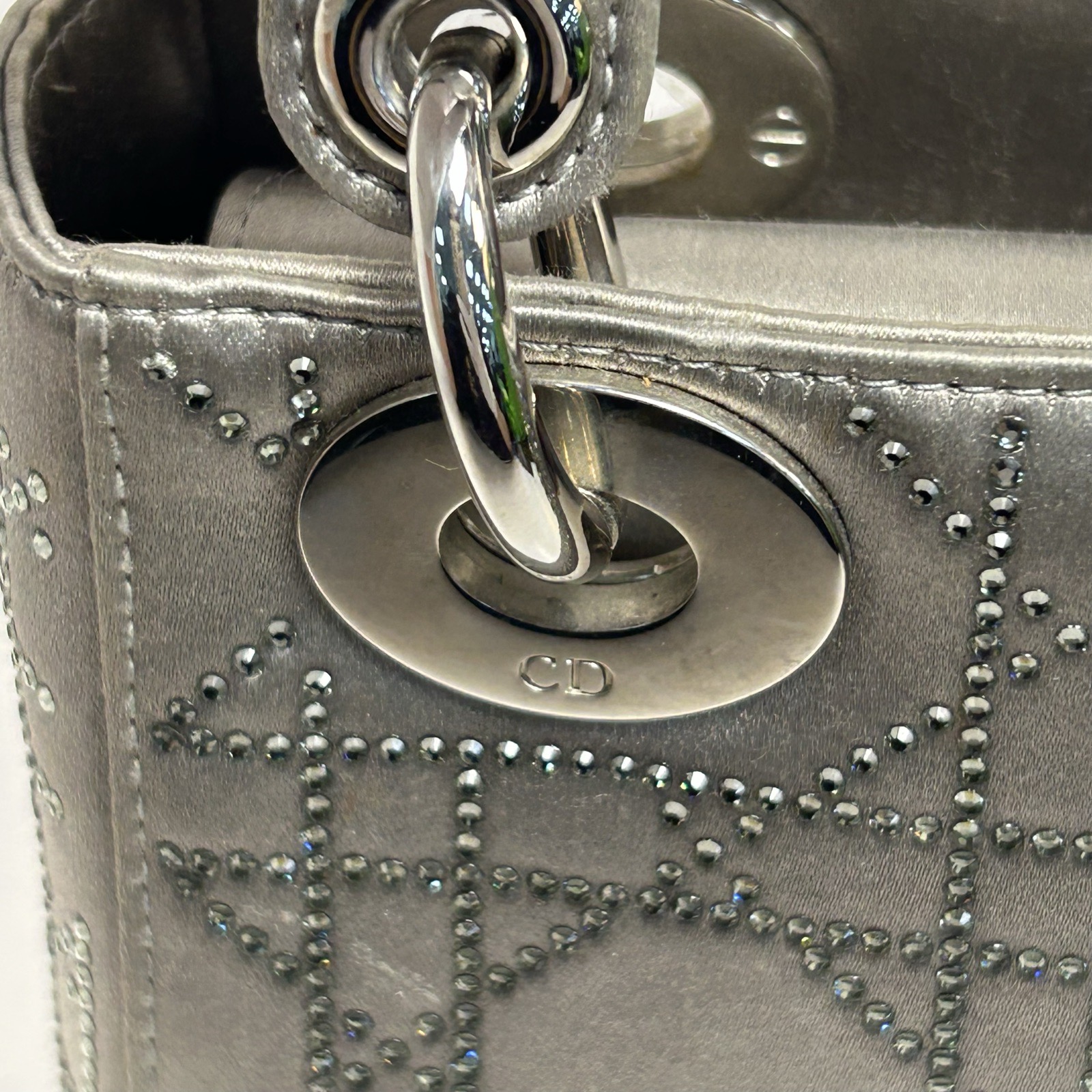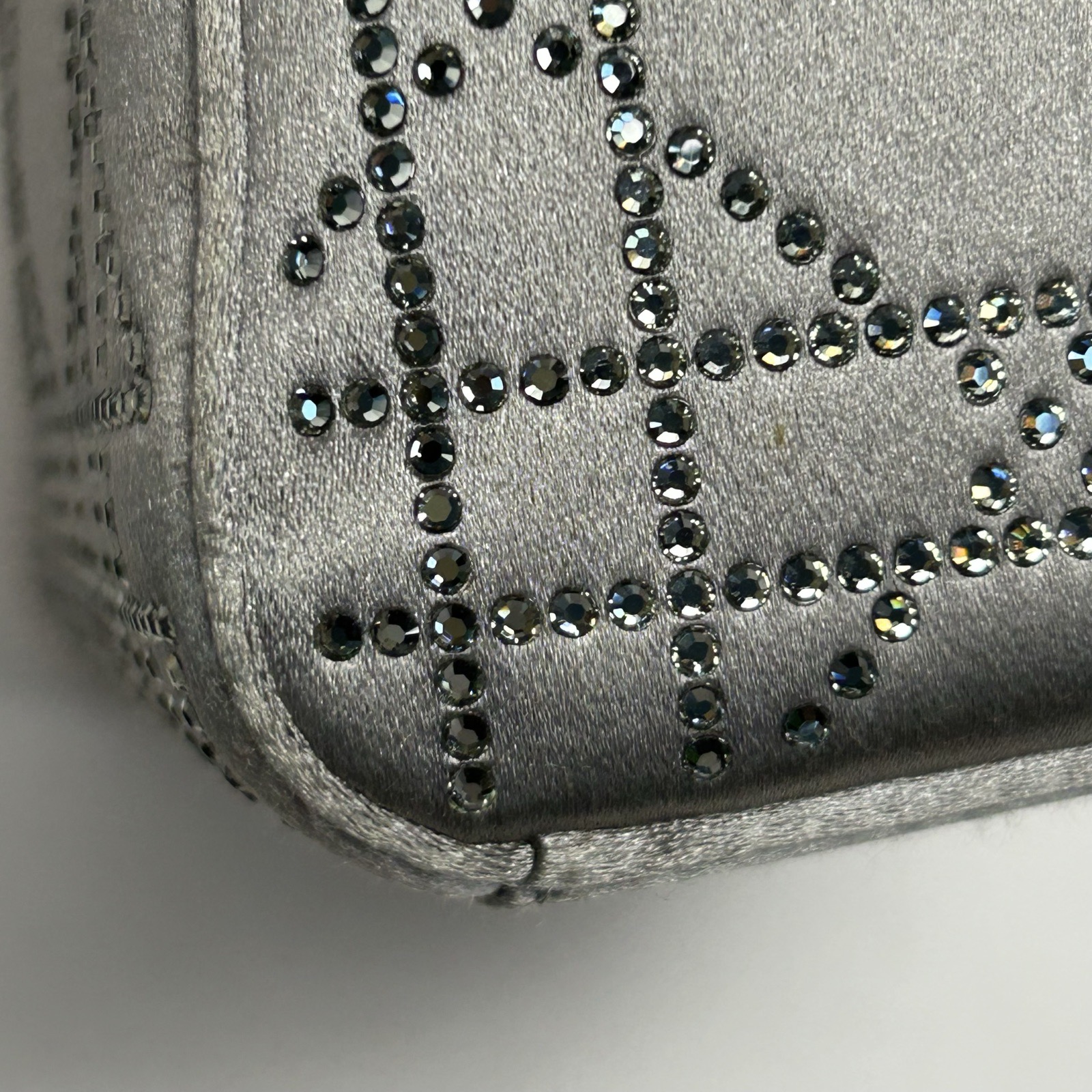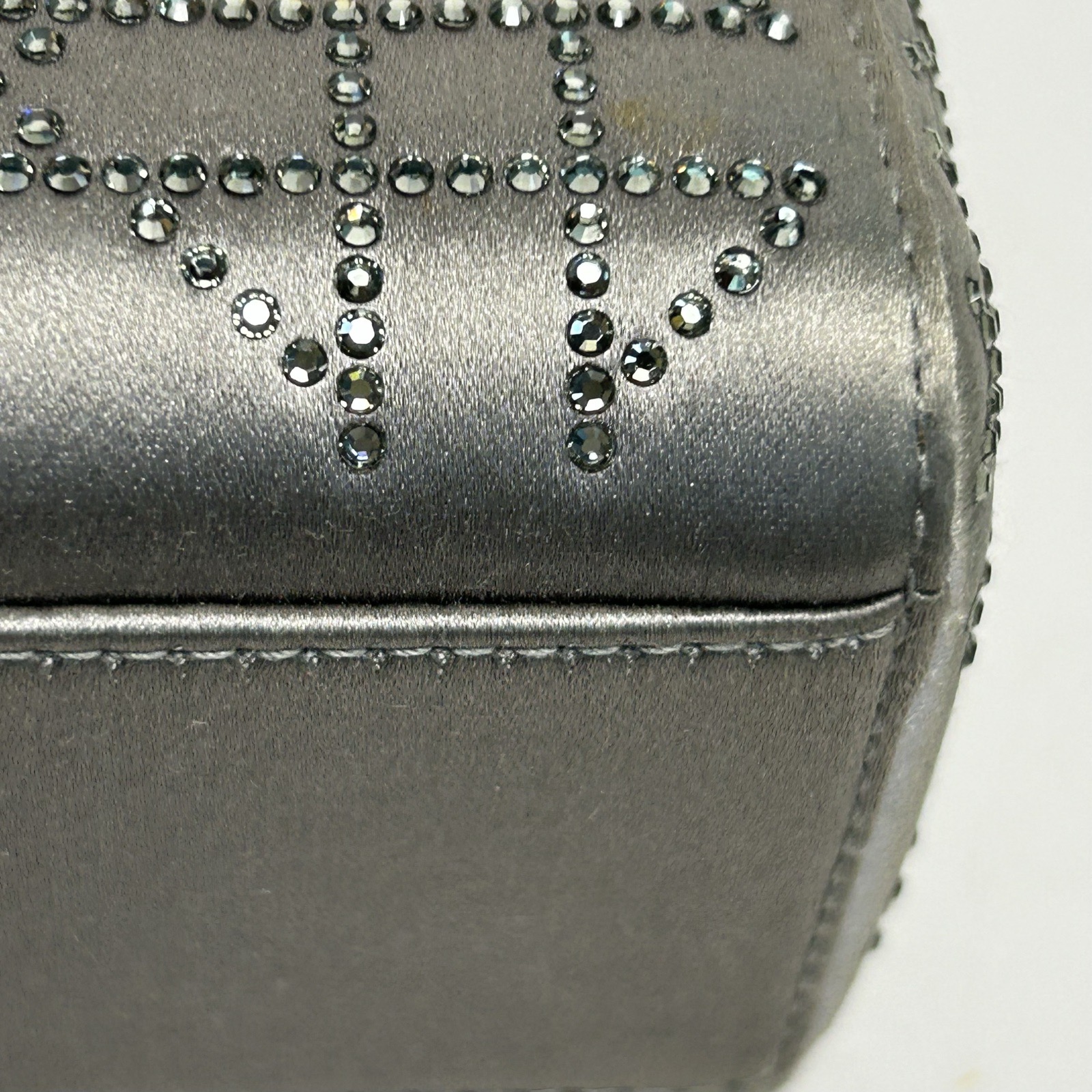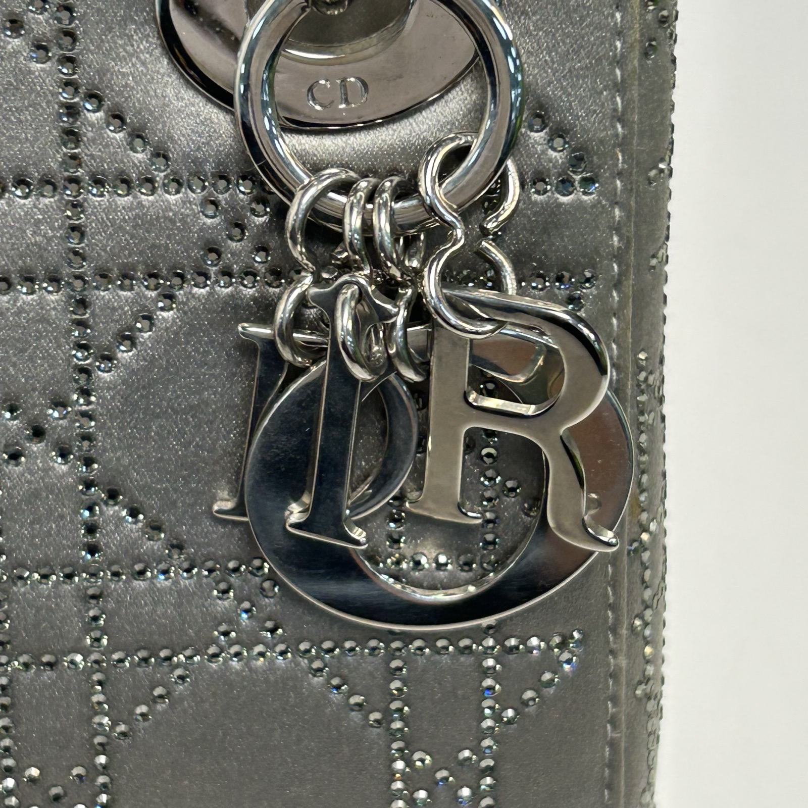 Embodying A glamorous iteration of the classic Lady Dior, this three-piece handbag features luxurious gray satin with sparkling crystal embellishments and polished silver hardware. The iconic cannage quilting and 2015 date code make it a sophisticated statement piece for special occasions.