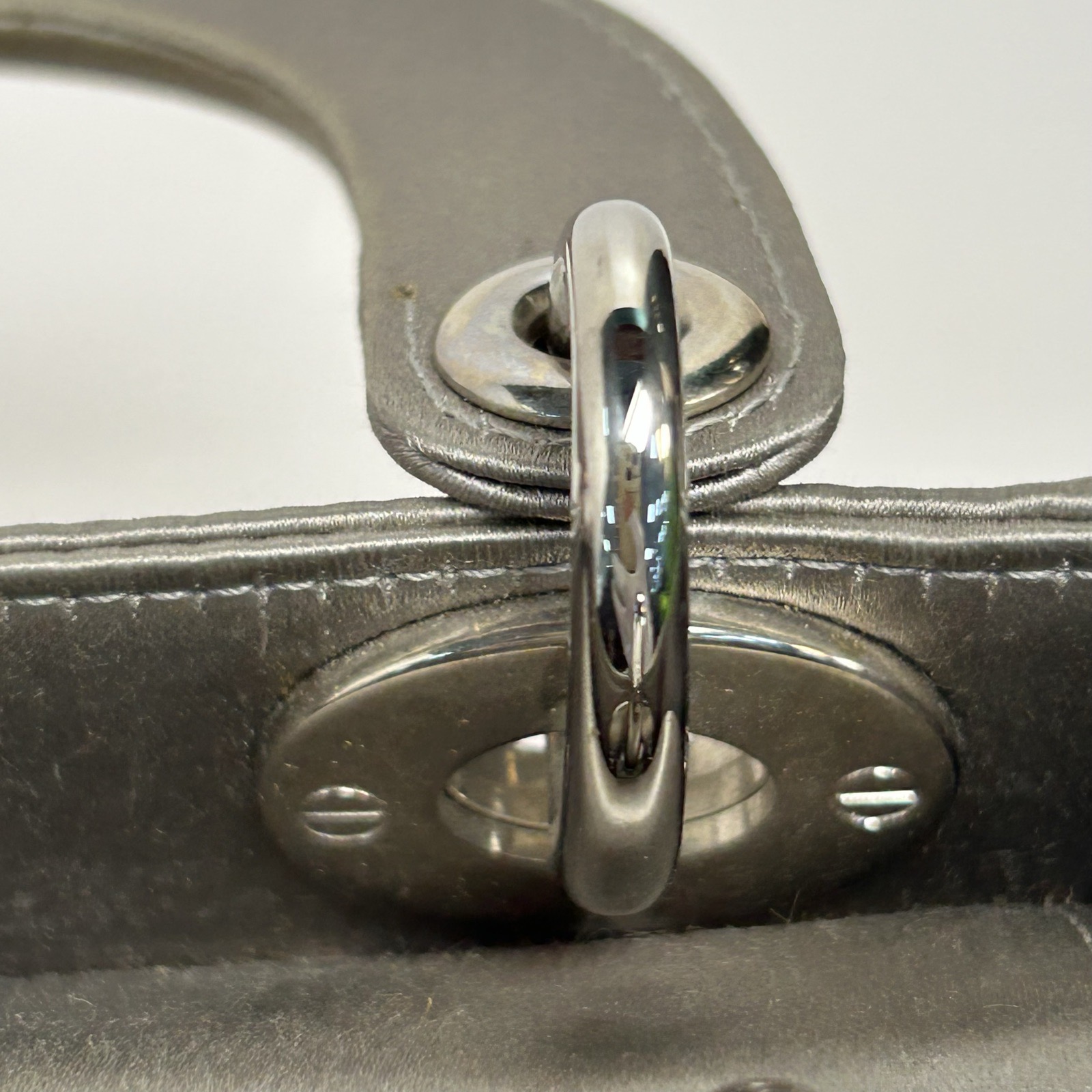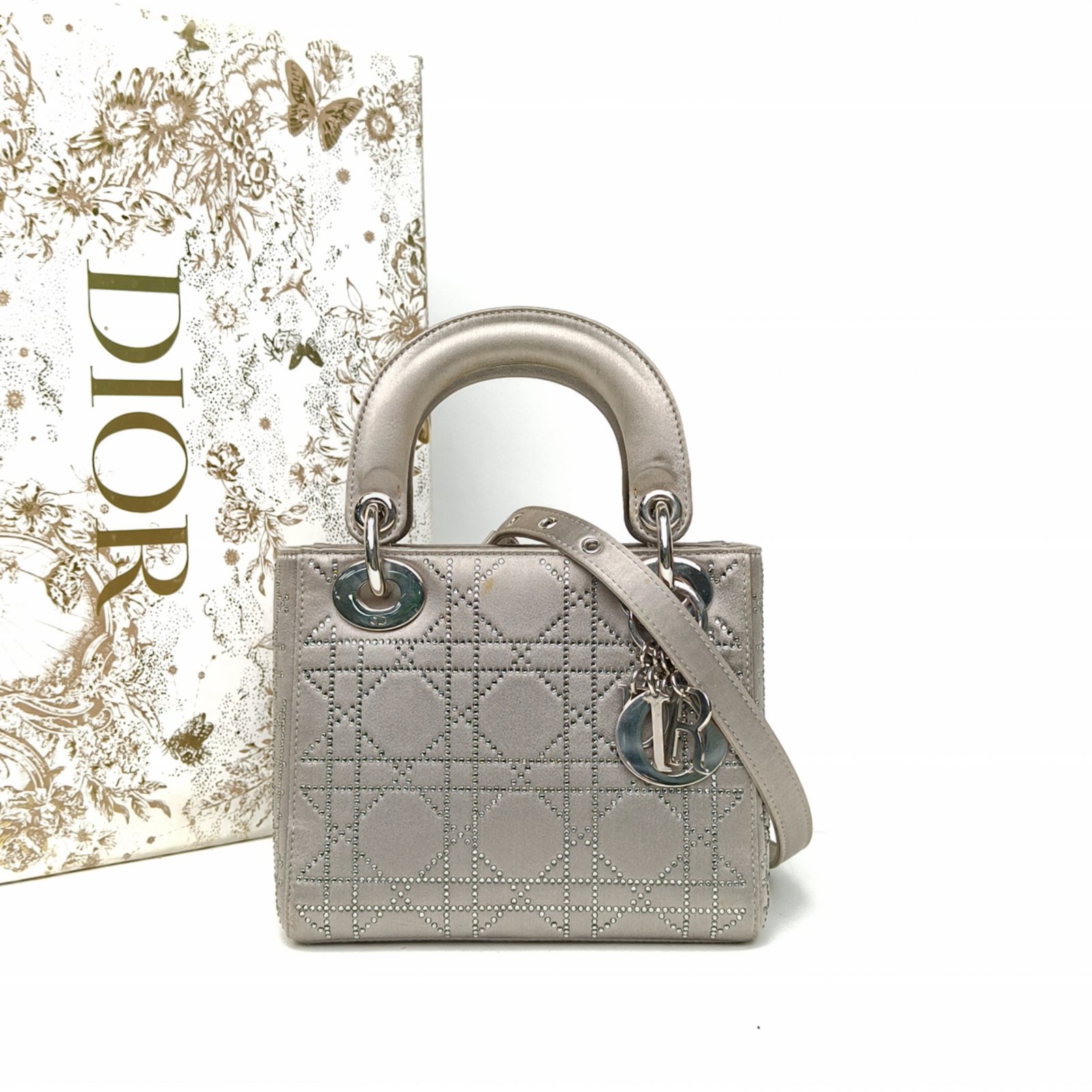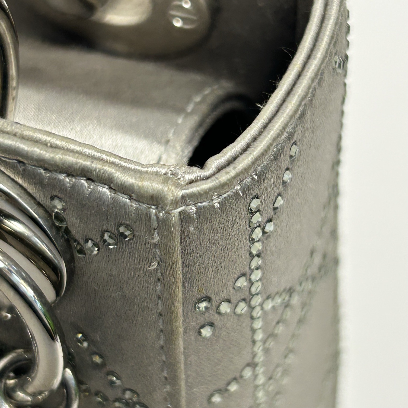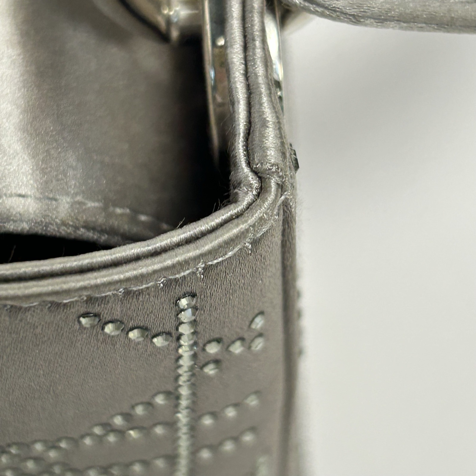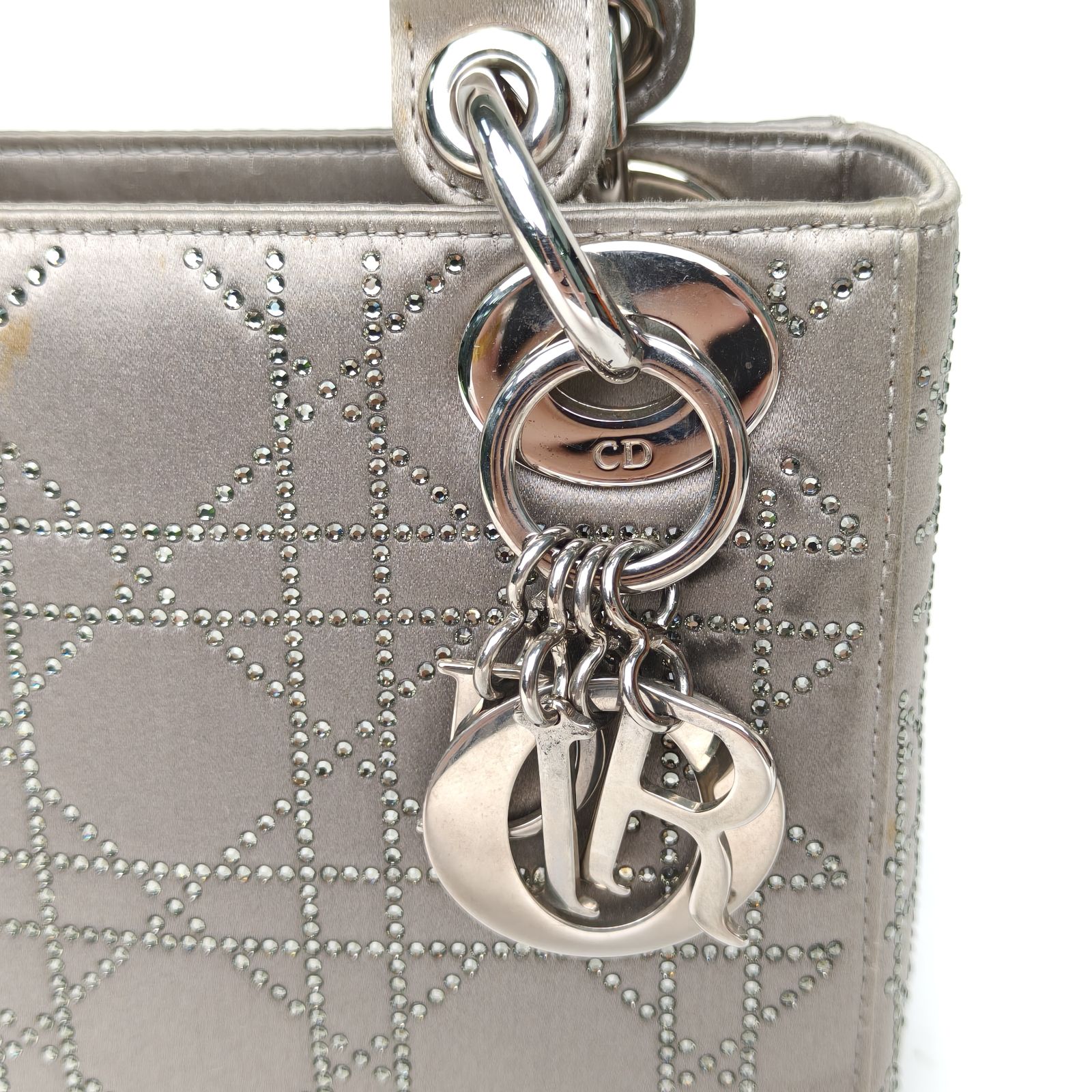 Embodying A glamorous iteration of the classic Lady Dior, this three-piece handbag features luxurious gray satin with sparkling crystal embellishments and polished silver hardware. The iconic cannage quilting and 2015 date code make it a sophisticated statement piece for special occasions.