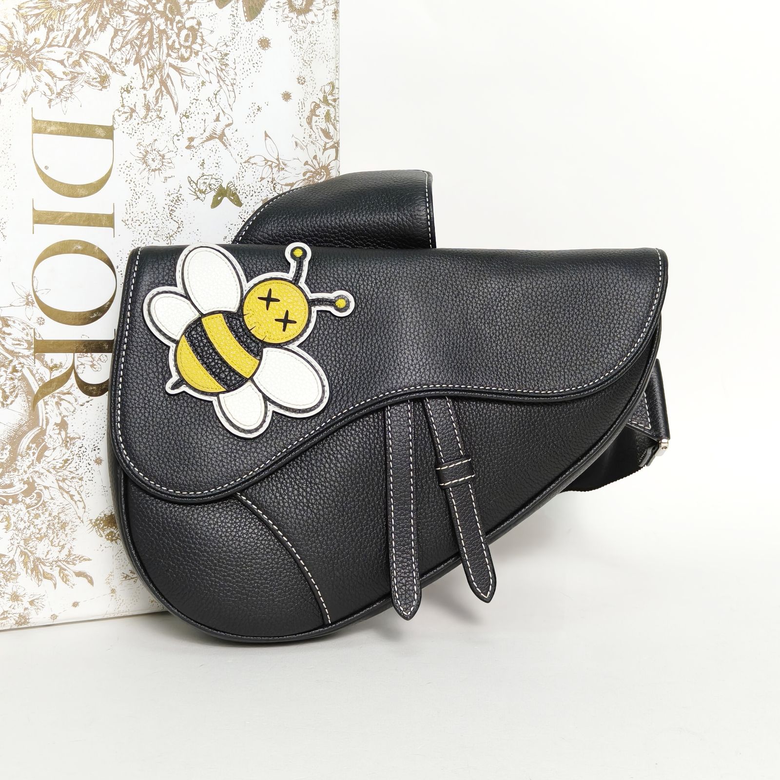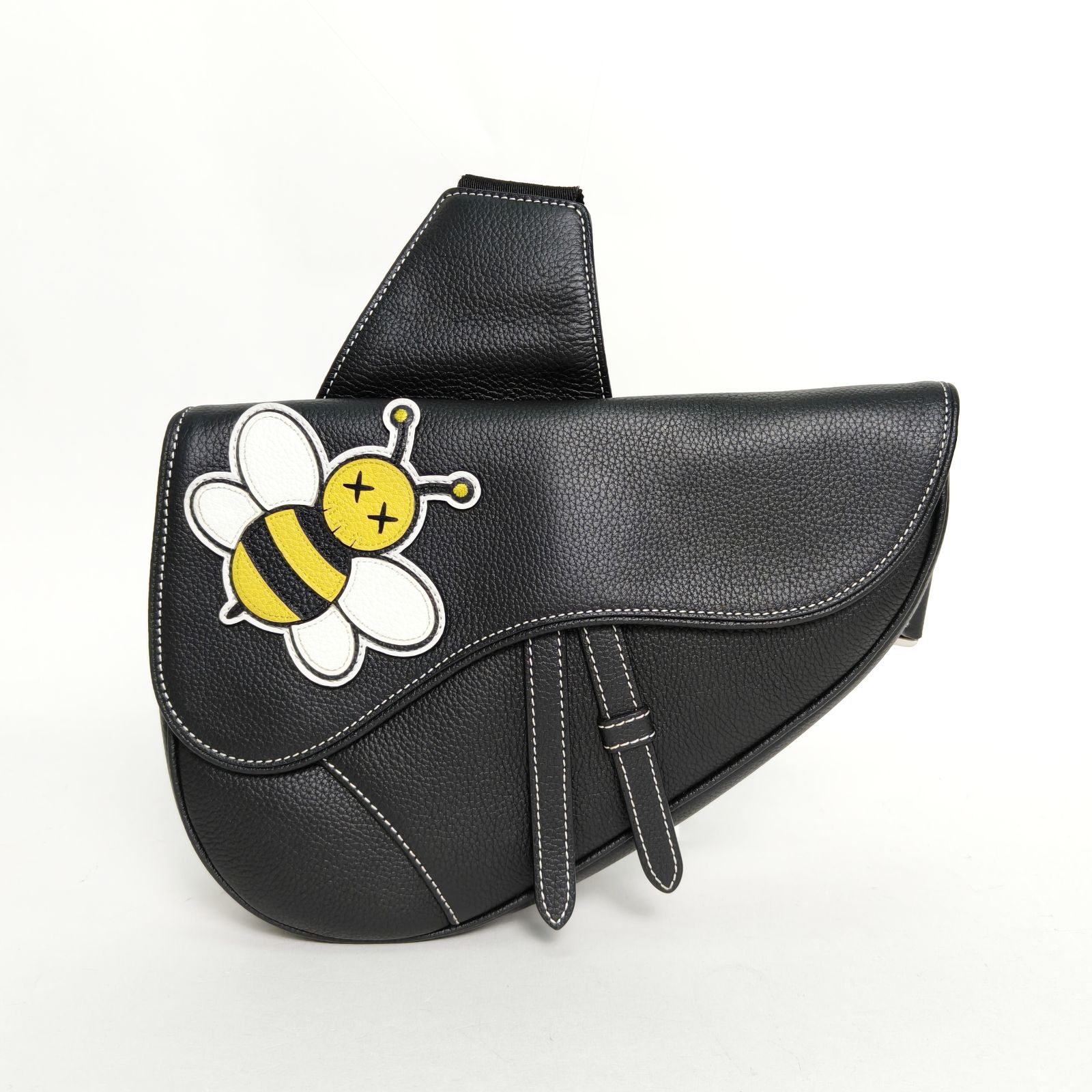 Made from black leather with playful Kaws bee embroidery, this saddle chest bag features a structured shape and silver-tone hardware, blending streetwear edge with Dior’s equestrian heritage.