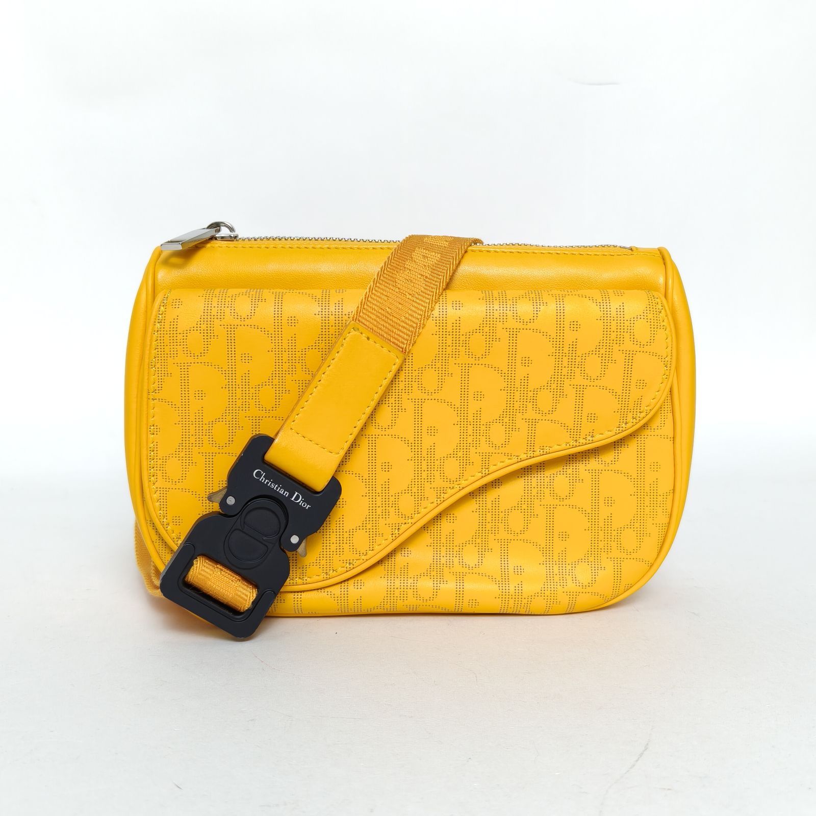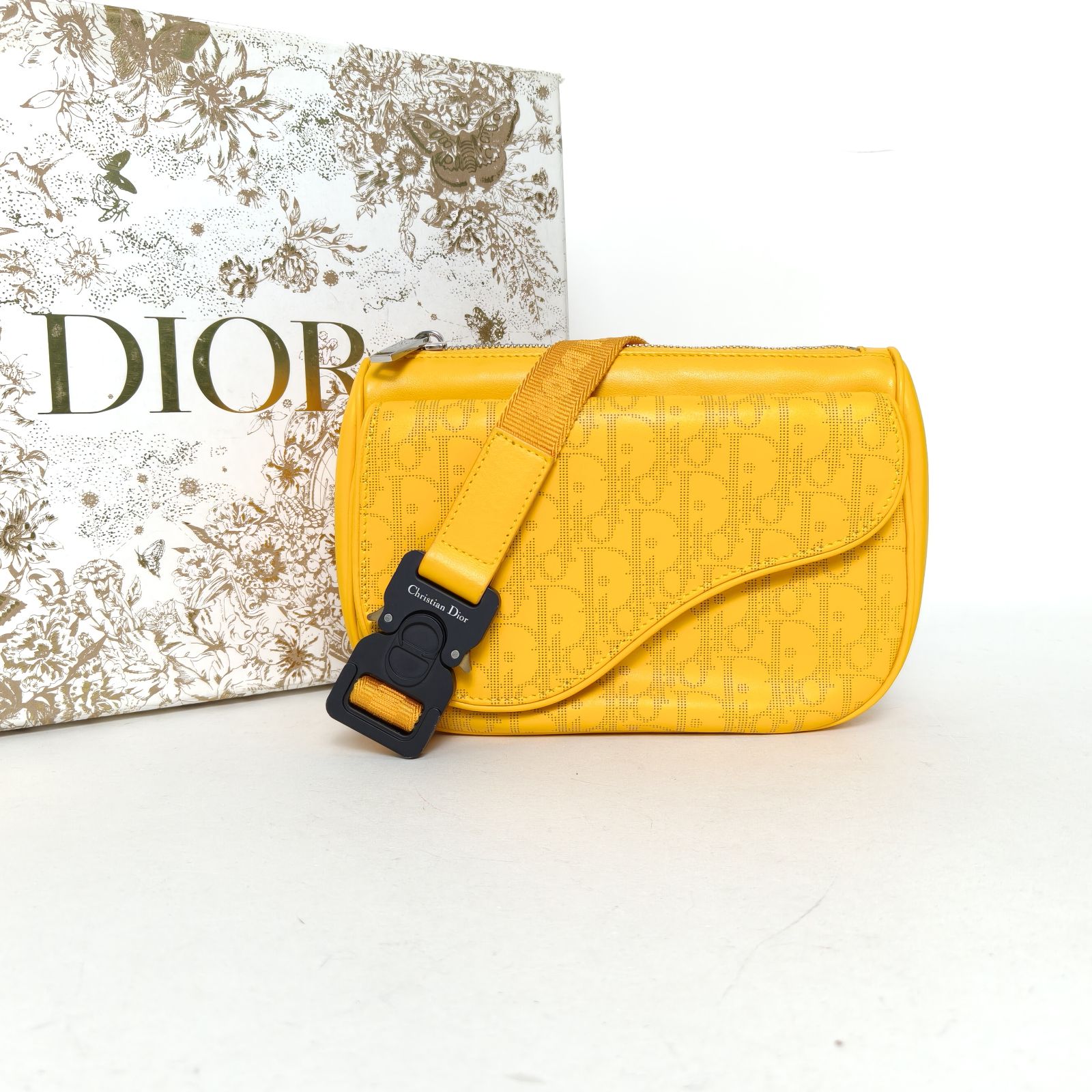 Crafted from yellow leather with Dior Oblique print and silver-tone hardware, this saddle waist bag features an adjustable strap and bold 2021 World Tour design.