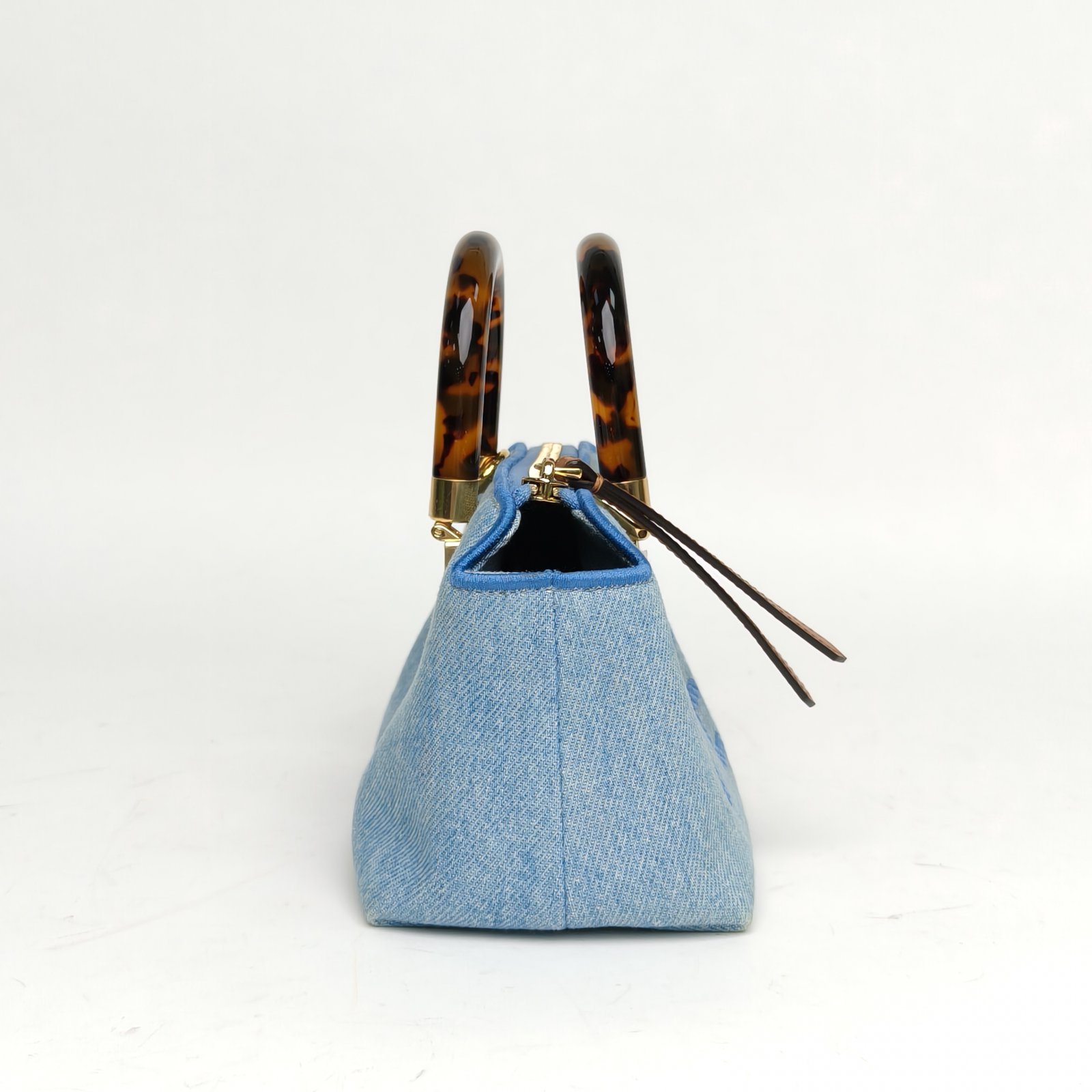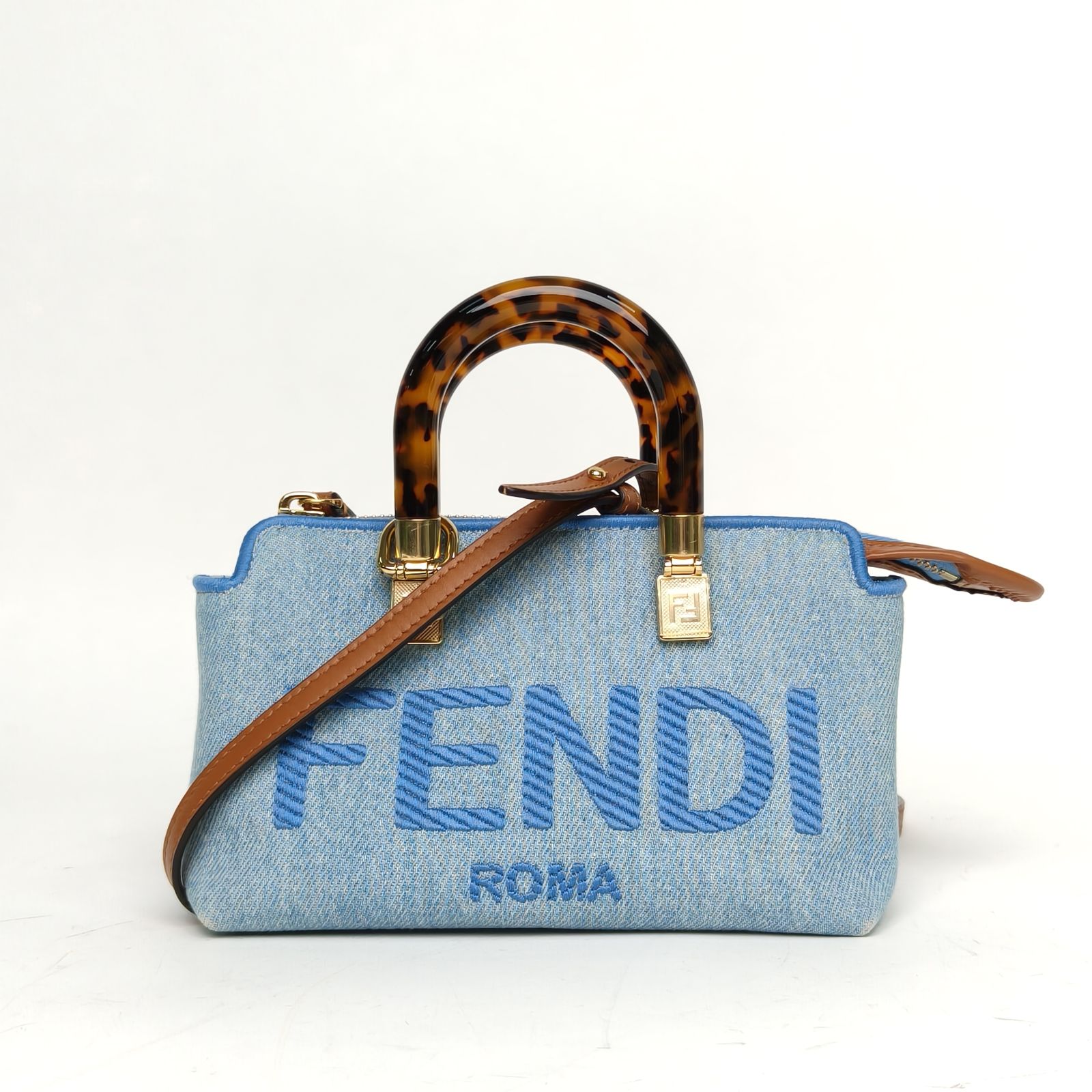 This Fendi BY THE WAY MINI features a casual denim blue canvas with bold embossed branding, capturing the brand’s playful yet sophisticated Italian aesthetic. The structured silhouette balances relaxed charm and refined luxury, suitable for everyday wear and versatile styling. The tortoiseshell handle adds a distinctive, vintage-inspired touch, making it a standout piece that embodies Fendi’s creative spirit.
