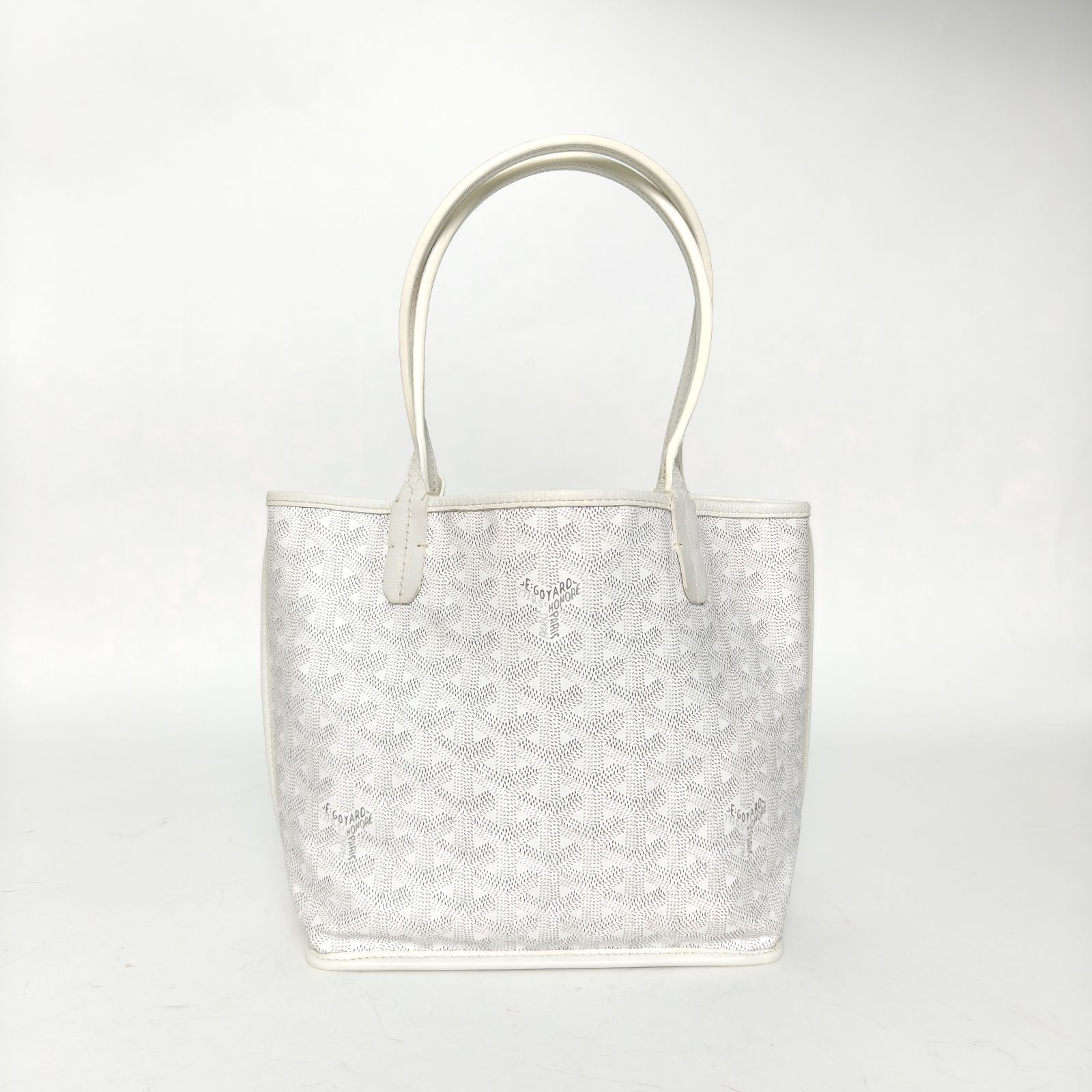 This Goyard Anjou Mini 20 reversible tote bag is crafted from white Goyardine canvas and leather with silver-tone hardware, featuring a reversible design and spacious silhouette.