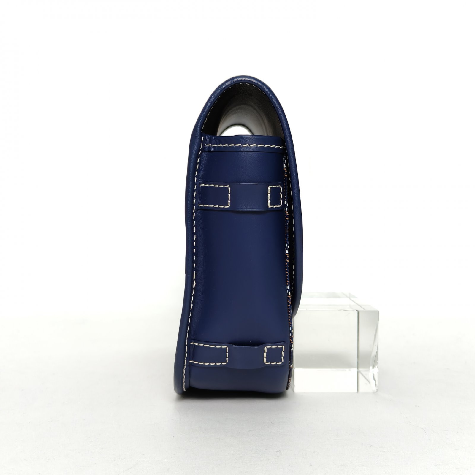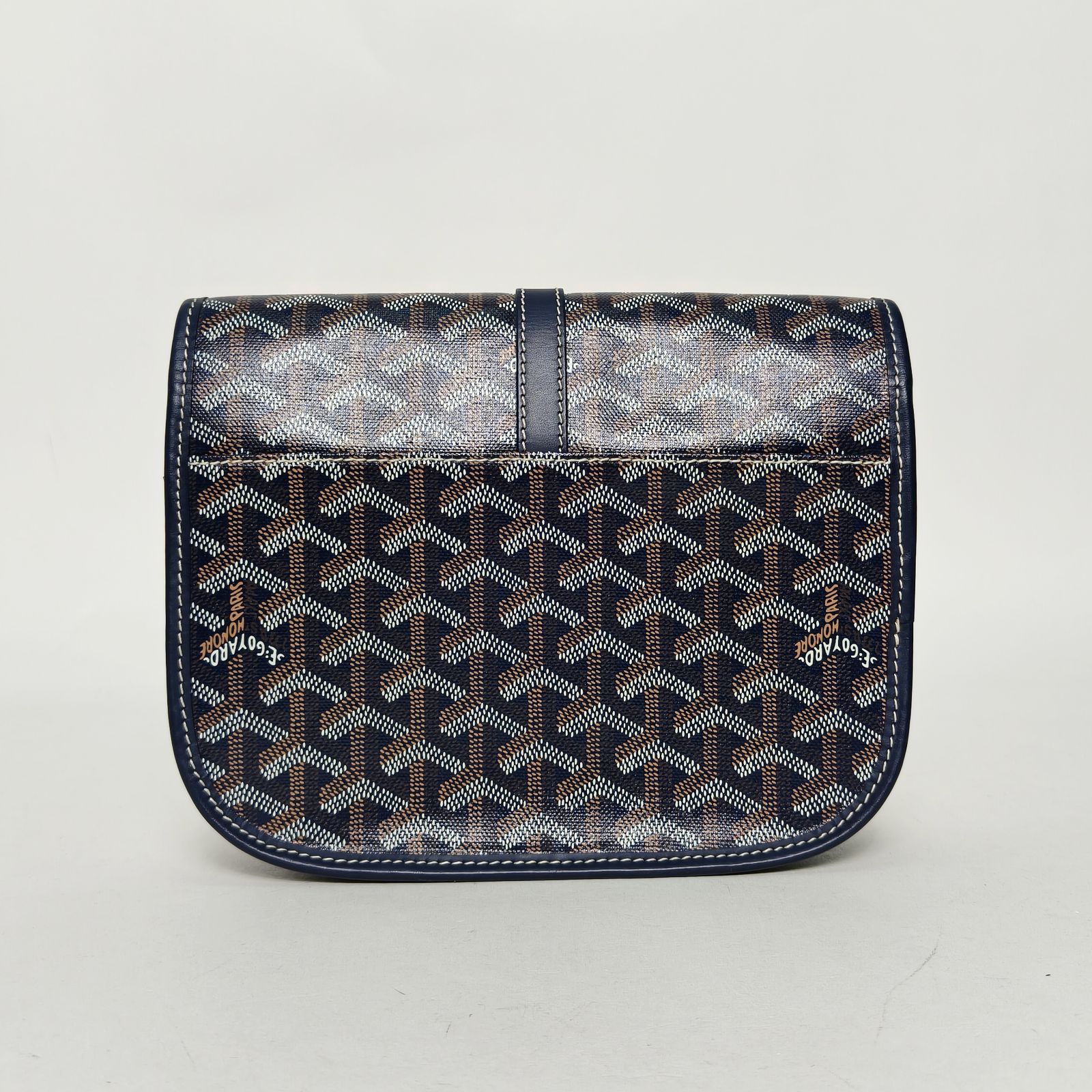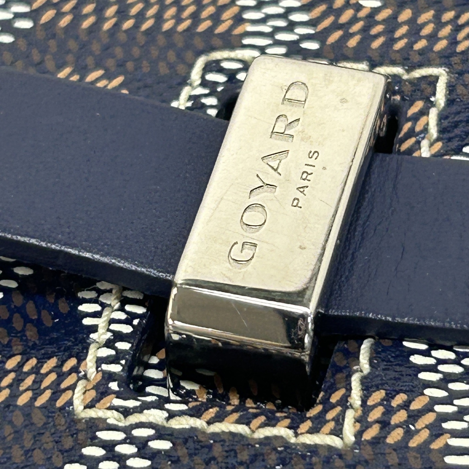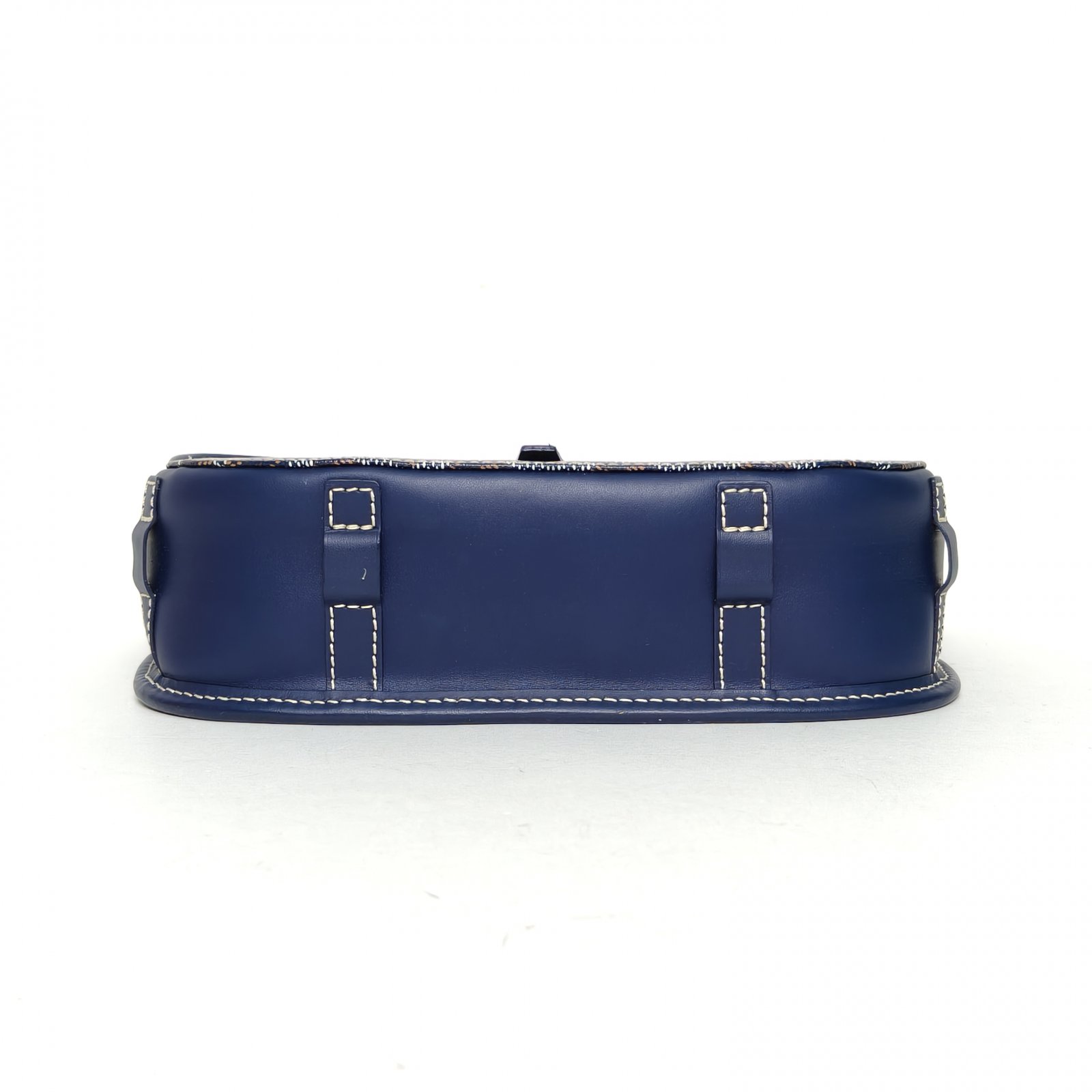 Crafted from blue Goyardine PVC with leather trim, this Belvedere II PM messenger bag features a detachable strap and gold-tone hardware, embodying Goyard’s timeless craftsmanship.