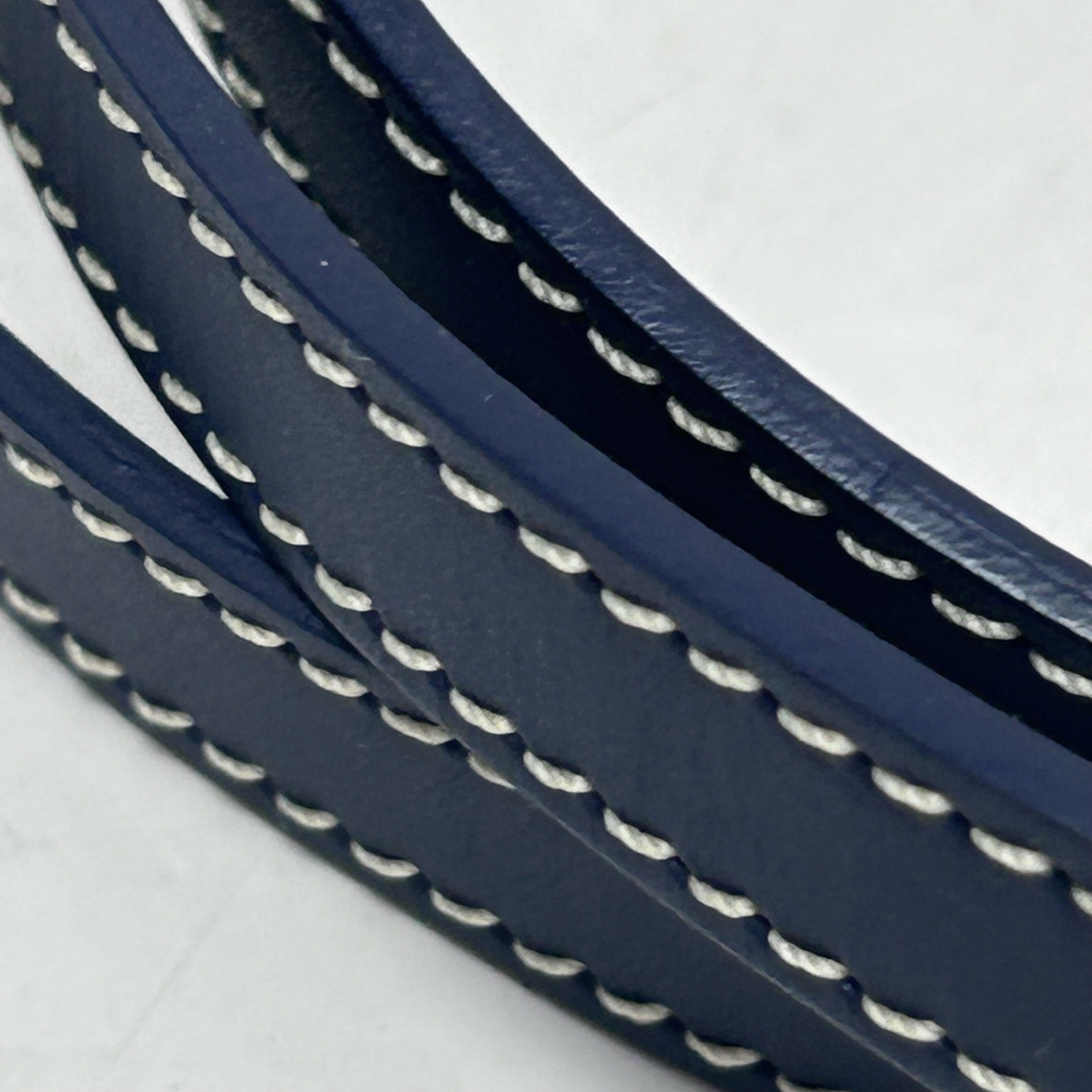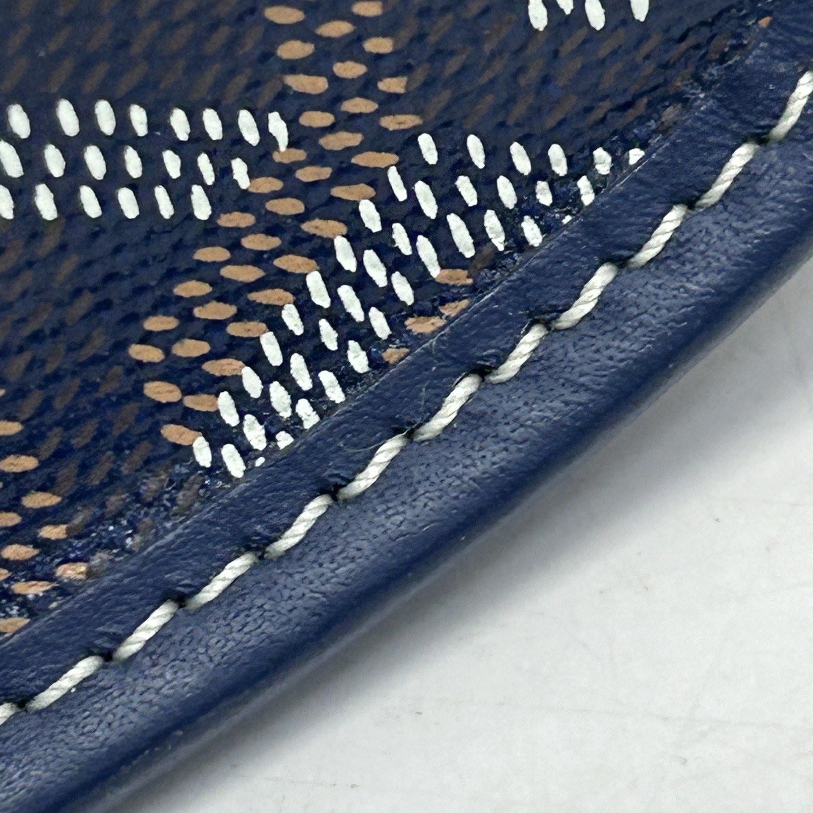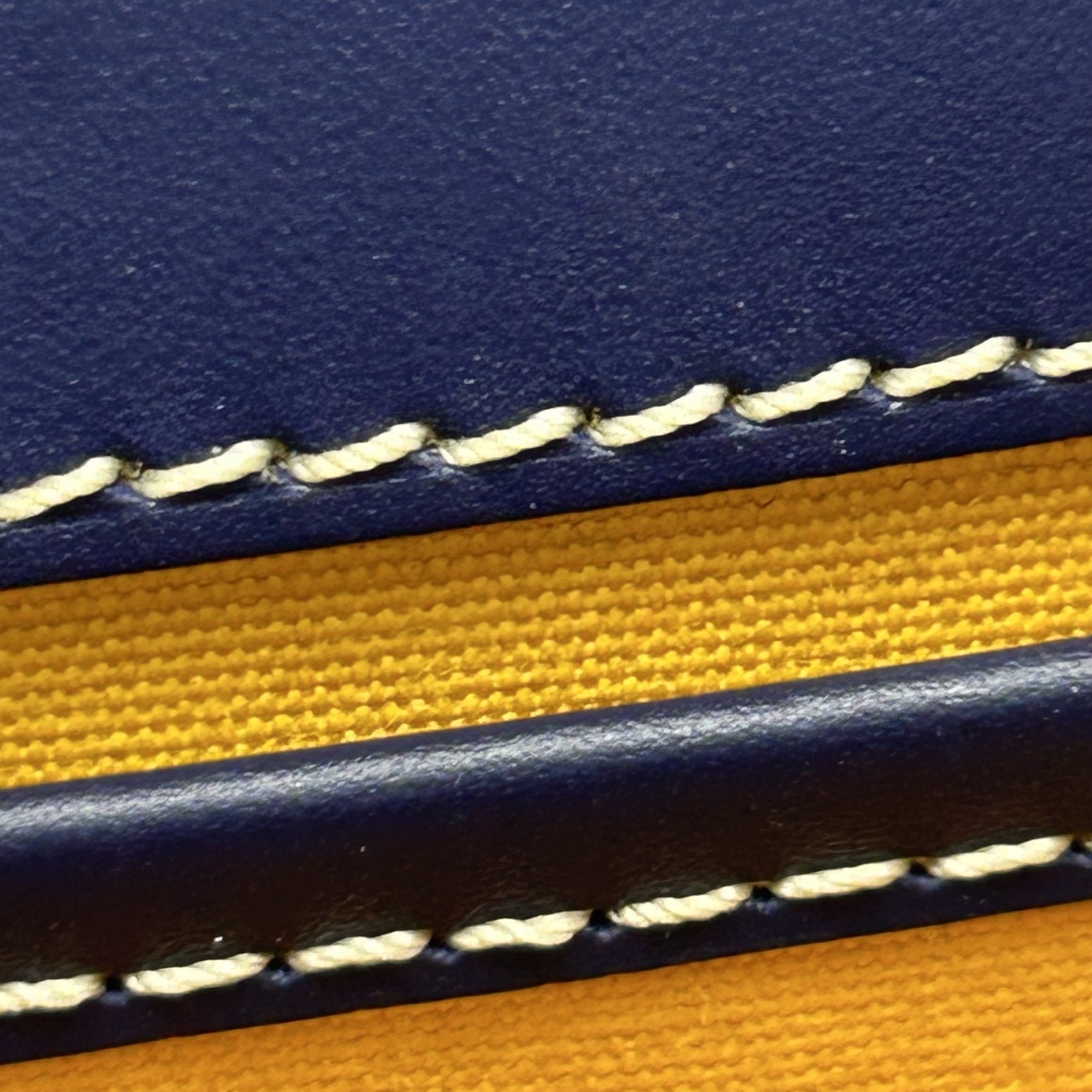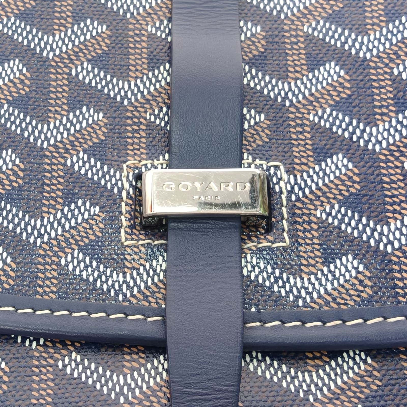 Crafted from blue Goyardine PVC with leather trim, this Belvedere II PM messenger bag features a detachable strap and gold-tone hardware, embodying Goyard’s timeless craftsmanship.