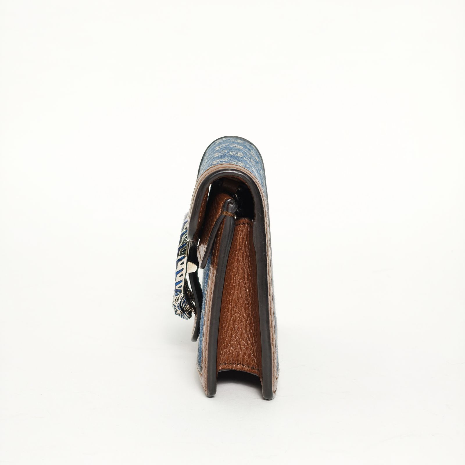 This Gucci Dionysus super mini 16.5cm bag is made of blue denim with silver-tone hardware, featuring the iconic tiger head clasp and chain strap.