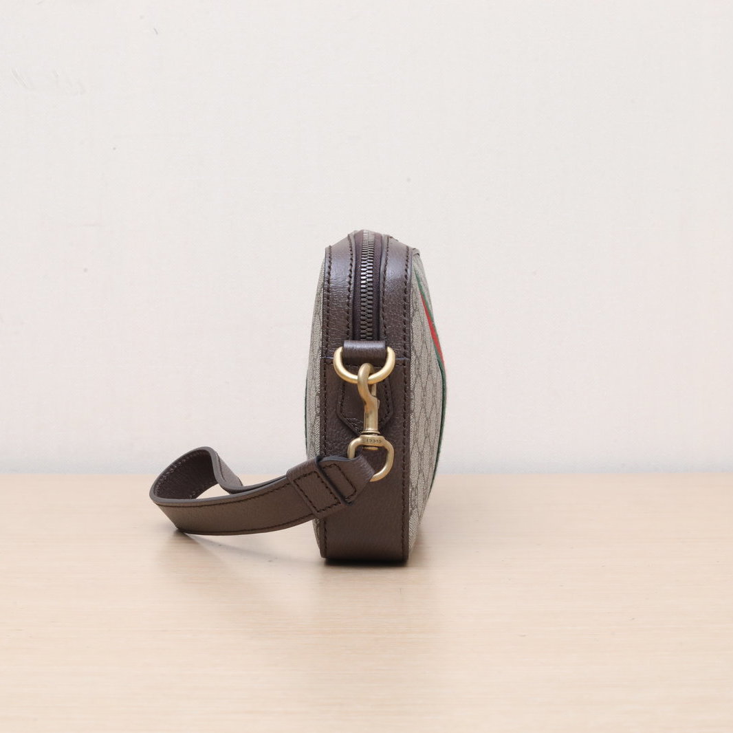 Crafted from monogram PVC with iconic GG logo and web stripe, this Ophidia camera bag features dual shoulder straps, a stylish Gucci piece for everyday carry.