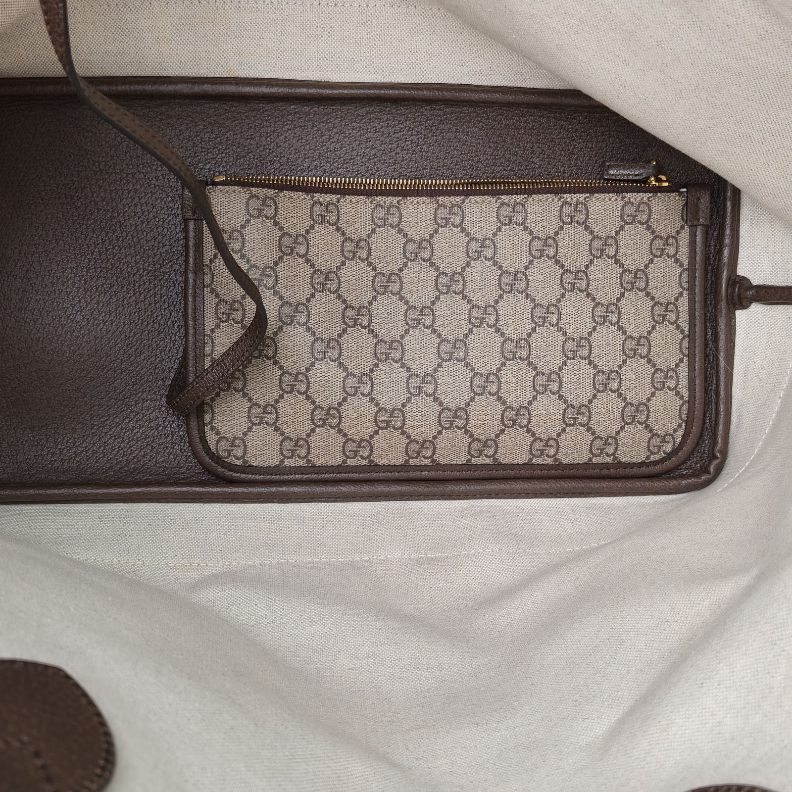 Crafted from durable PVC with iconic GG monogram and GUCCI hardware, this Ophidia tote bag features a top handle and detachable pouch, a stylish daily luxury piece.