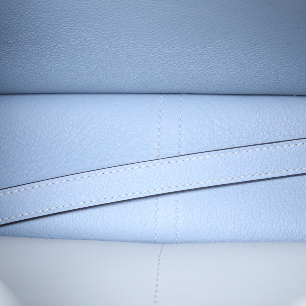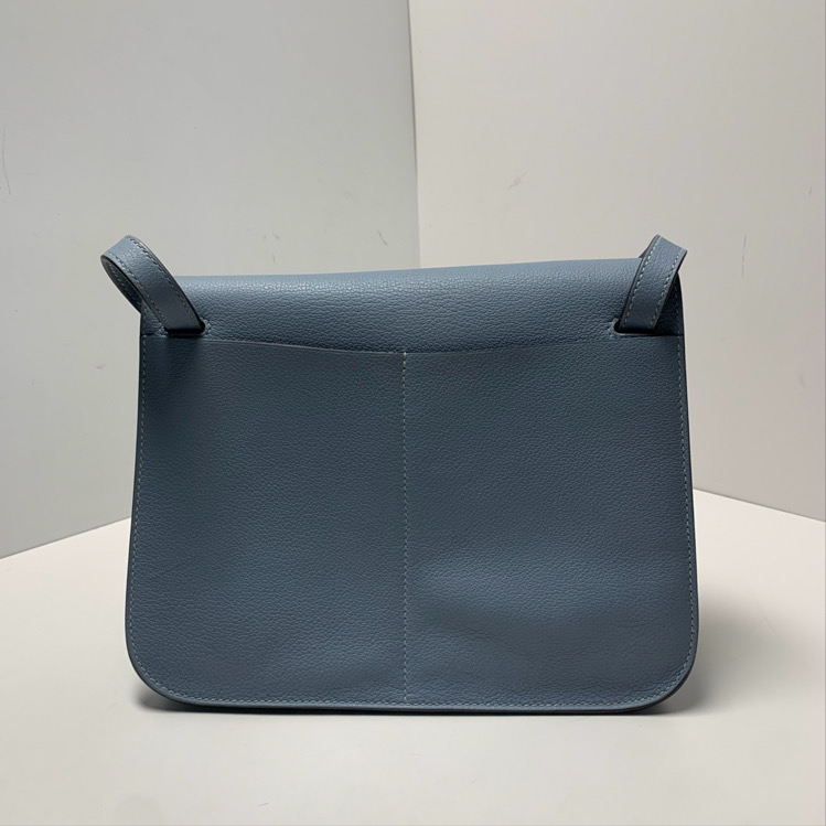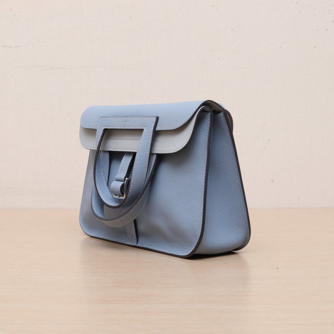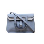 The Hermès Halzan leather handbag is a refined and understated top-handle satchel crafted from structured Taurillon calfskin featuring signature saddle stitching, clean lines and subtle flap closure, complete with sleek silver-tone hardware, exceptional French savoir-faire and sophisticated Hermès poise in serene Bleu Lin J7 blue. Feel free to click below for more consultation.