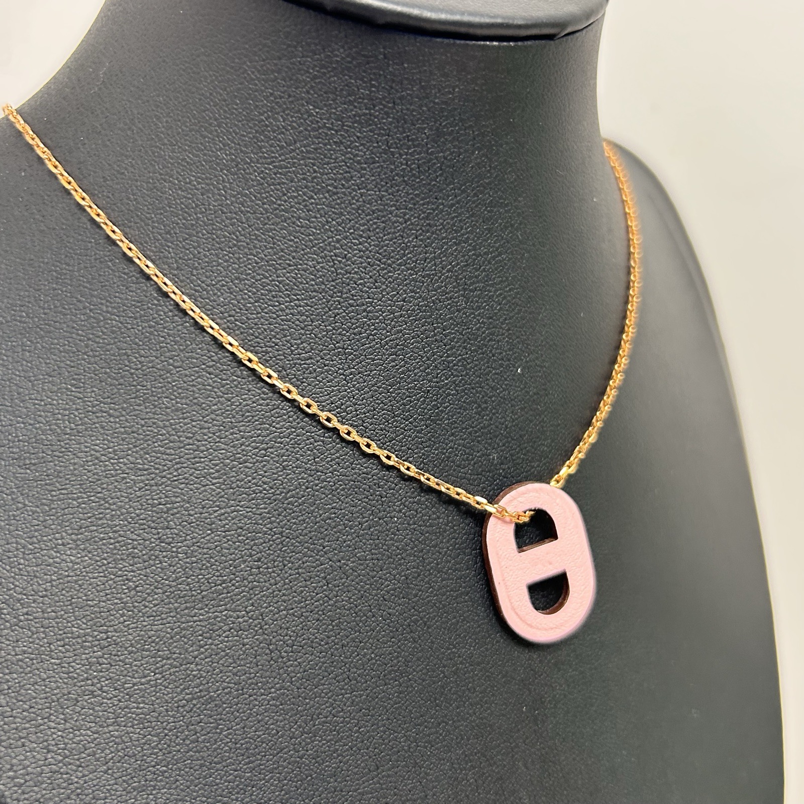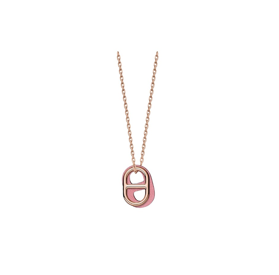 The Hermès O’Maillon necklace is a contemporary tribute to the iconic Chaine d’Ancre link, blending fine leatherwork with exquisite metal craftsmanship. This piece features a dual-pendant design: a signature gold-plated hardware link paired with a shadow pendant crafted from supple Rose Azalée Swift calfskin. The vibrant pink leather adds a playful yet sophisticated pop of color against the polished gold finish. Suspended from a delicate gold-plated chain, this necklace offers a lightweight and versatile aesthetic suitable for layering or making a subtle solo statement. It perfectly captures the equestrian heritage and modern minimalist elegance of the Maison, making it a timeless accessory for any Hermès enthusiast.