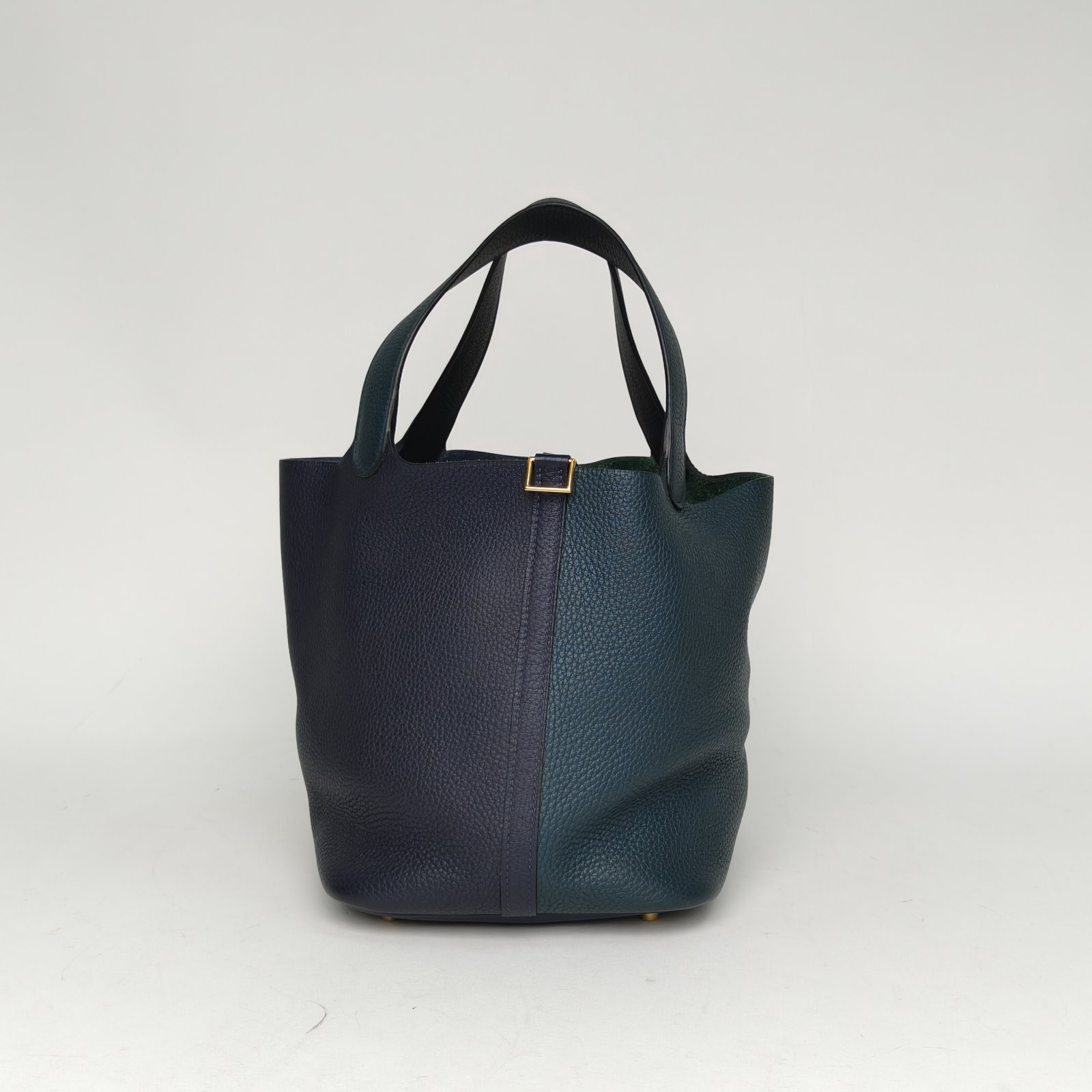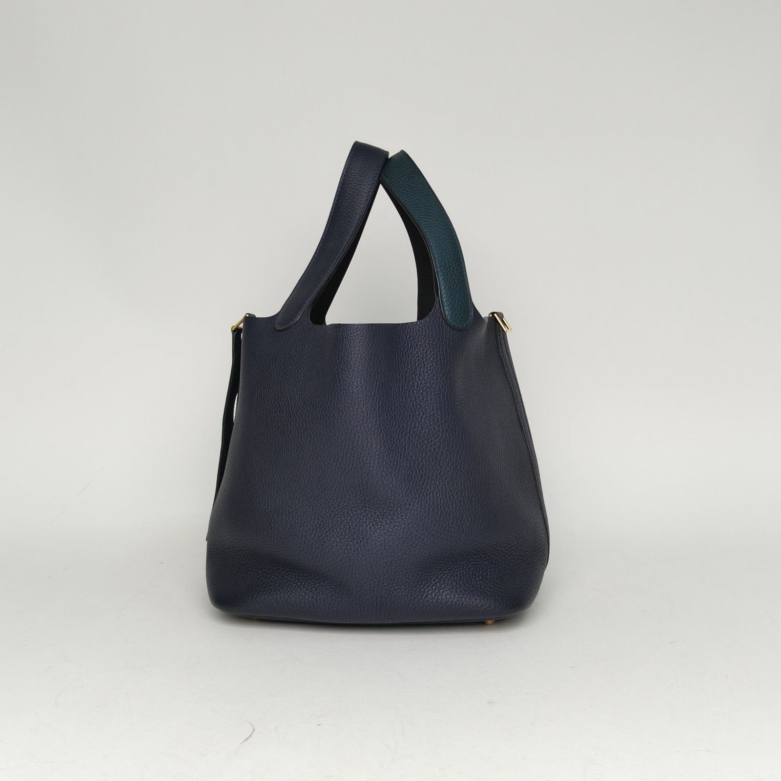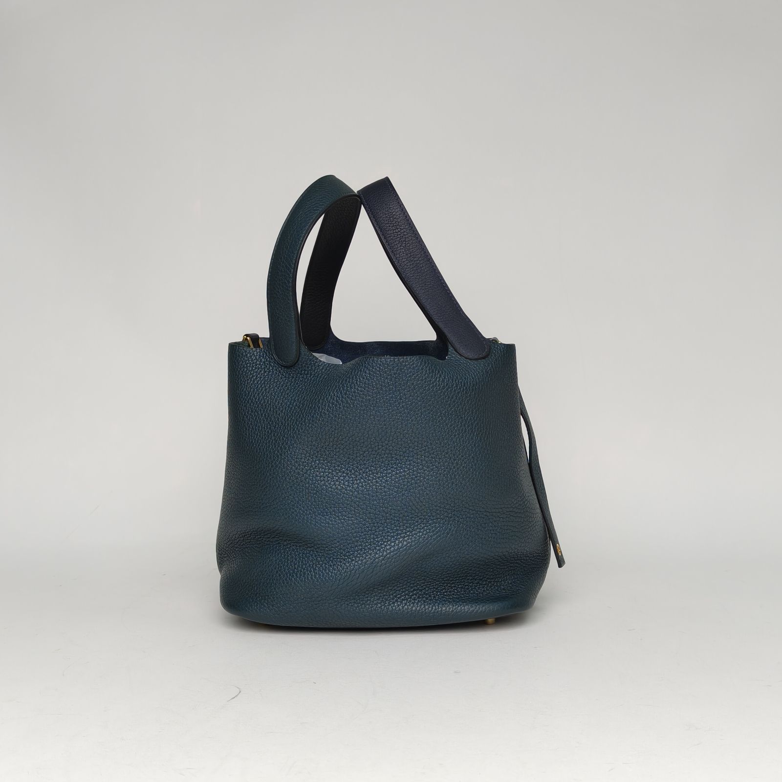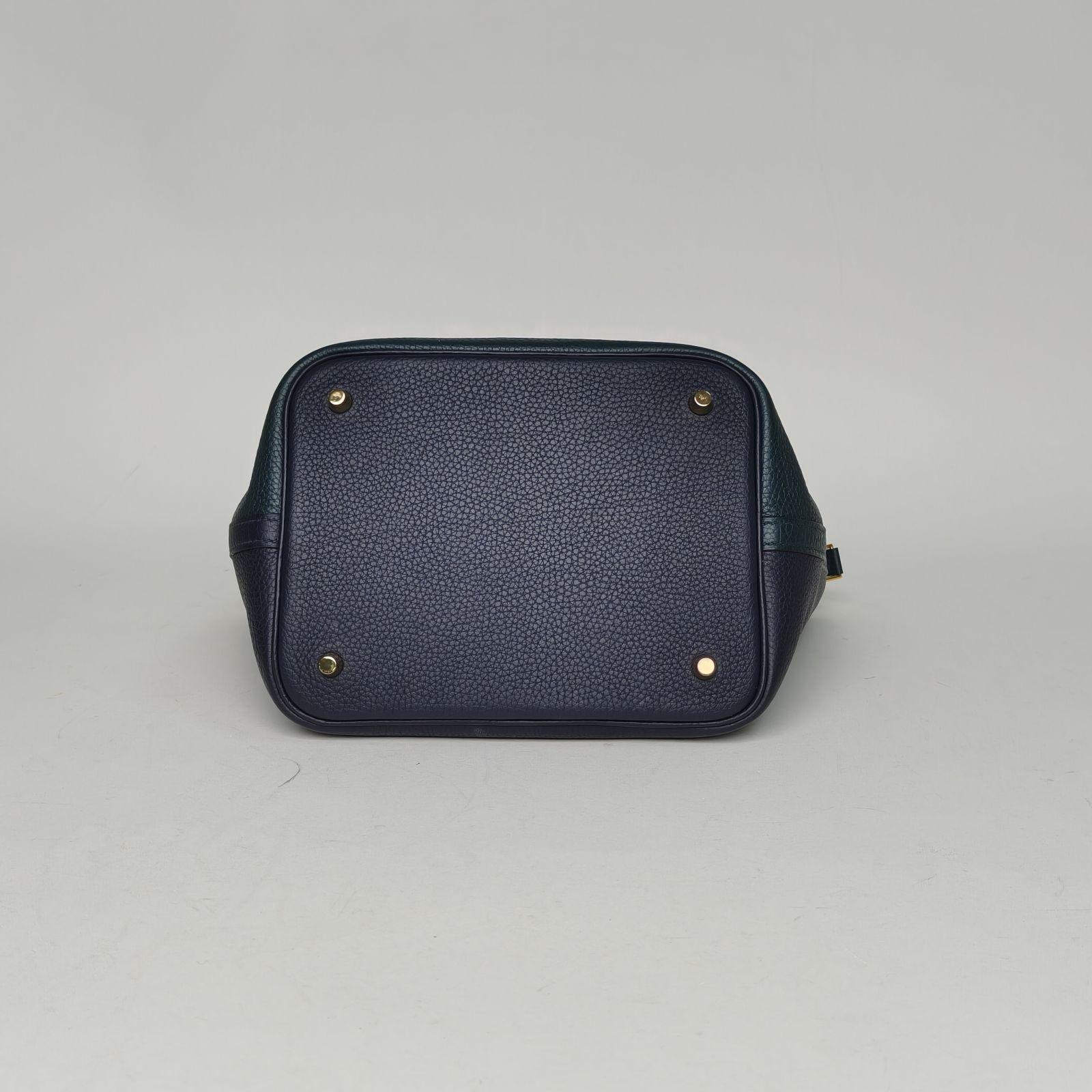 Crafted from black and midnight blue Tourillon Clemence leather, this Picotin 22 bucket bag features a minimalist design and top handles, perfect for daily luxury.