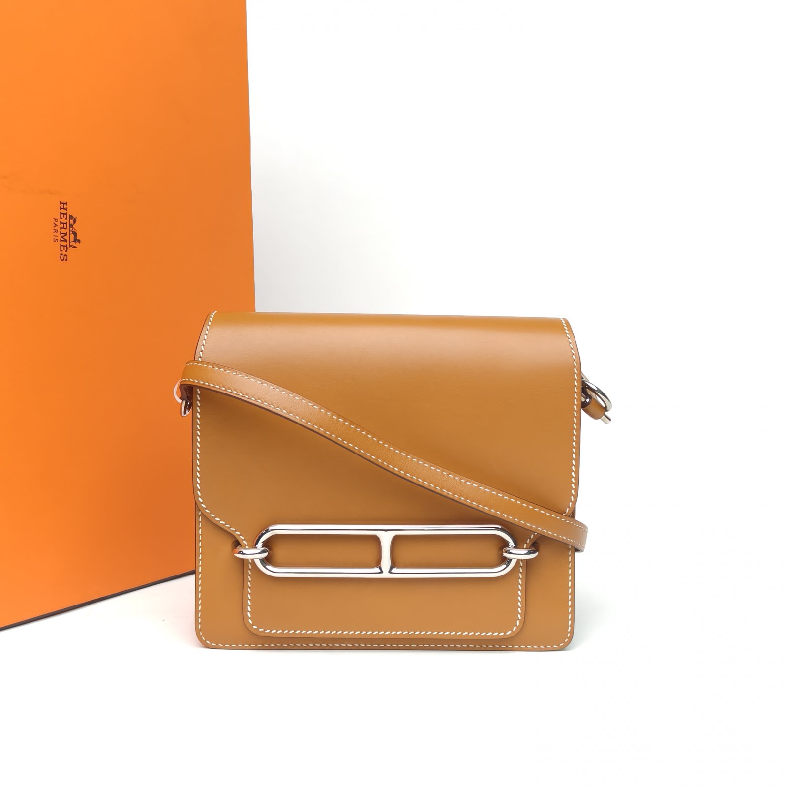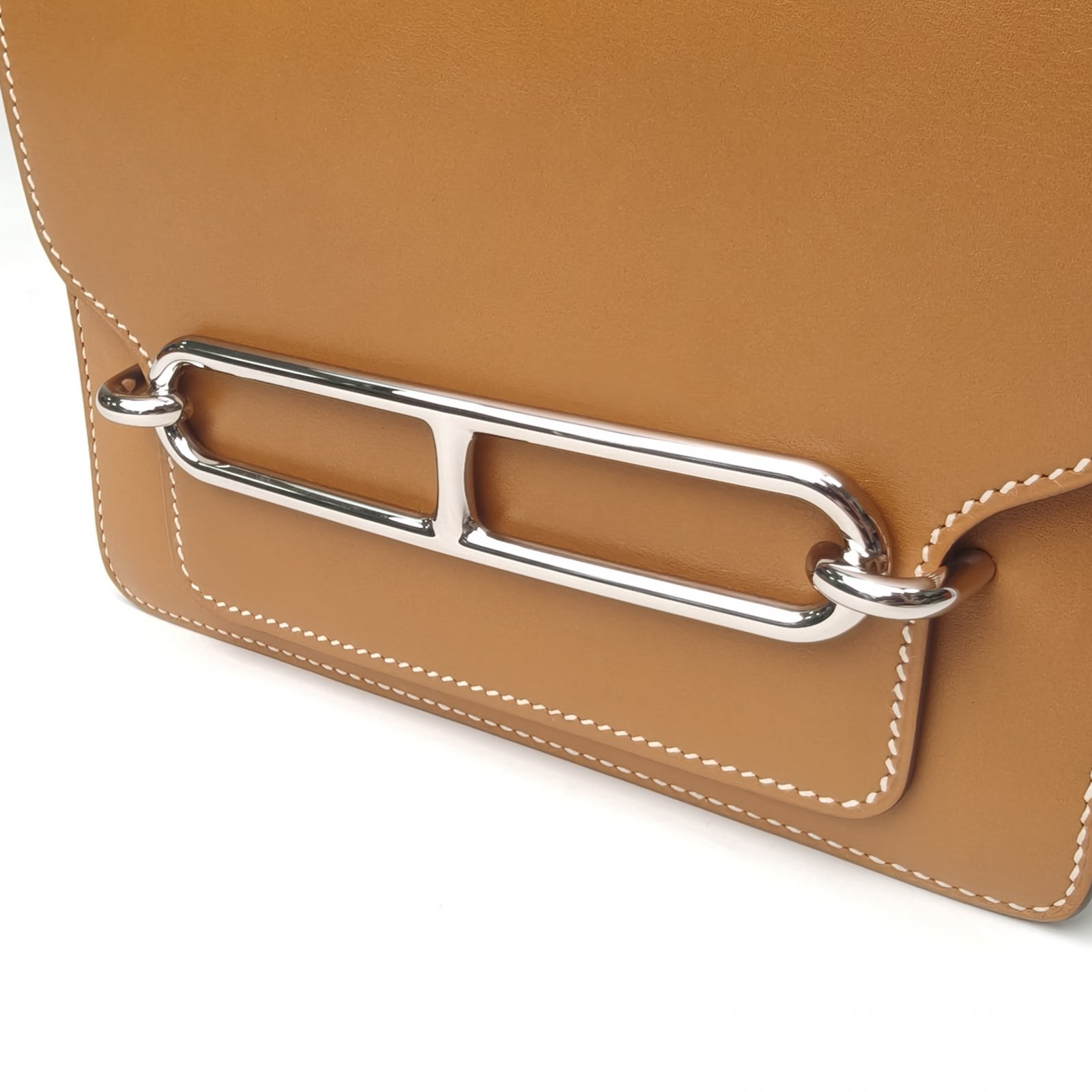 Crafted from tan Butler leather with signature Roulis buckle, this crossbody bag features a compact shape and adjustable strap, embodying modern Hermes minimalism.