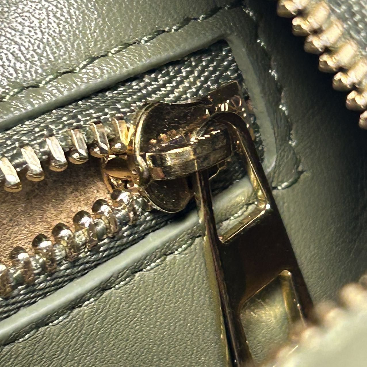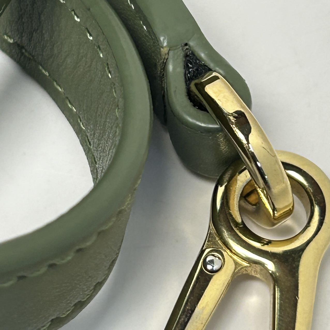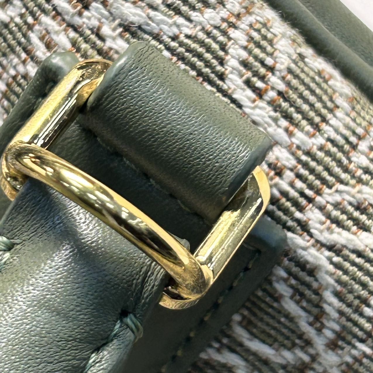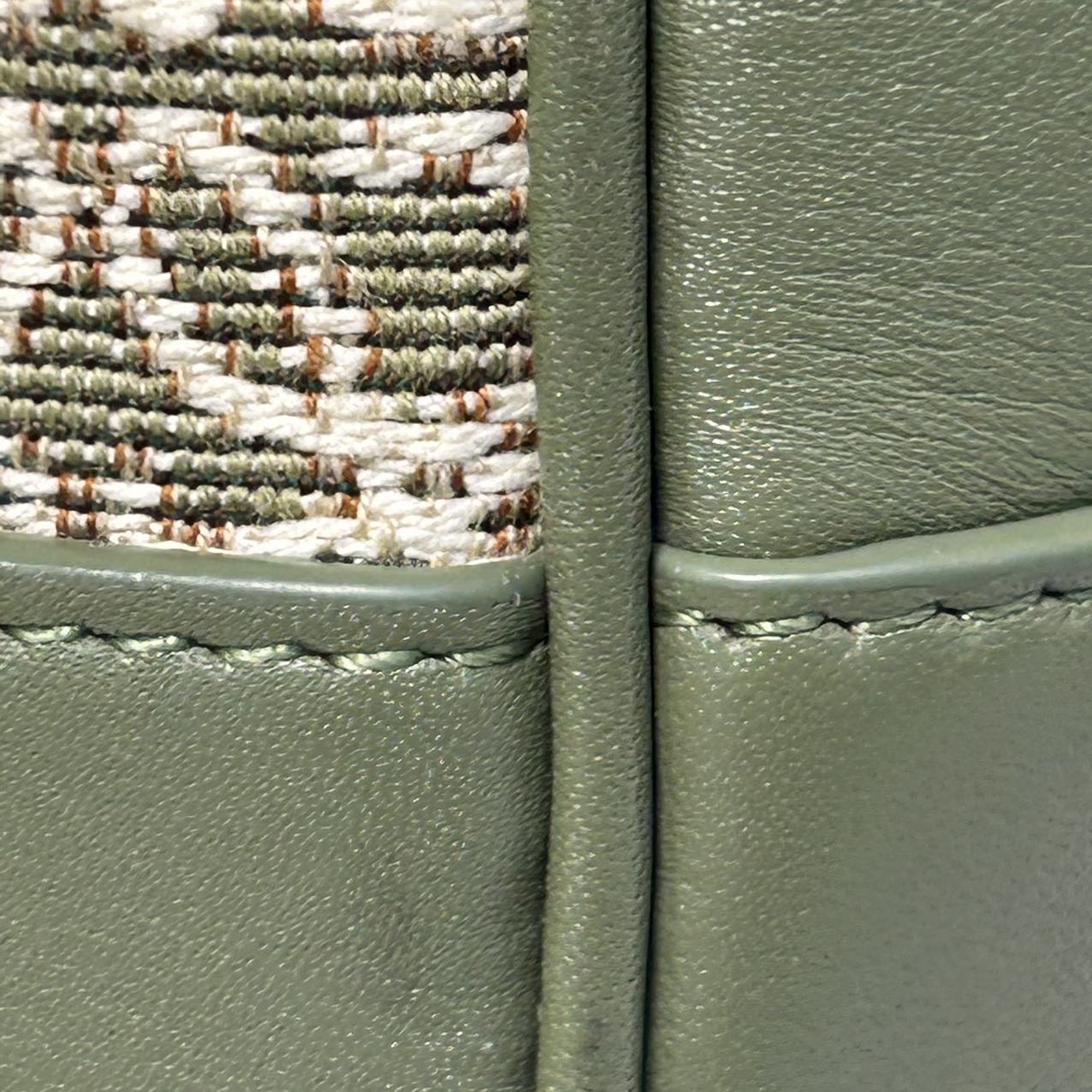 This iconic Amazona 23 bag is crafted from green leather and canvas with Anagram logo, featuring a top handle and detachable strap.