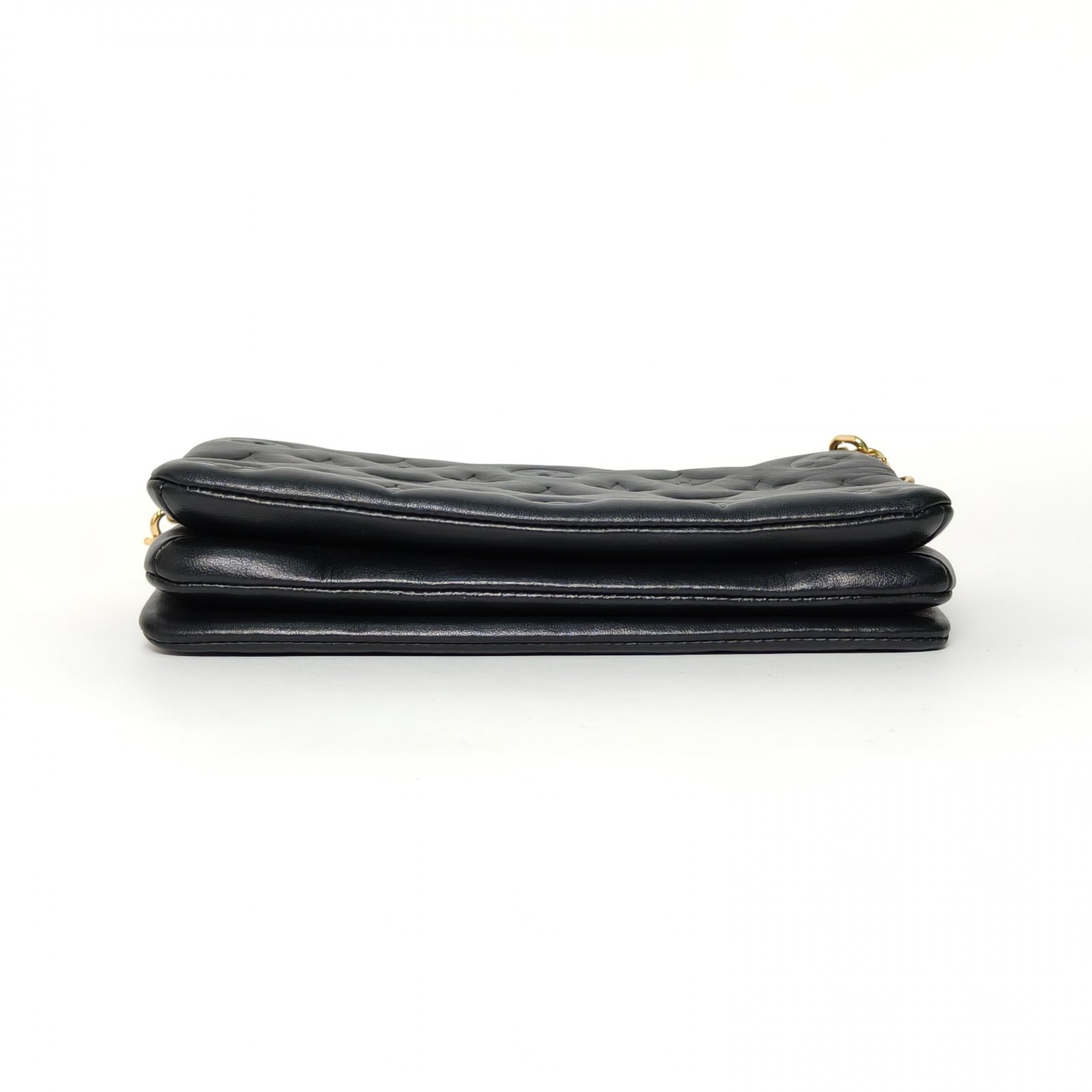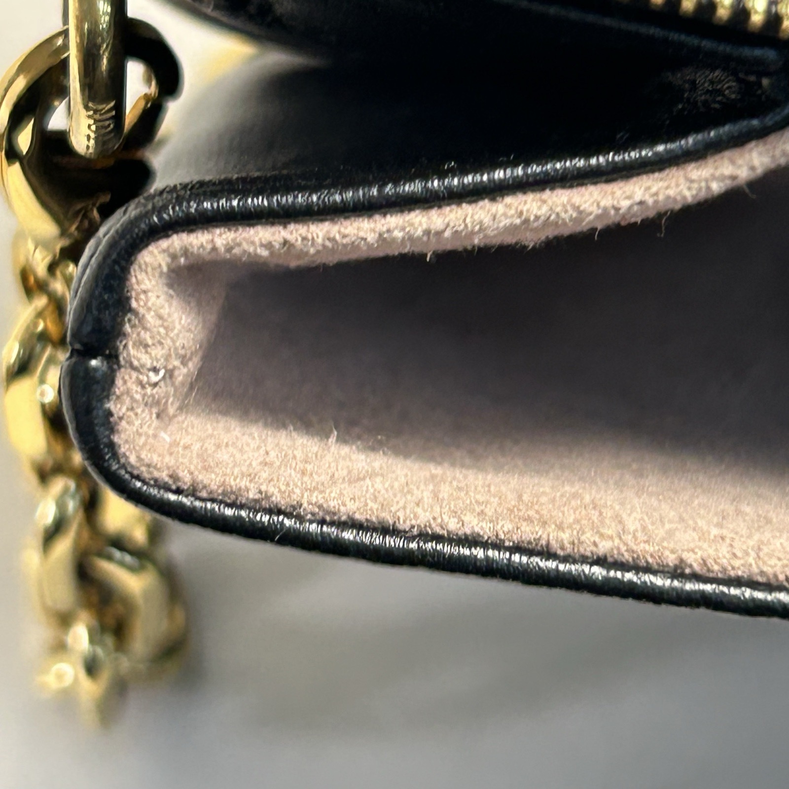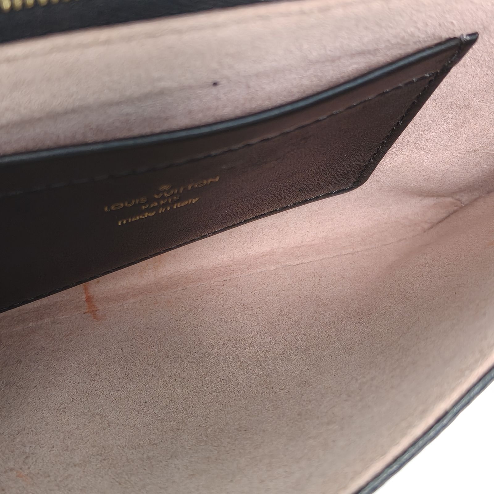 Crafted from black embossed monogram leather with polished gold-tone hardware, this compact Pochette features a chunky chain strap and a sleek, structured silhouette that elevates any outfit.