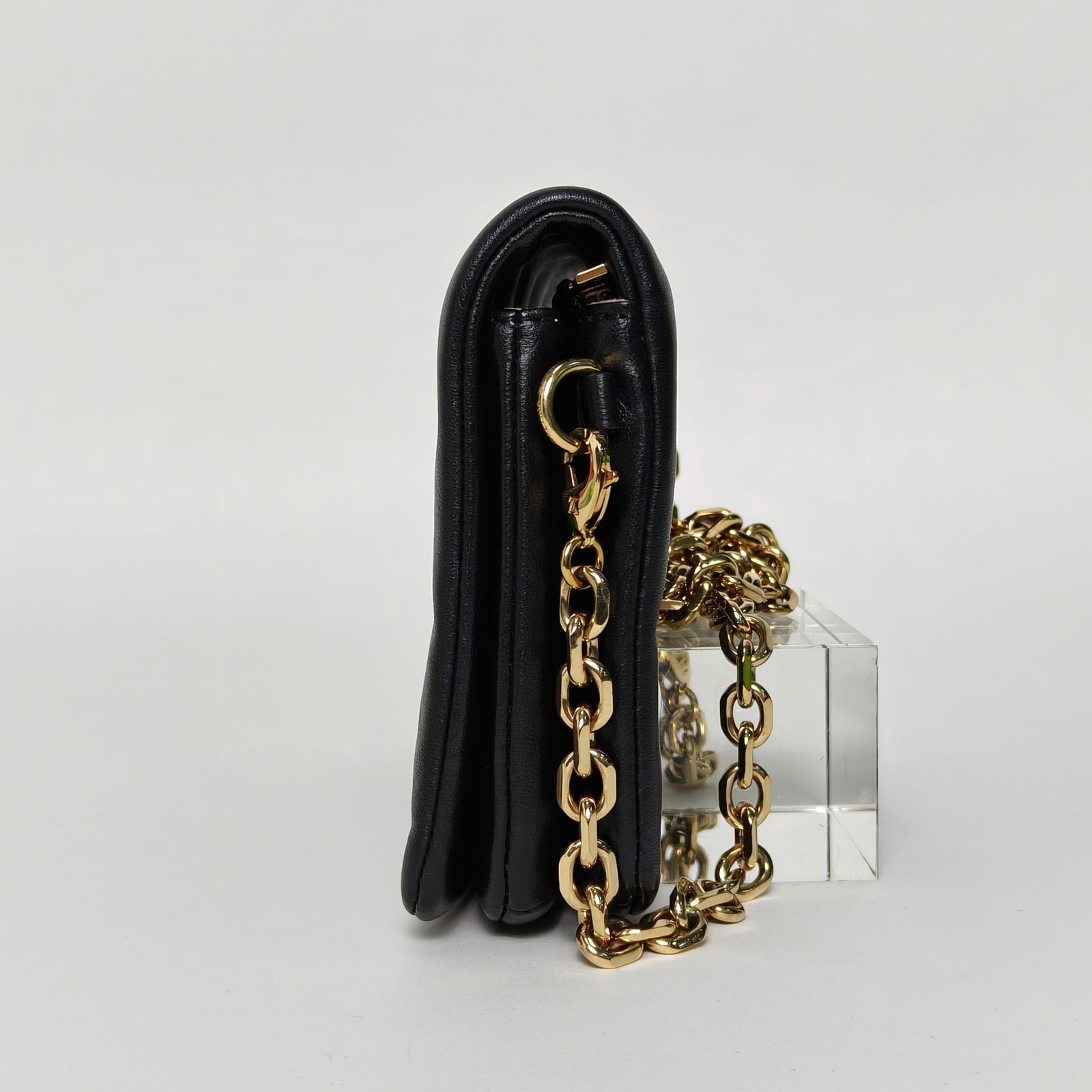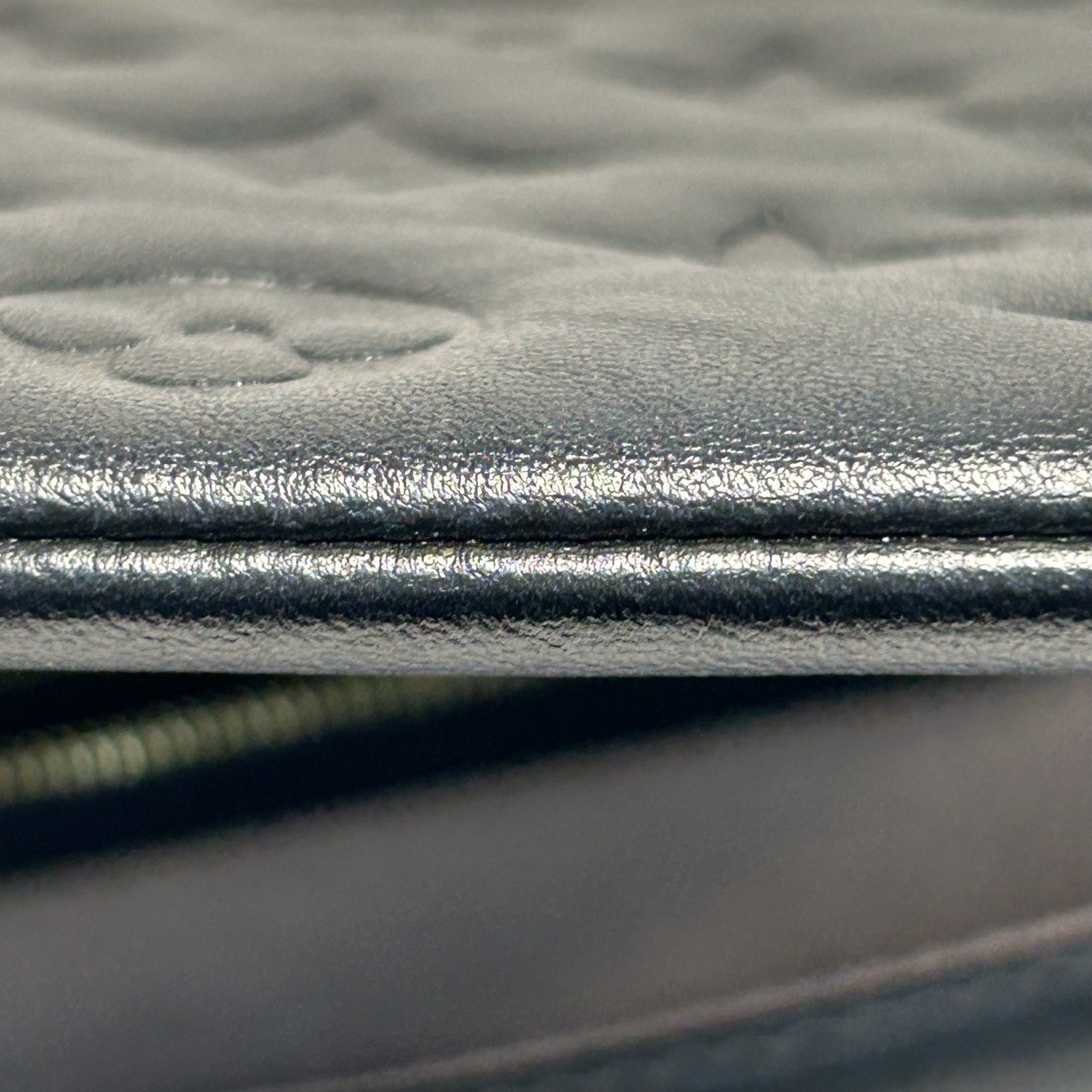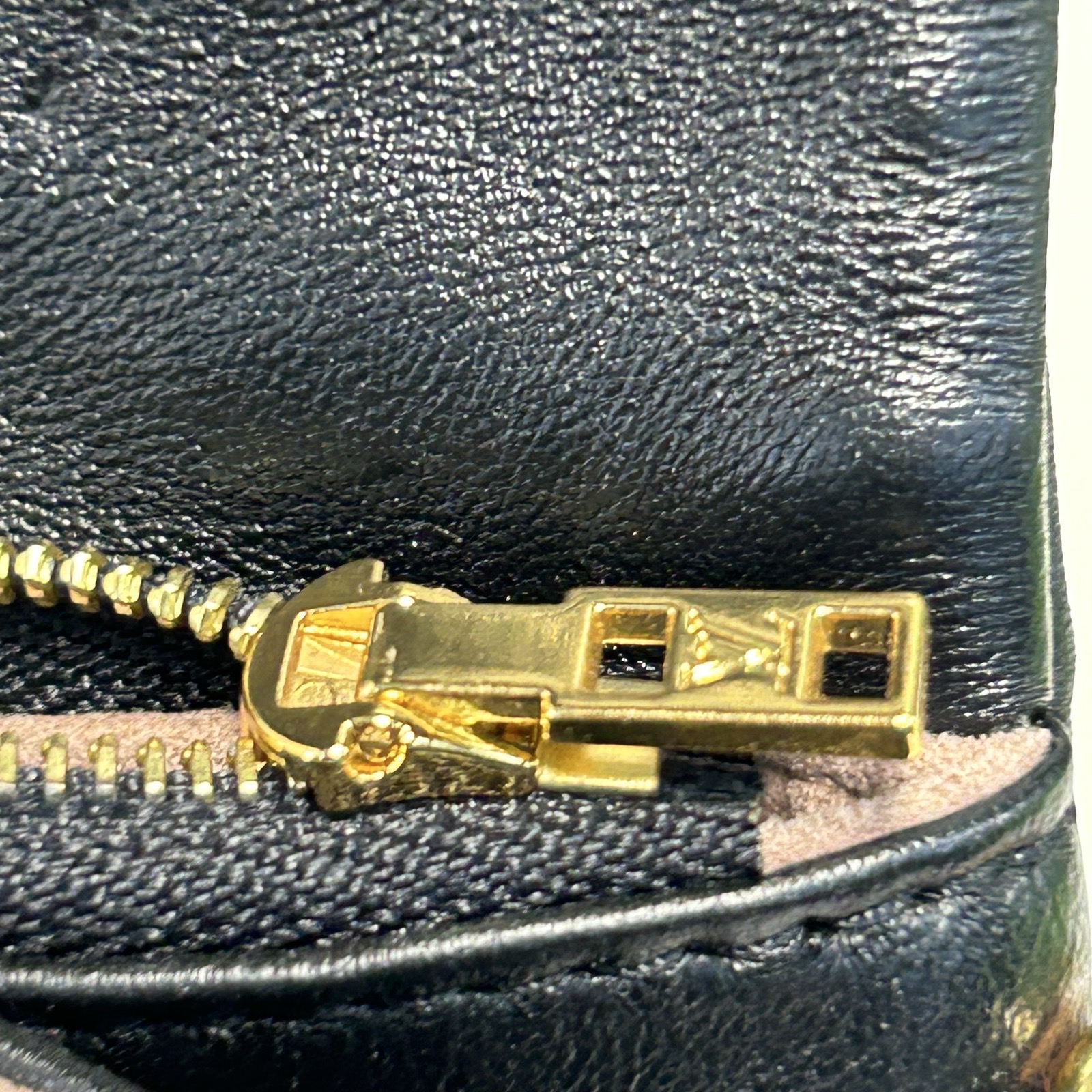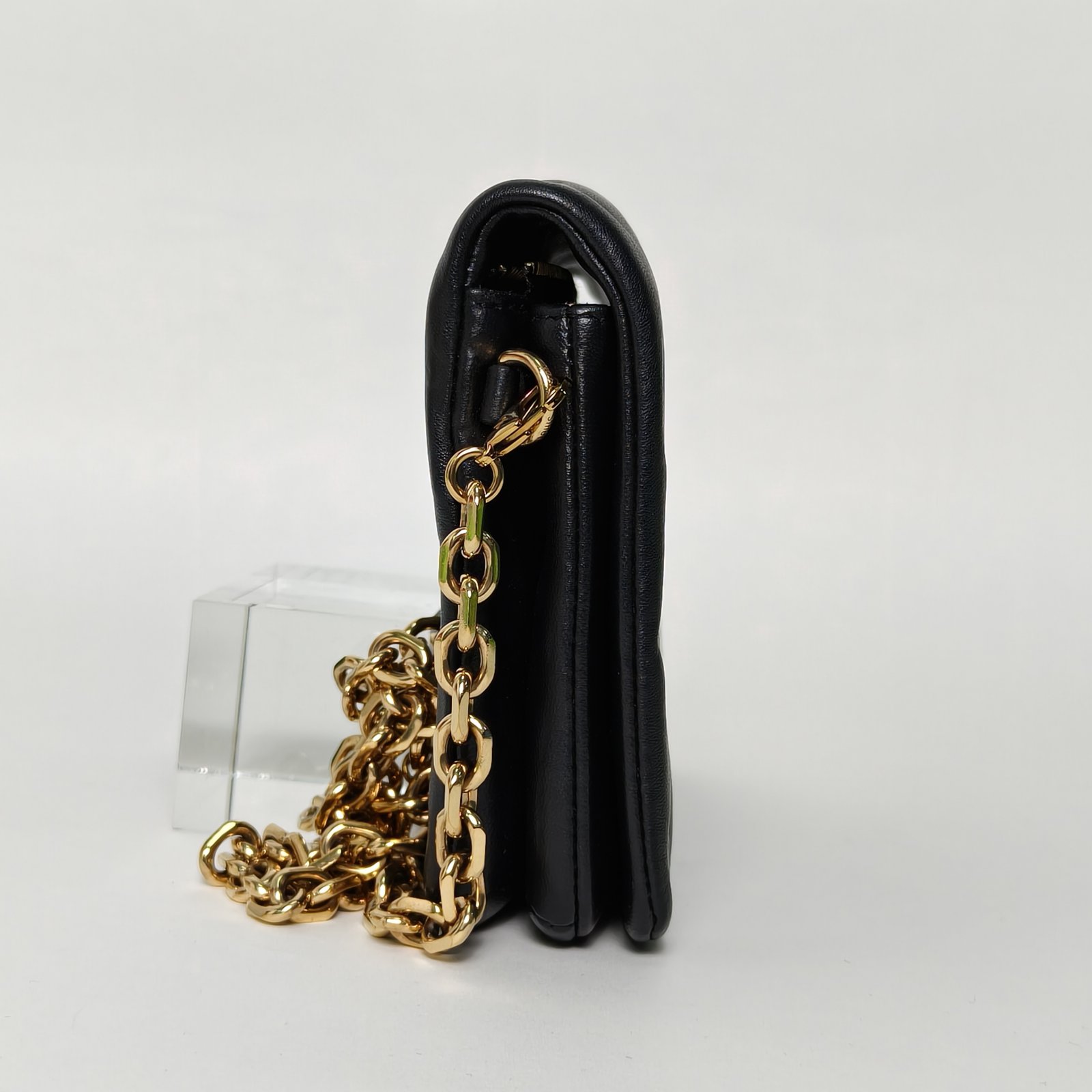 Crafted from black embossed monogram leather with polished gold-tone hardware, this compact Pochette features a chunky chain strap and a sleek, structured silhouette that elevates any outfit.