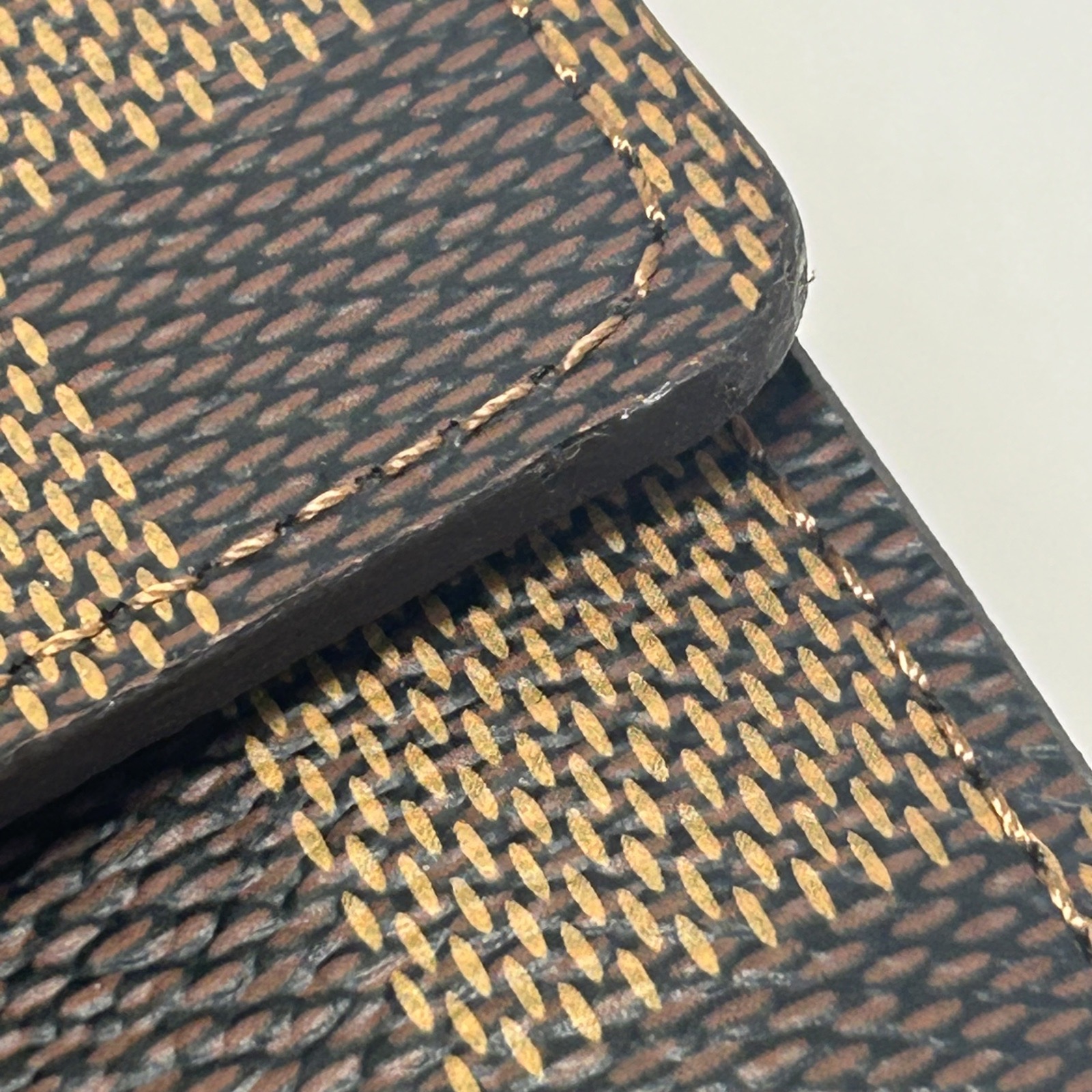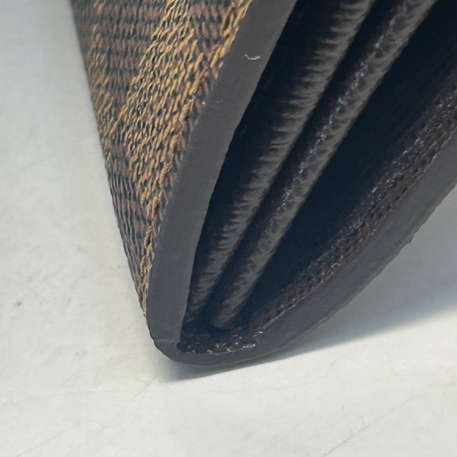 Crafted from Damier Ebene PVC with leather trim, this bifold wallet features multiple card slots and compartments, perfect for daily card and cash storage.