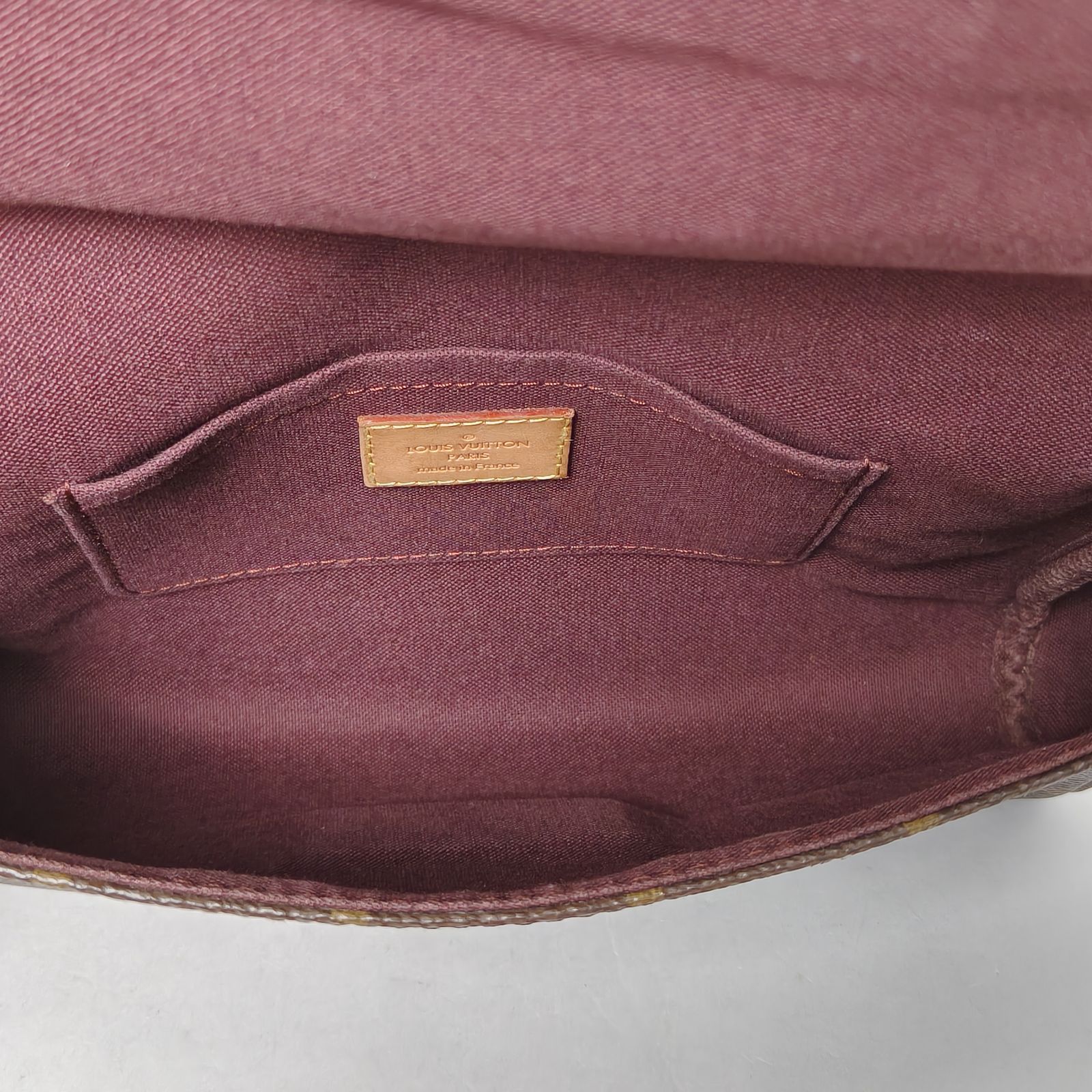 Crafted from monogram PVC with leather trim, this Favorite MM clutch features a detachable strap, a versatile LV classic for everyday carry.