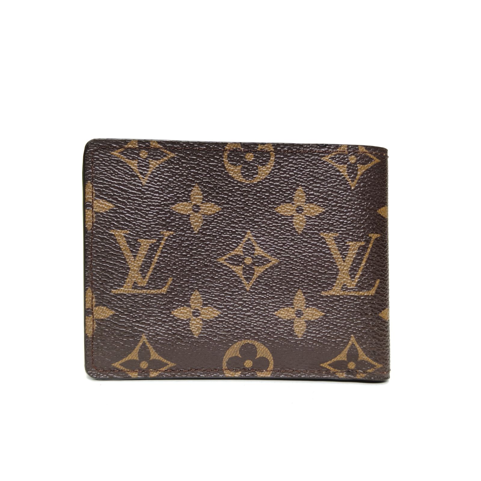 This Louis Vuitton monogram bifold wallet is made of brown PVC with the iconic LV monogram pattern, featuring a slim silhouette for card and cash storage.