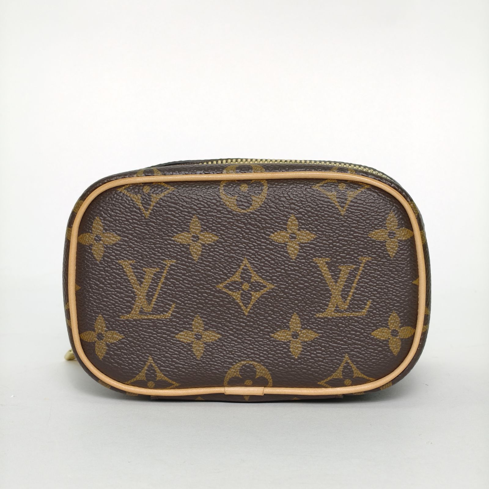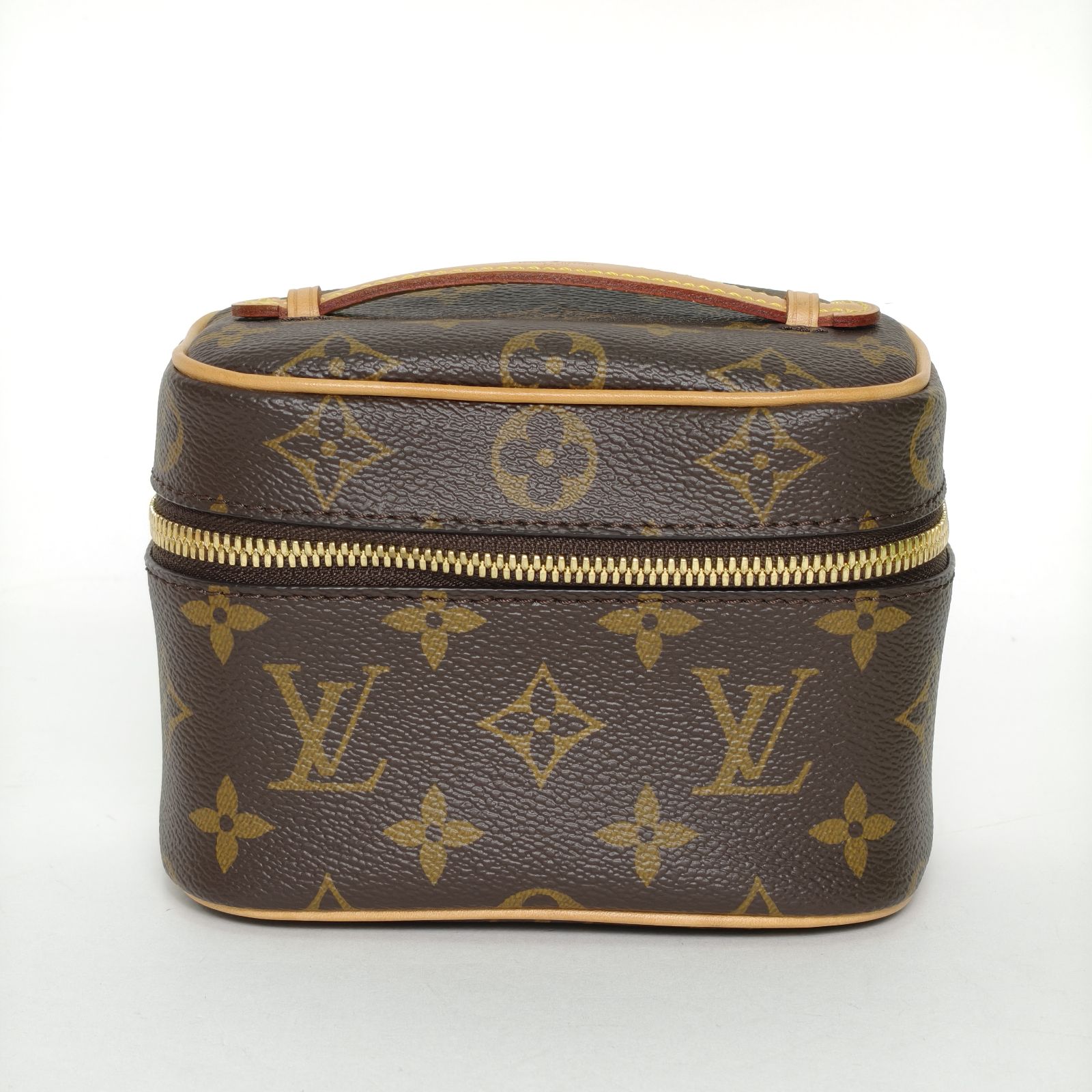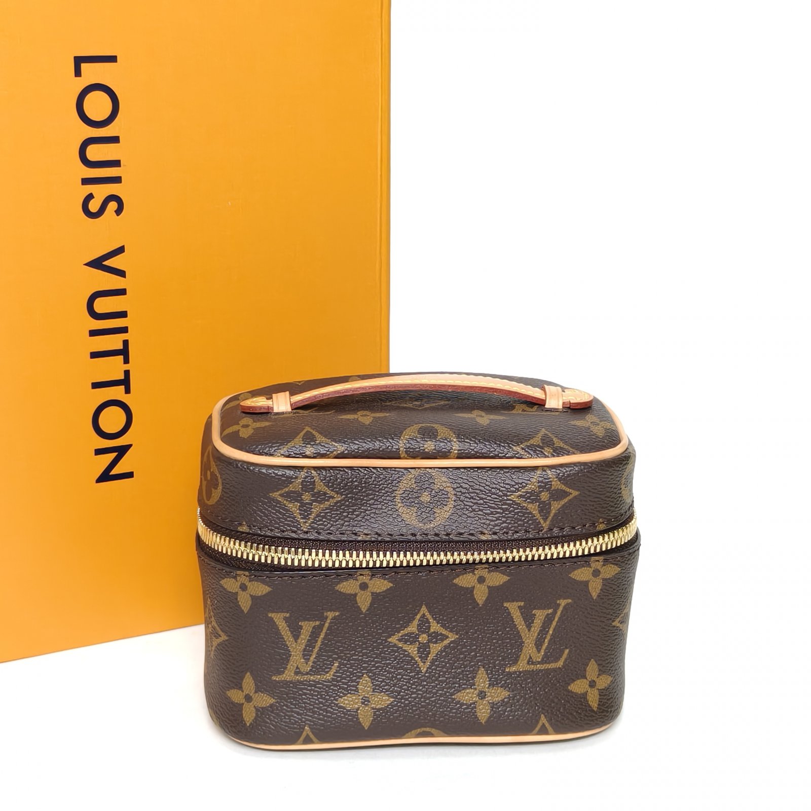 This Louis Vuitton Nice Nano vanity case is made of monogram PVC with leather trim, featuring a compact boxy silhouette.