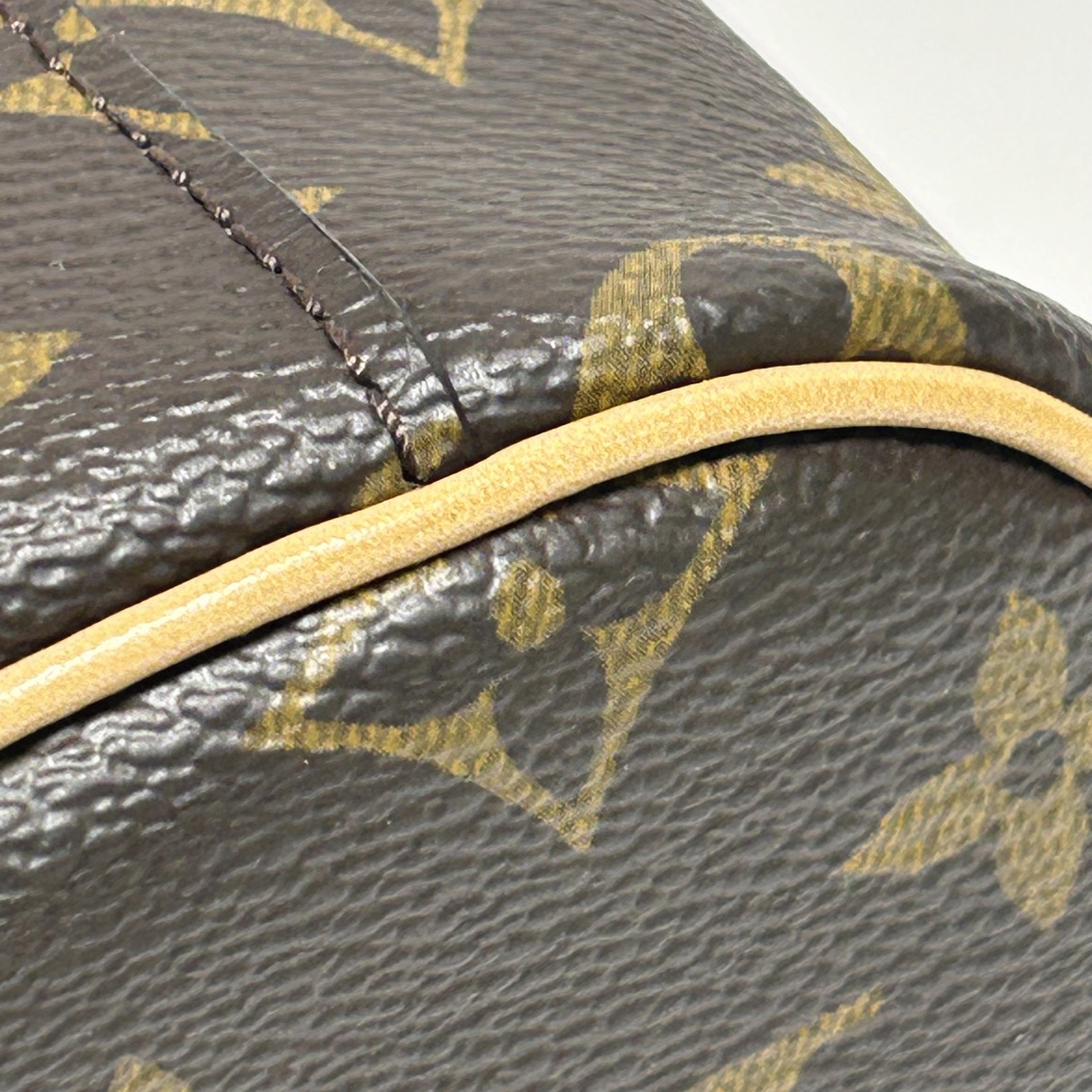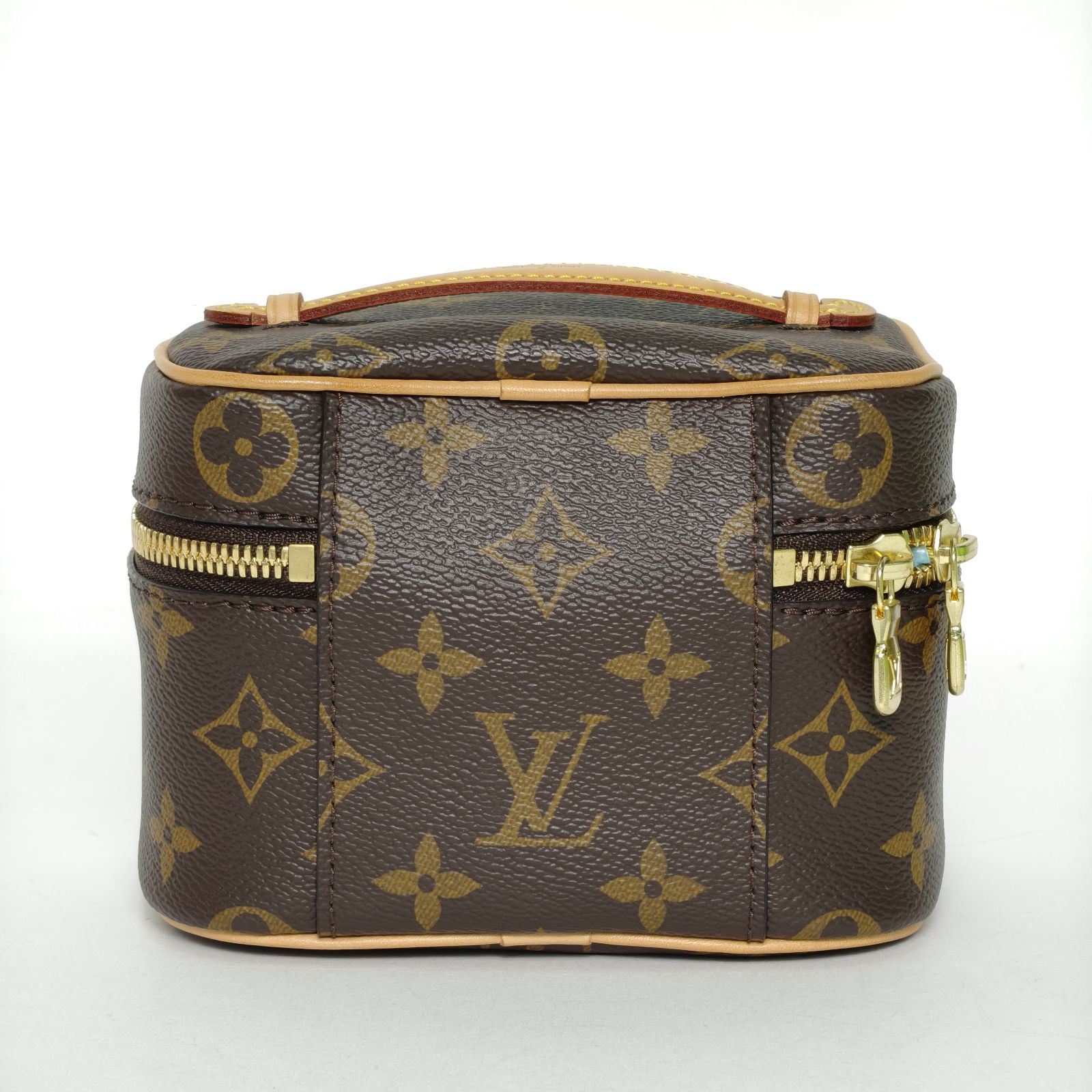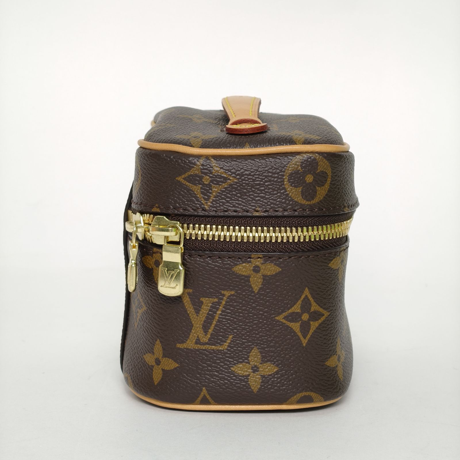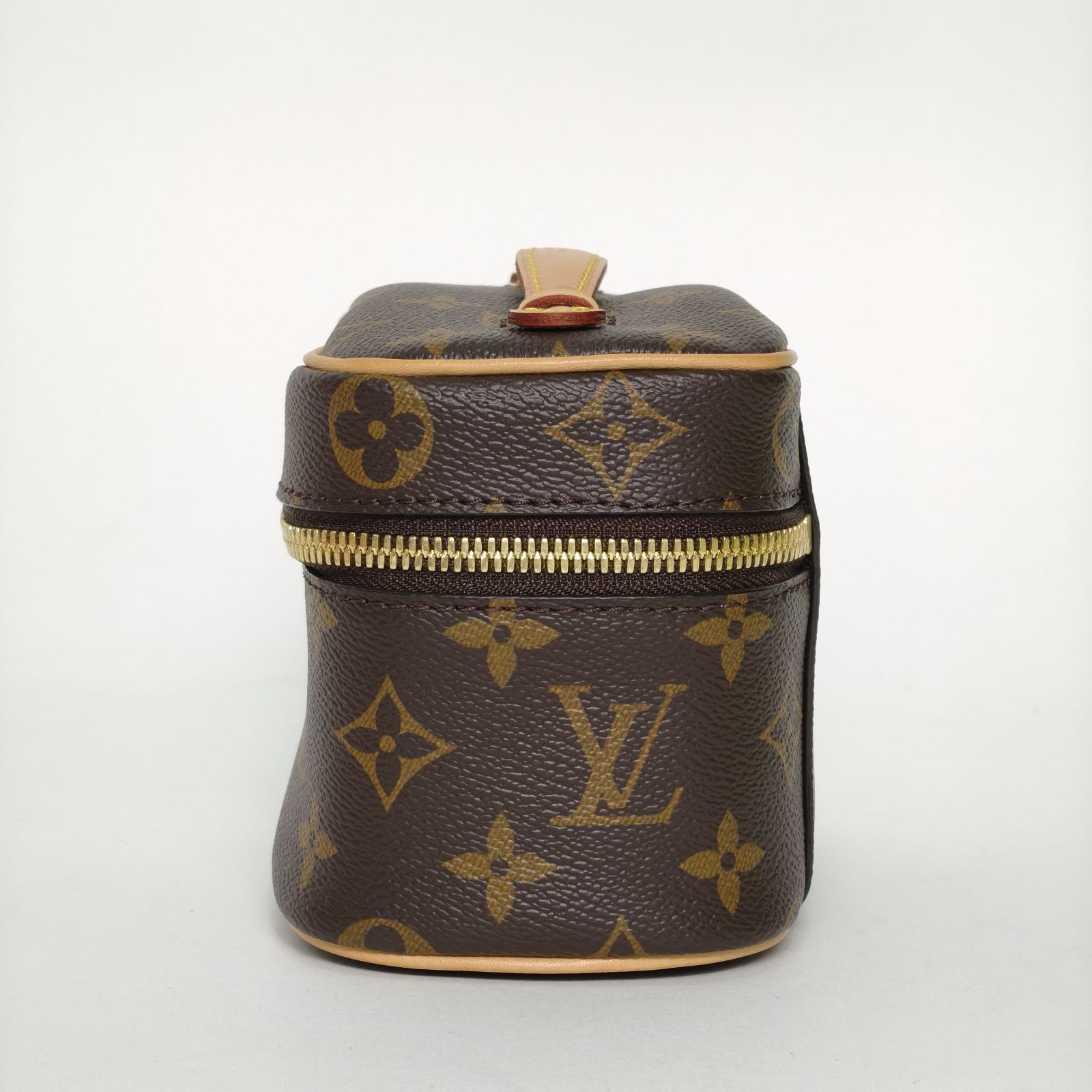 This Louis Vuitton Nice Nano vanity case is made of monogram PVC with leather trim, featuring a compact boxy silhouette.
