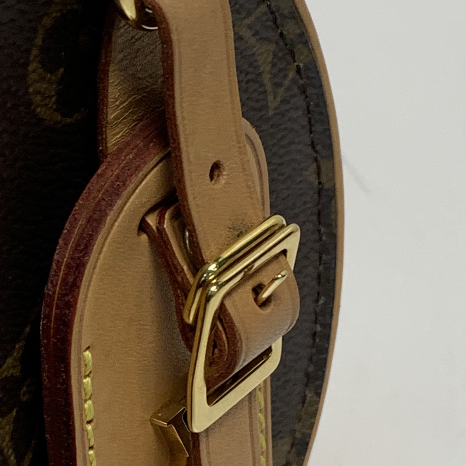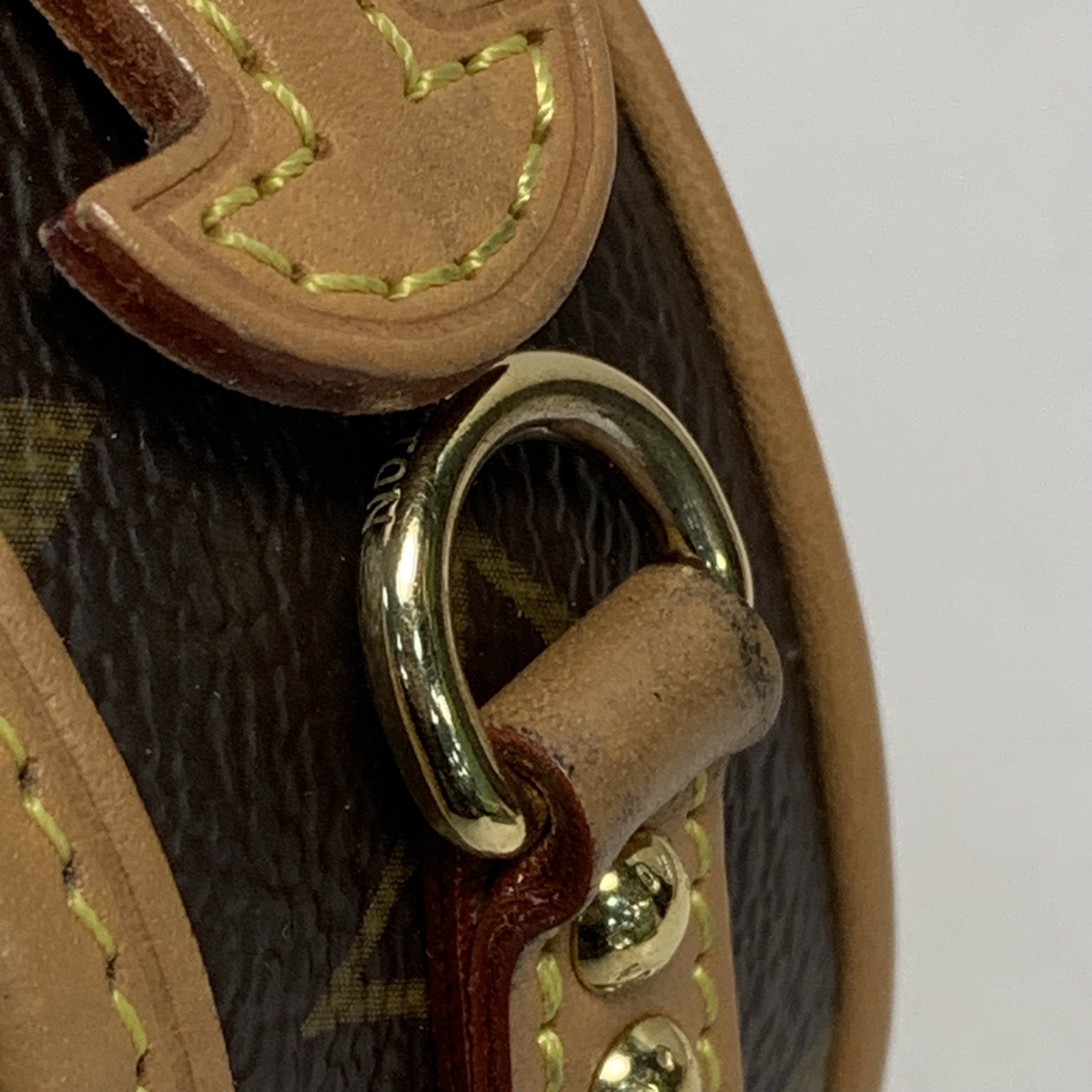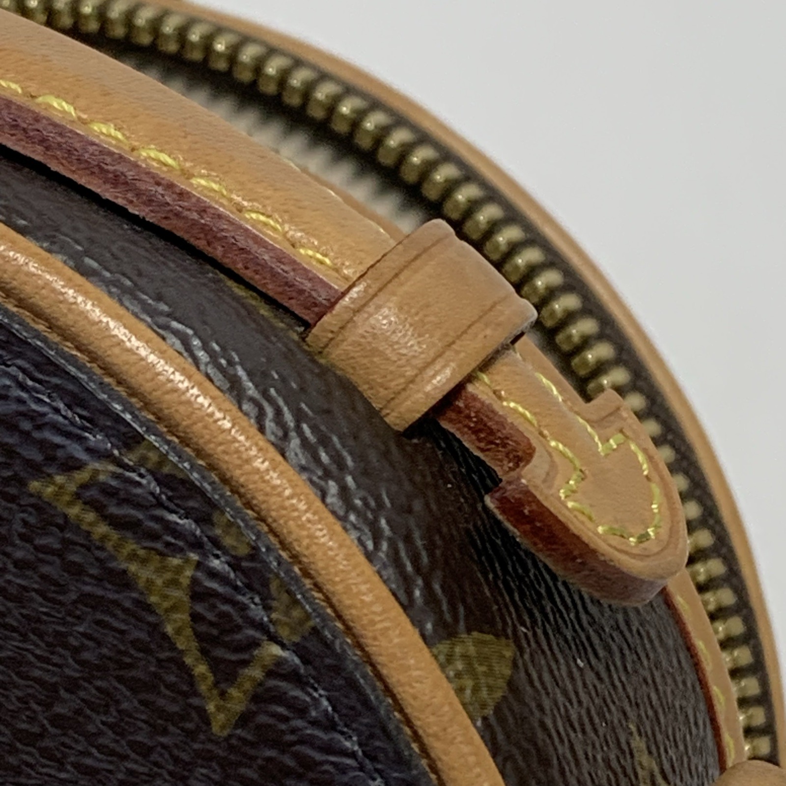Crafted from monogram PVC with leather trim, this mini hat box bag features a circular shape and detachable shoulder strap, blending vintage charm with modern style.