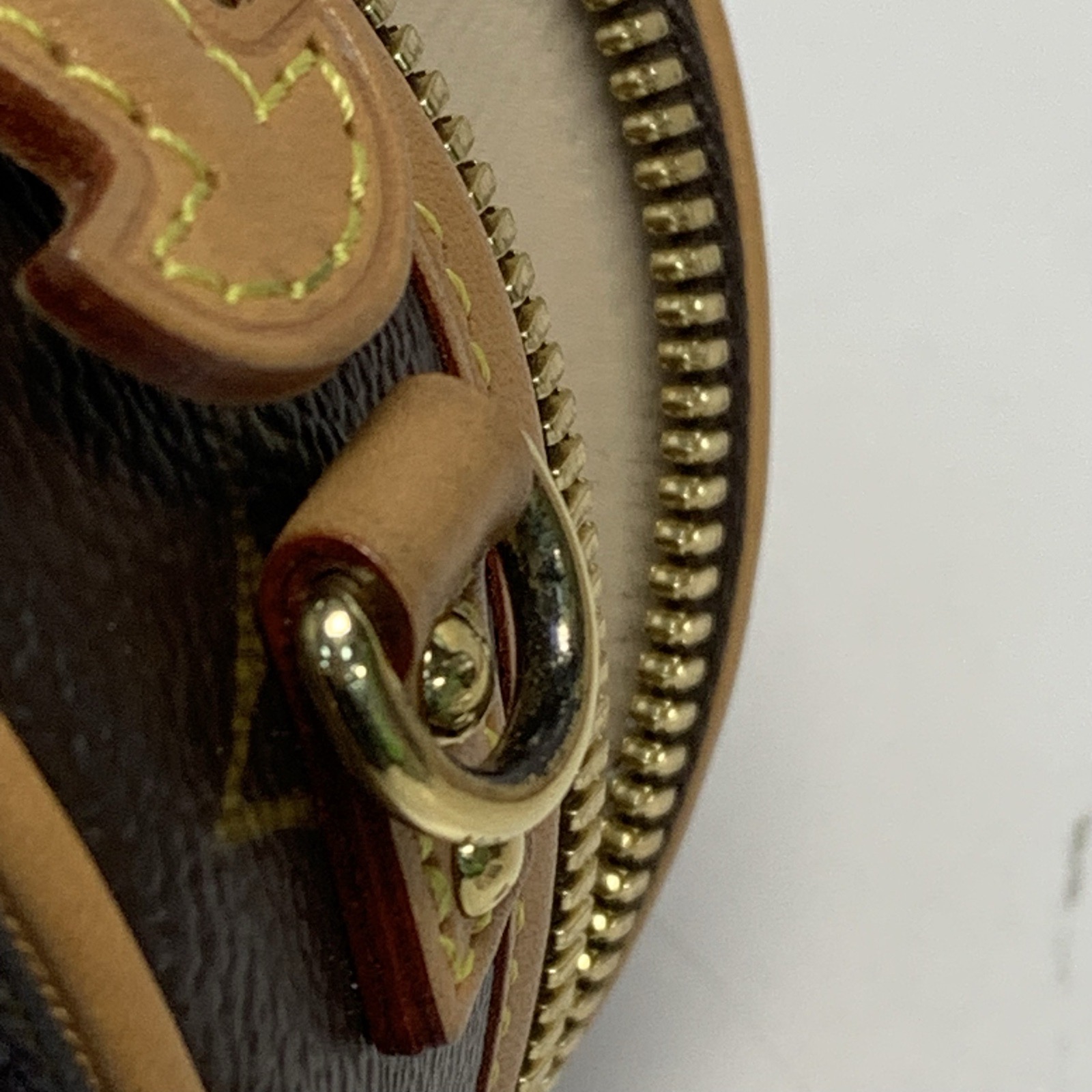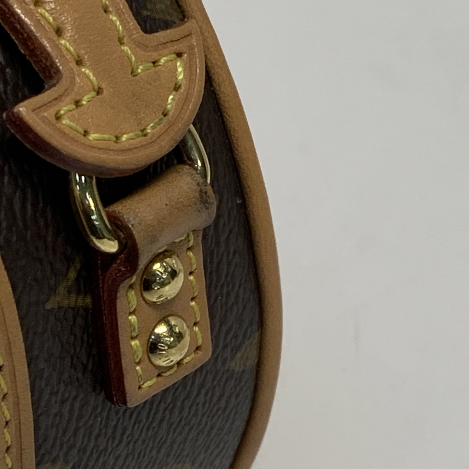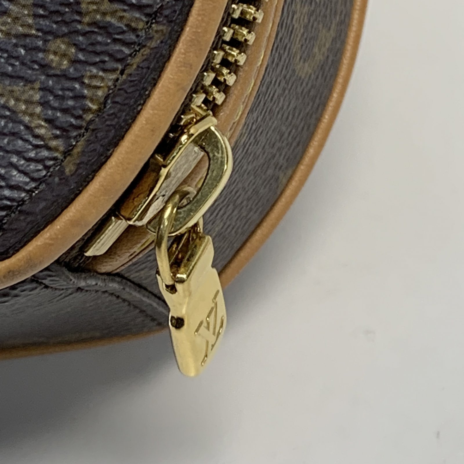 Crafted from monogram PVC with leather trim, this mini hat box bag features a circular shape and detachable shoulder strap, blending vintage charm with modern style.